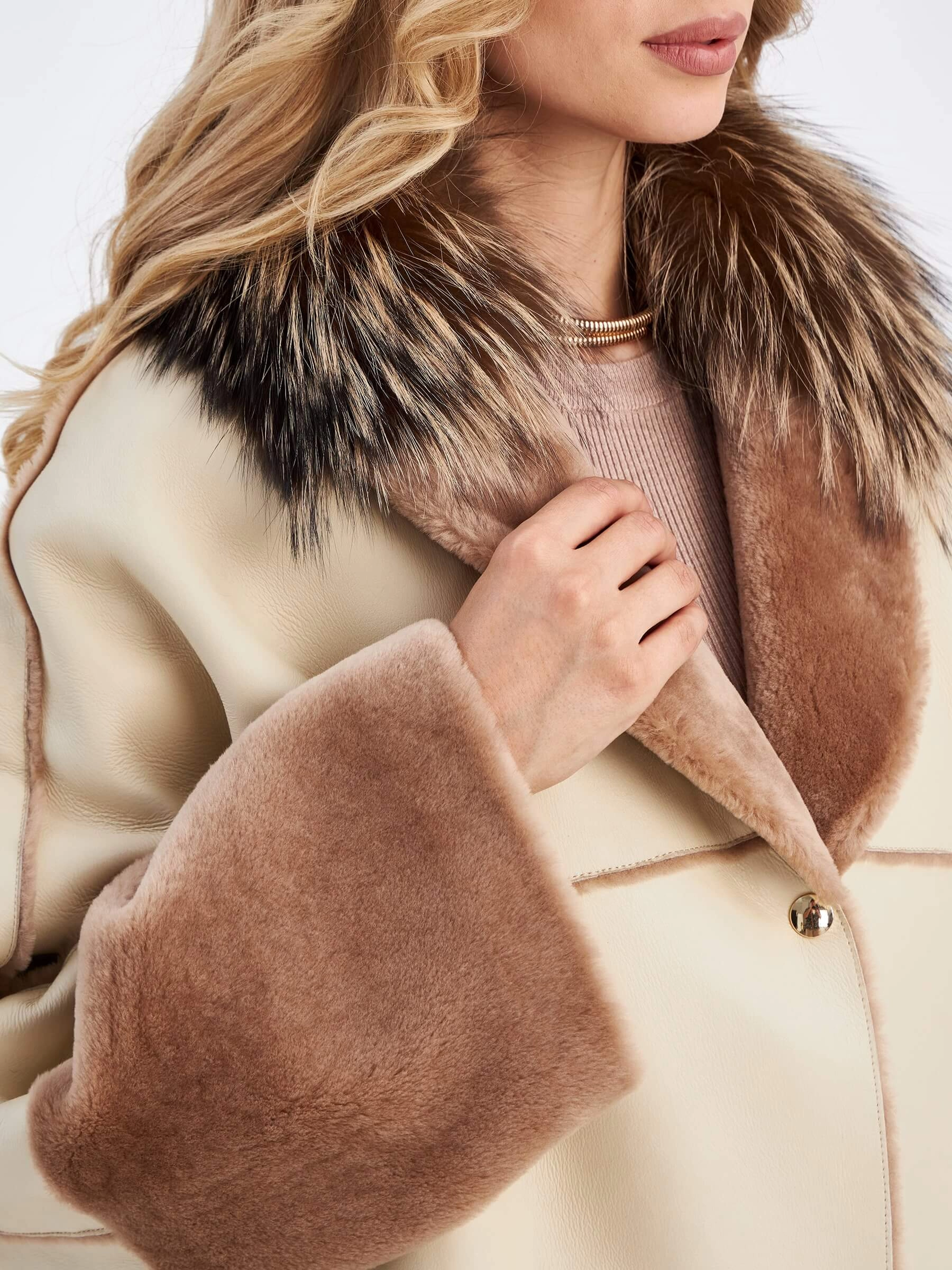 Для создания дубленки свободного кроя, использовали мягкую овчину с коротким бархатистым ворсом с одной стороны и гладкой поверхностью с другой. Внутренняя сторона хорошо сохраняет тепло. Графичность вещи добавляет отделка изнаночных швов в коричневом цвете. Шалевидный воротник подчеркнули мехом лисицы.