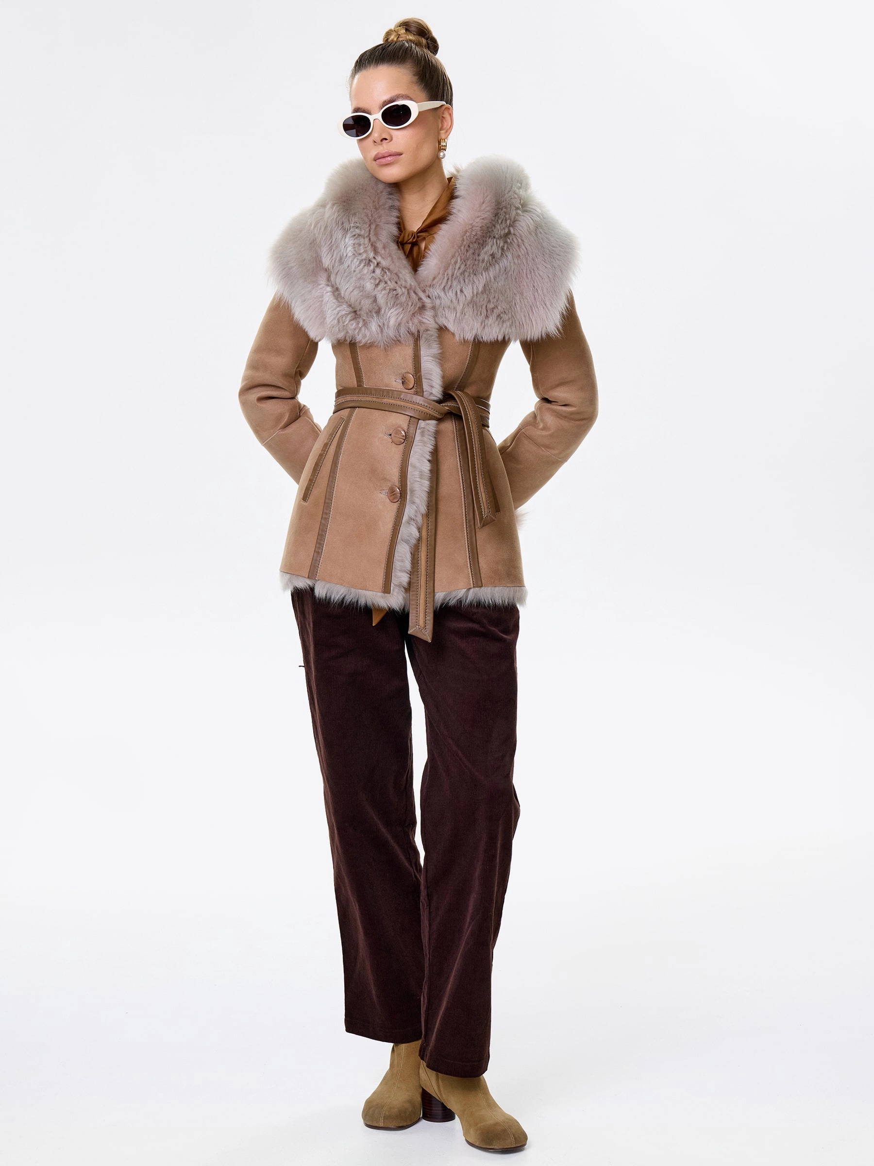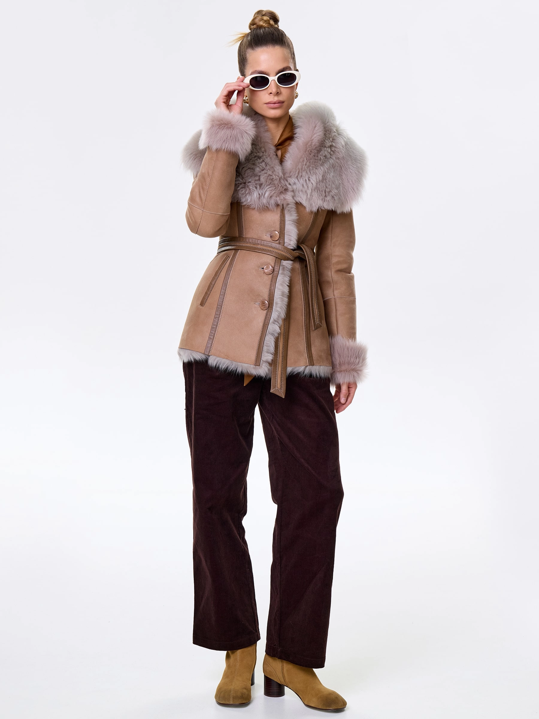 Идеальная полуприлегающая модель премиум-класса: невероятно густой мех тосканской овчины согреет в лютый мороз, а глубокий капюшон-трансформер эффектно завернёт вас в уют или элегантно ляжет шалью на плечи. Защитное покрытие убережёт от царапин, кожаная отделка карманов и борта добавит статусности, а регулируемые манжеты и боковые карманы обеспечат комфорт. Идеальная посадка по фигуре, продуманные швы и длинный пояс подчеркнут силуэт — сочетайте с джинсами, объёмными свитерами или тёмными платьями для дерзкого зимнего образа! Преимущество: короткая длина, полуприлегающий крой - это мобильность для города и элегантность для вечера.