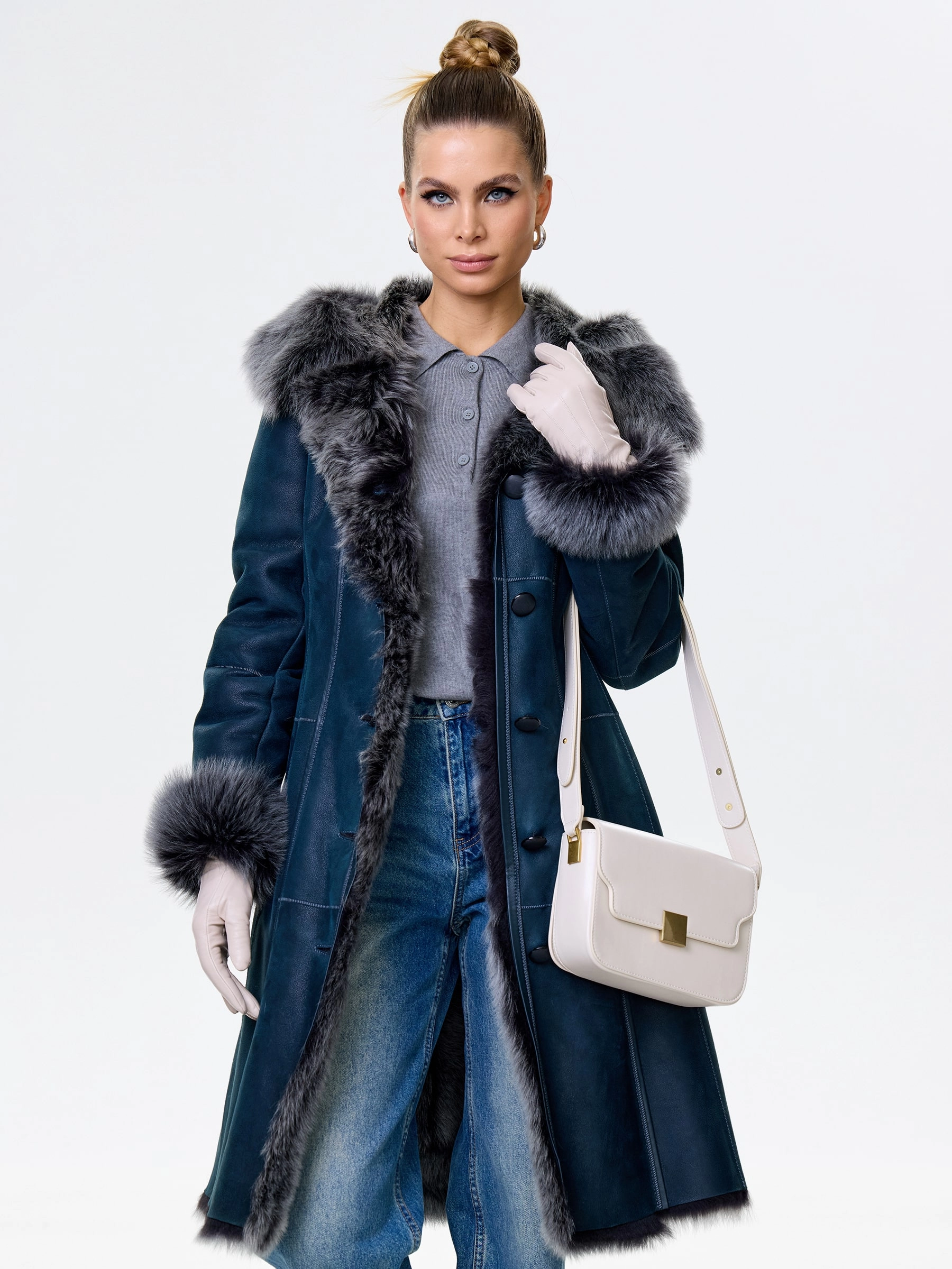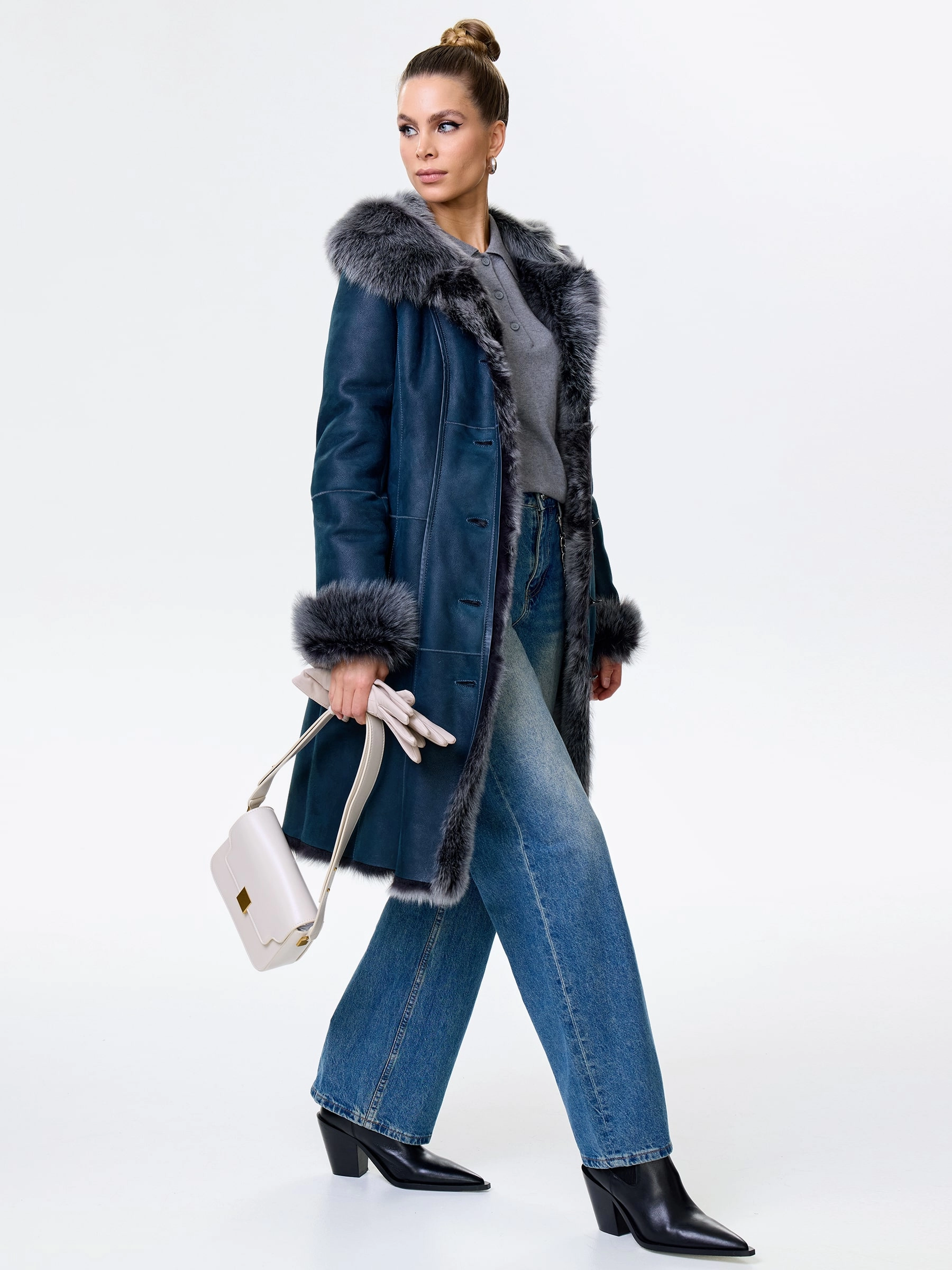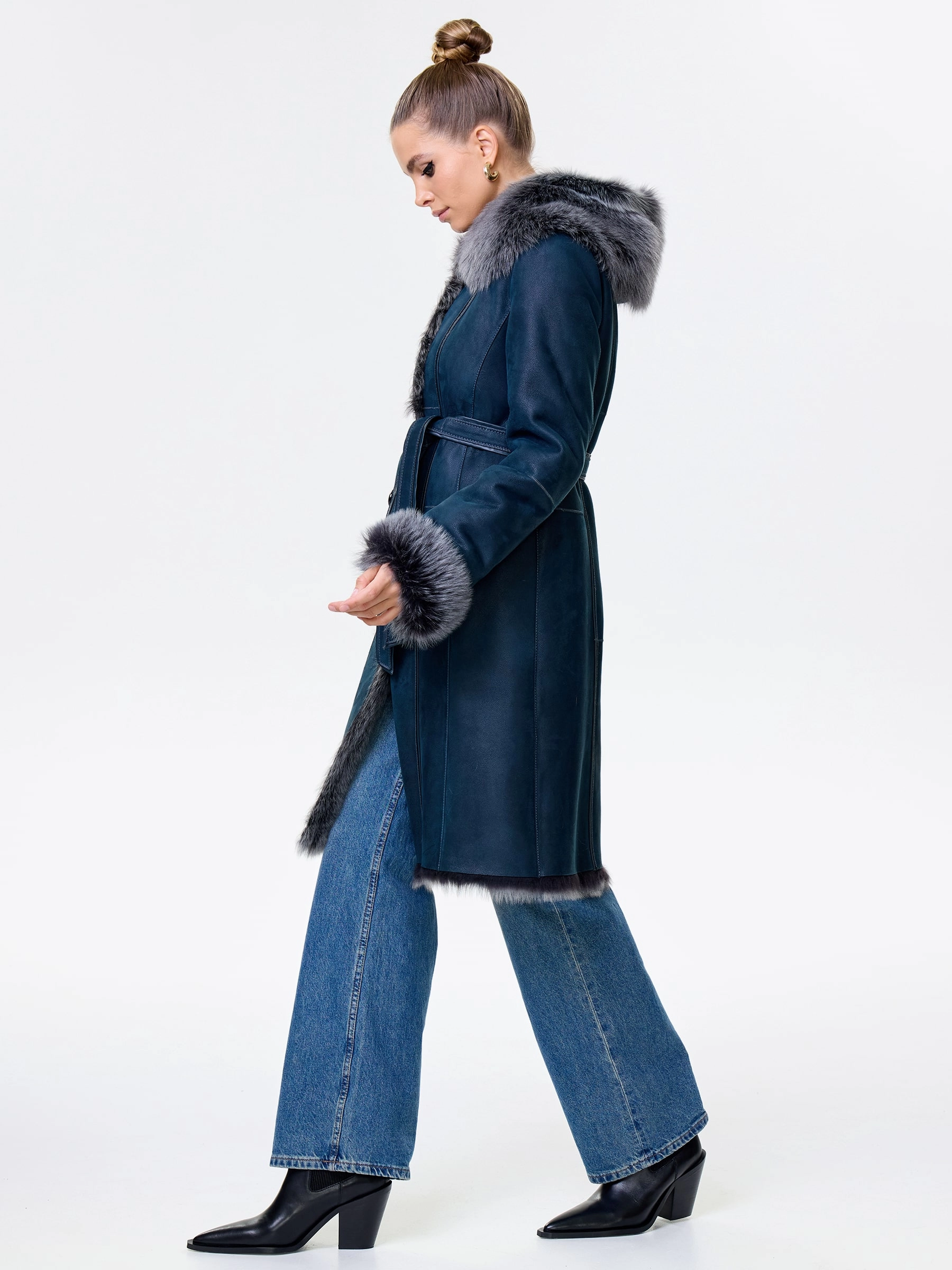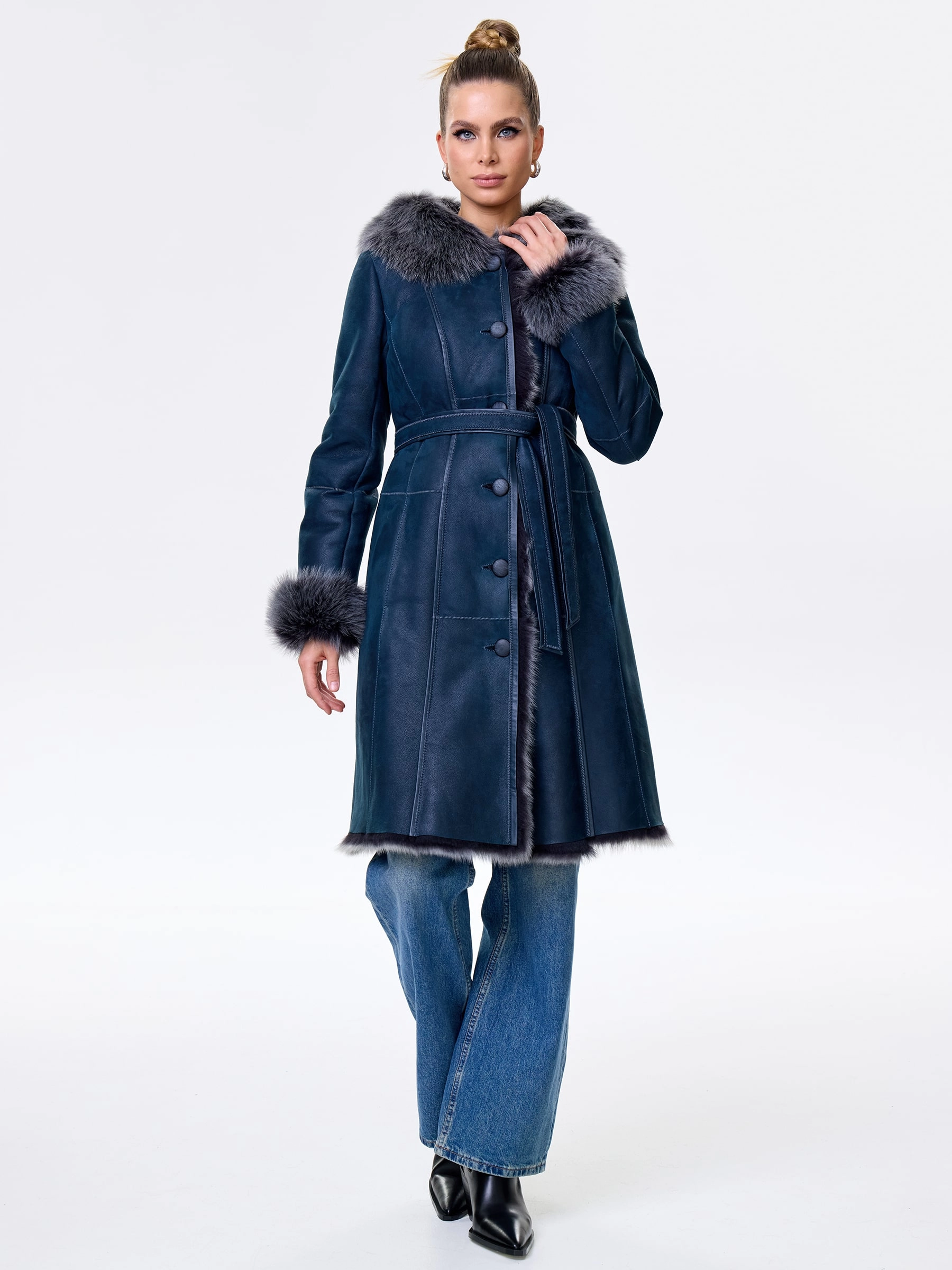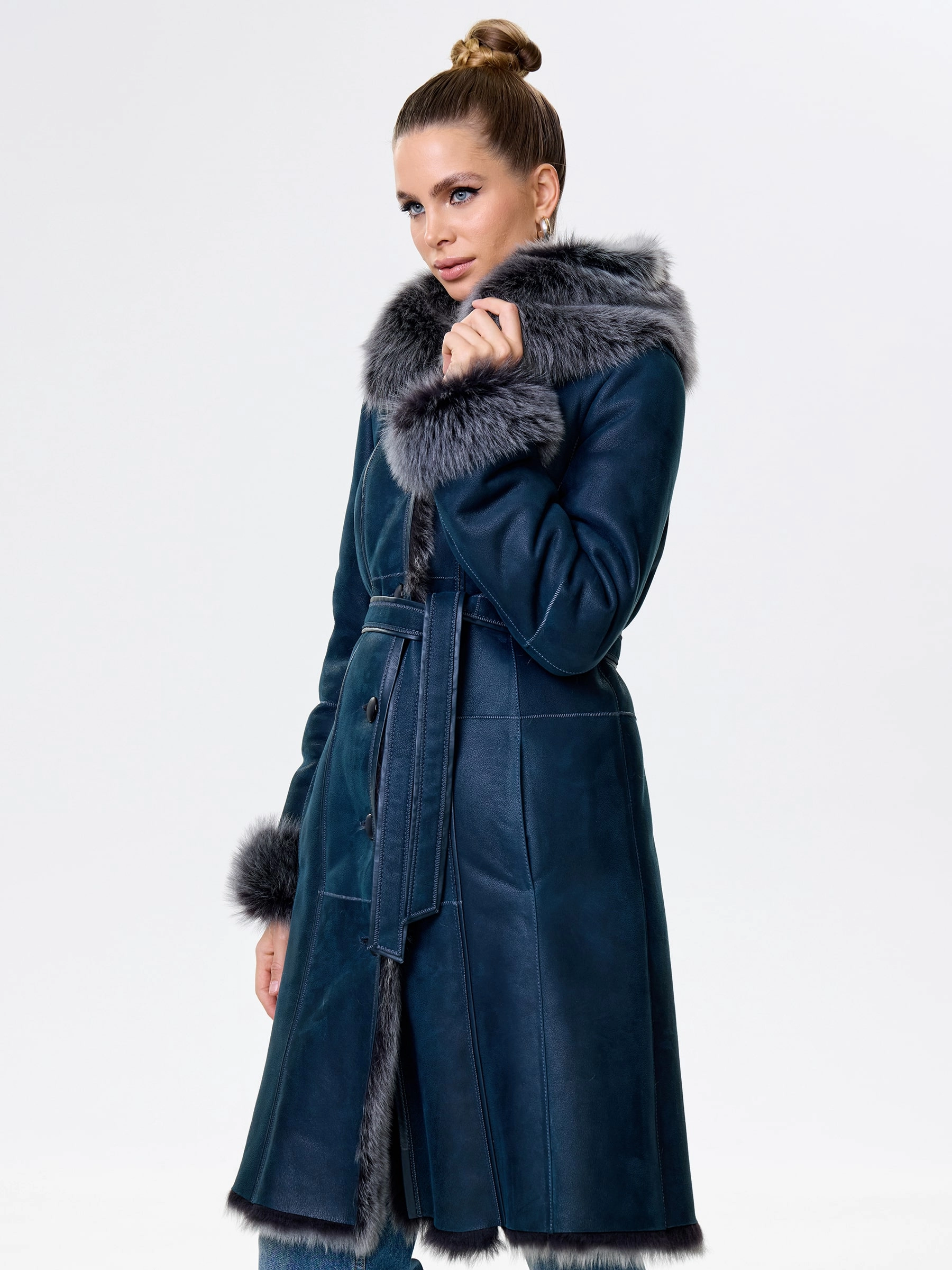 Длинная дублёнка с капюшоном из тосканской овчины. Роскошная полуприлегающая модель премиум-класса: густой нежнейший мех глубокого оттенк подарит королевское тепло даже в лютый мороз, а объёмный капюшон создаст уютный кокон от непогоды или элегантно ниспадет на плечи. Защитное покрытие убережёт от царапин, а идеальная посадка по фигуре, боковые карманы и длинный пояс подчеркнут силуэт — сочетайте с чёрными джинсами, вязаными платьями или кожаными брюками для безупречного зимнего образа! Преимущество: короткая длина, полуприлегающий крой - это мобильность для города и элегантность для вечера.