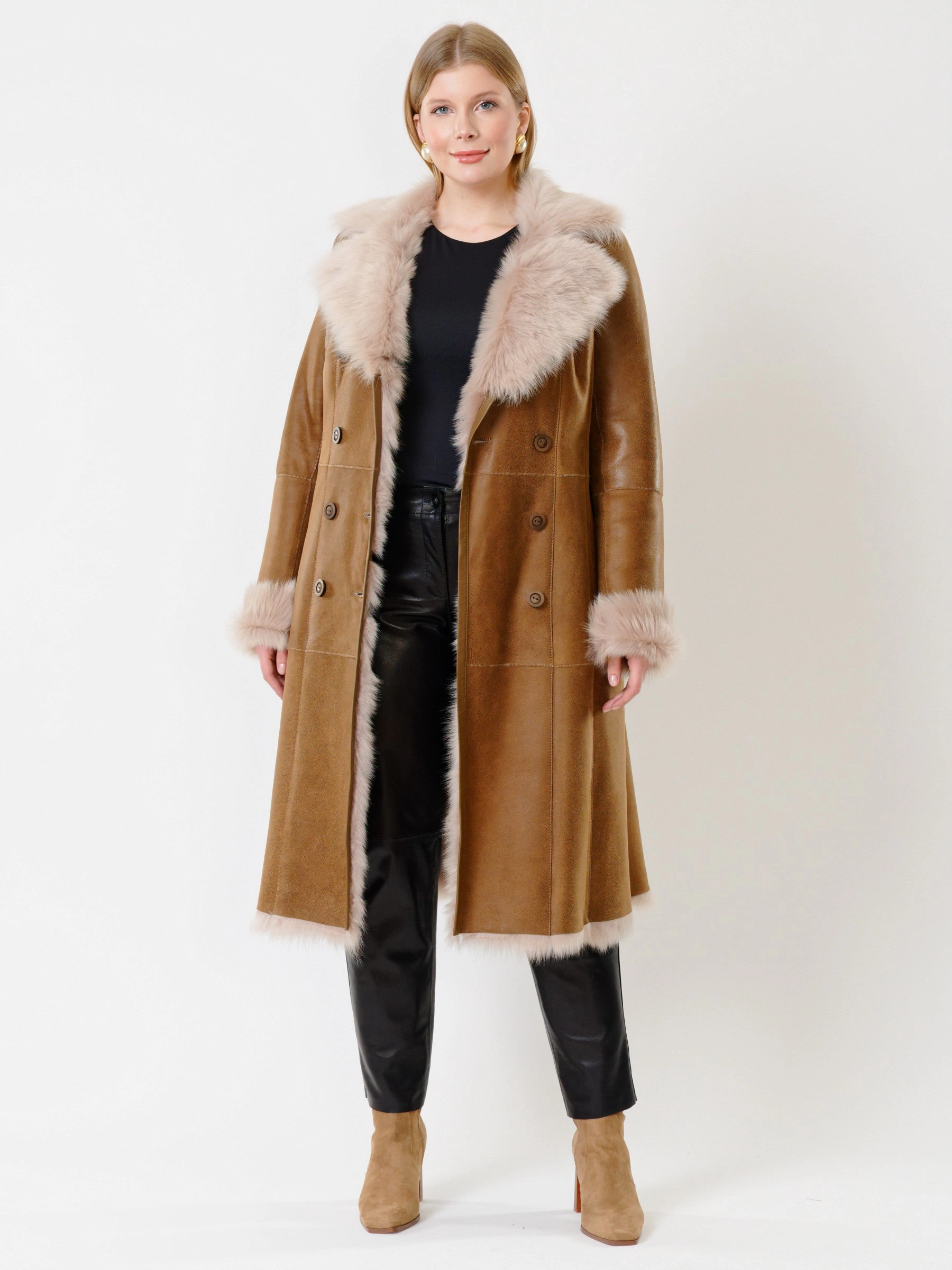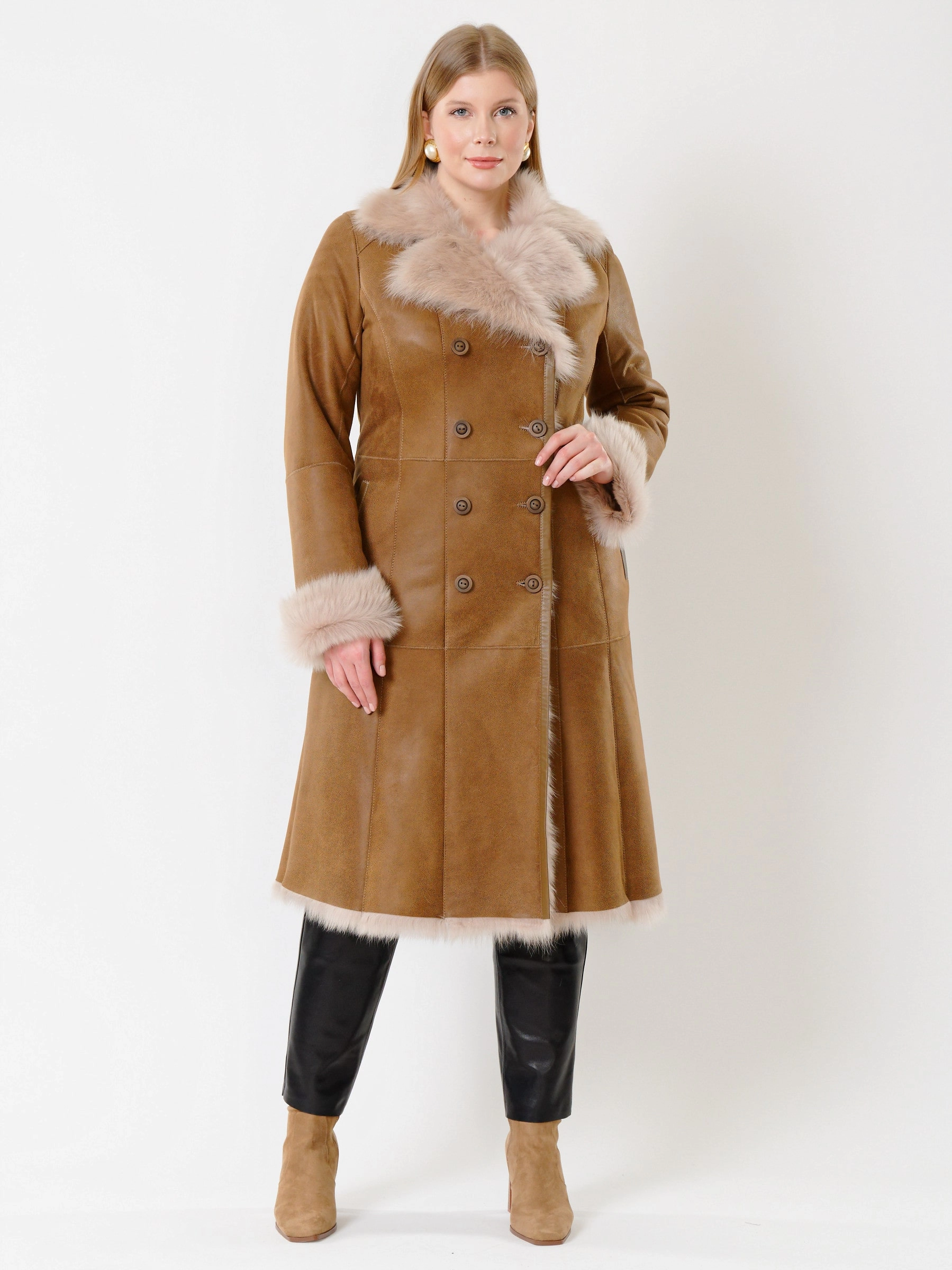 Двубортная длинная женская дубленка из тосканы 127н, бежевая, размер 52, артикул 62181