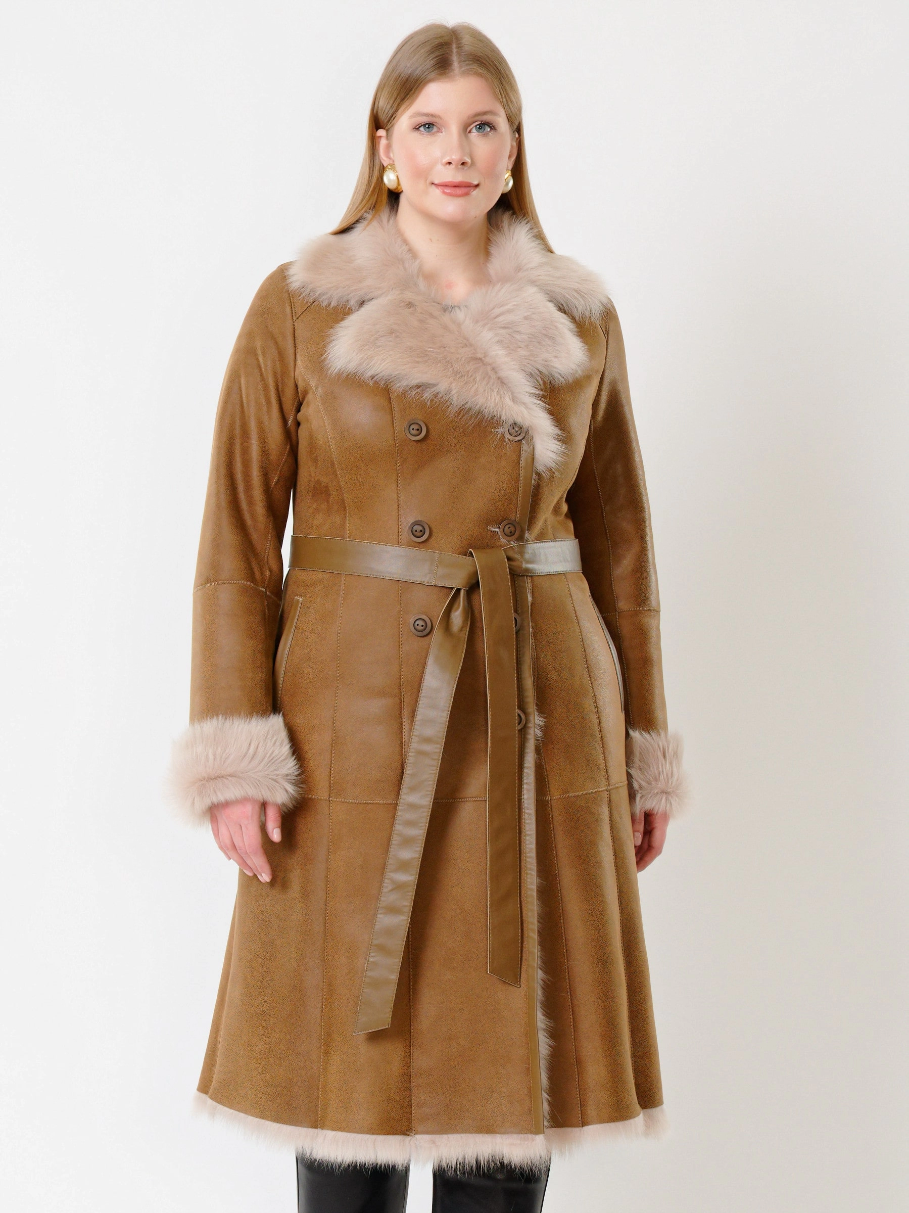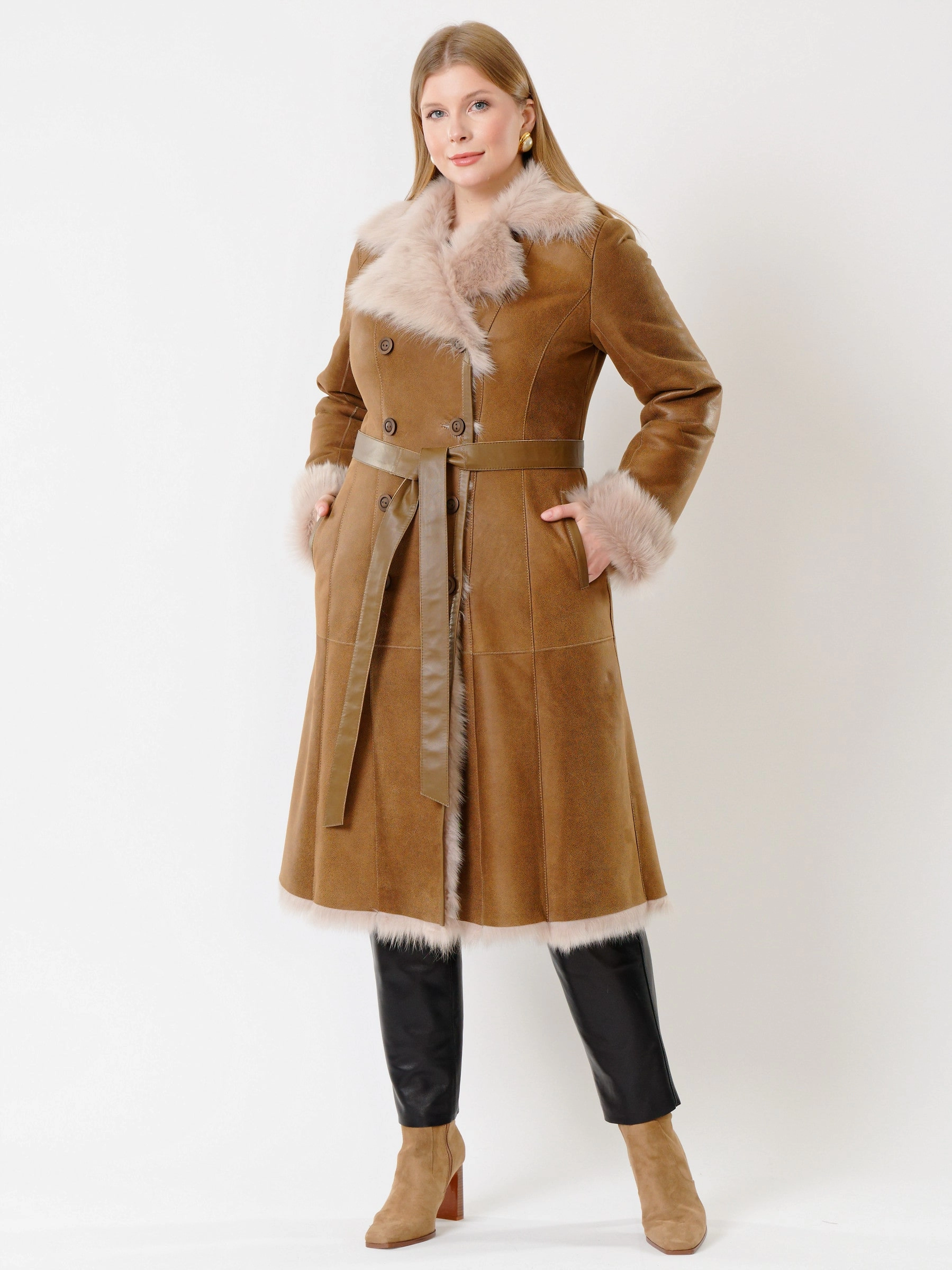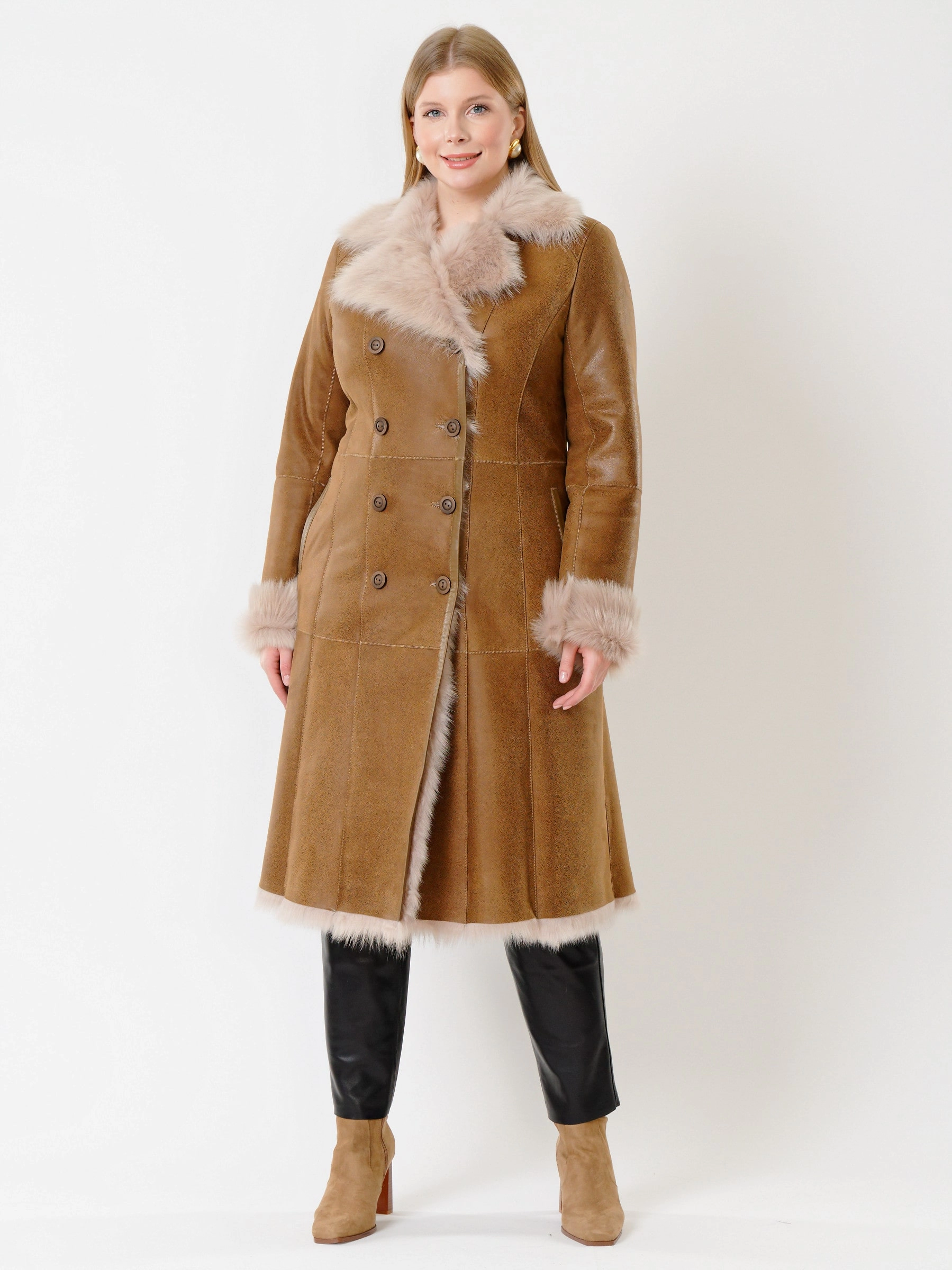 Согревающая классика премиум-класса: нежнейшая бежевая овчина «тосканы» в полуприлегающем силуэте дарит элегантное тепло, а двубортная застёжка на пуговицах и английский воротник создают вневременной образ. Длинный пояс мягко подчеркнёт талию, сохраняя комфорт — сочетайте с вязаными платьями, кожаными брюками или джинсами для безупречного зимнего стиля!