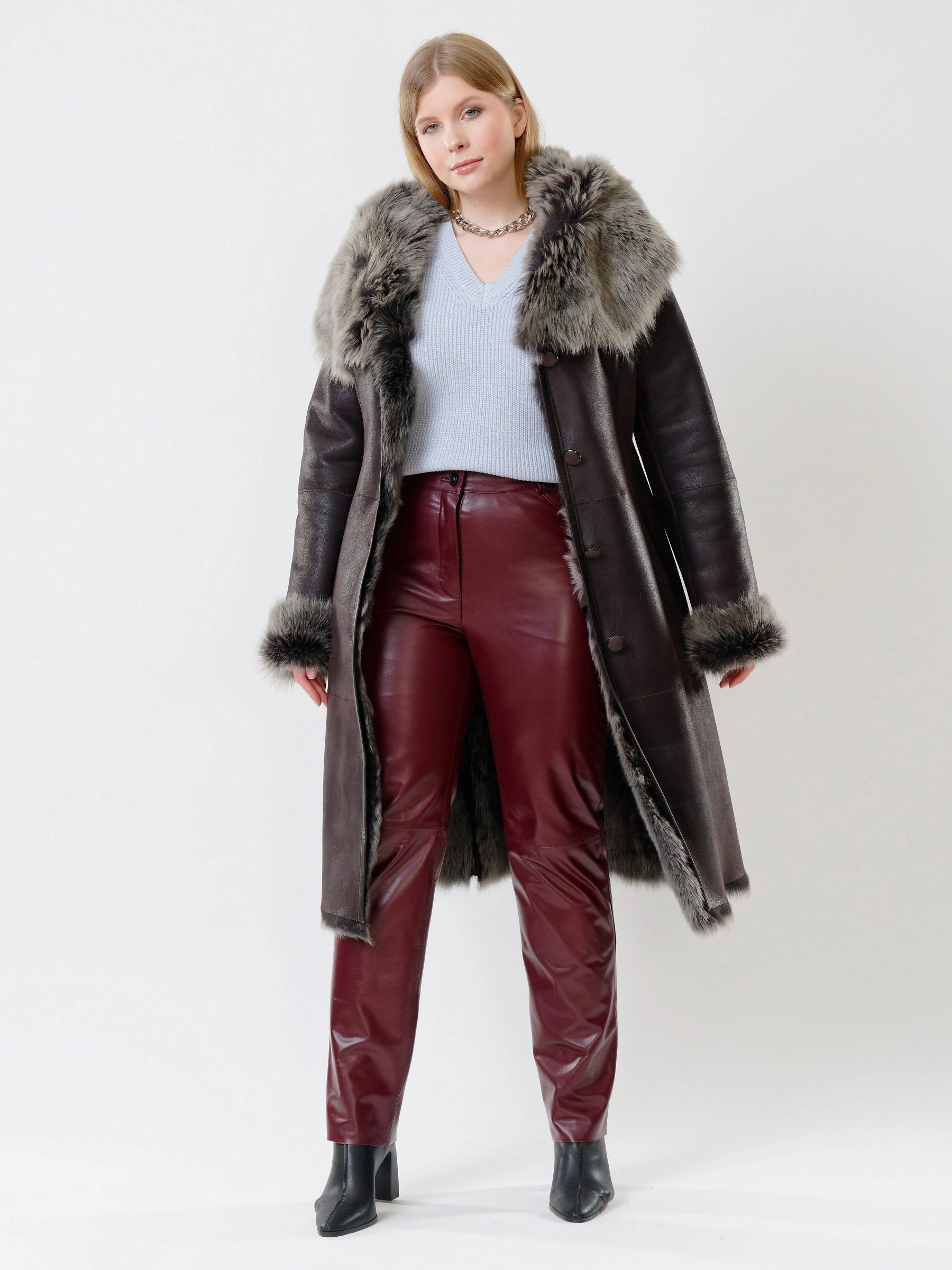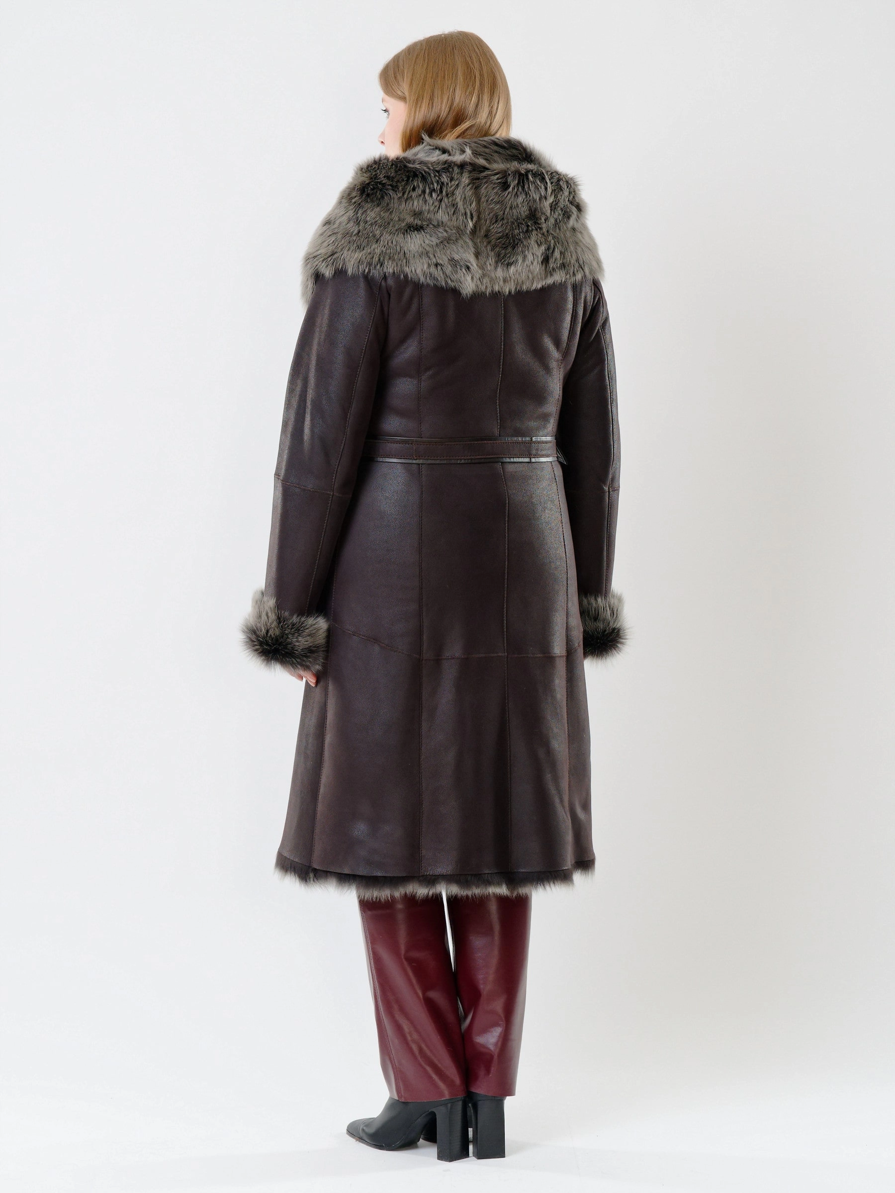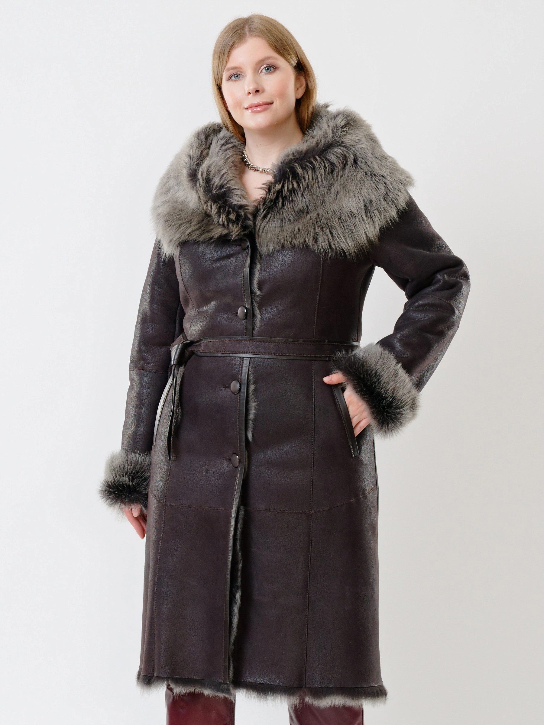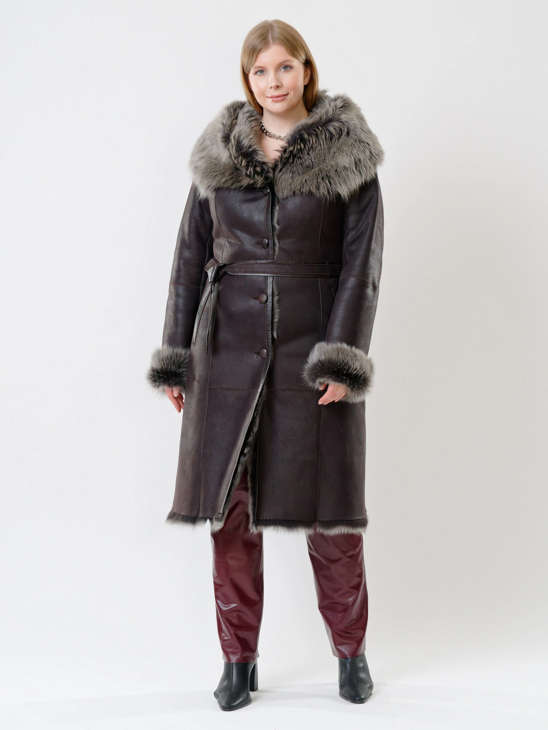 Женская длинная дубленка из тосканы с капюшоном 131, коричневая, размер 44, артикул 14290