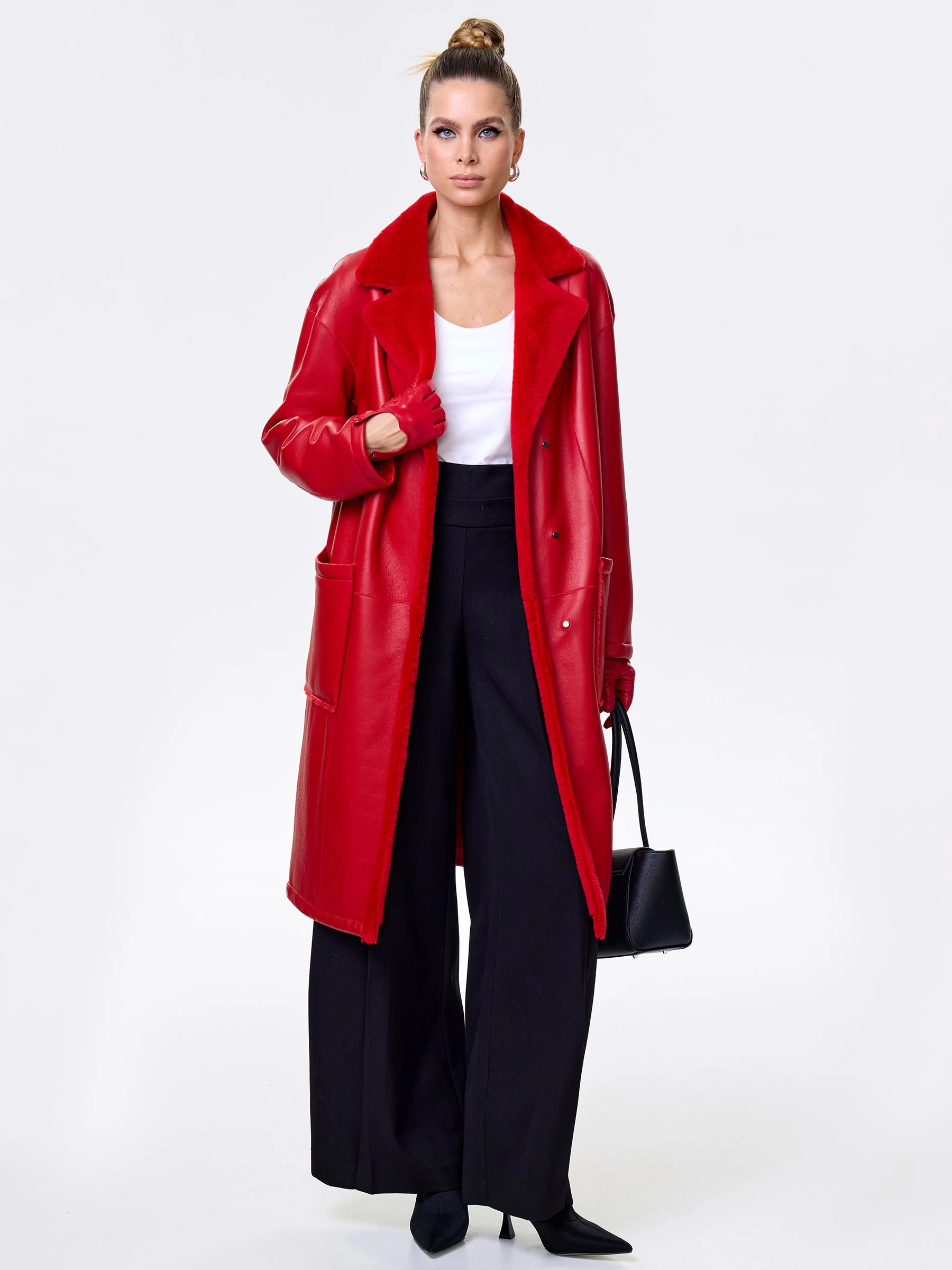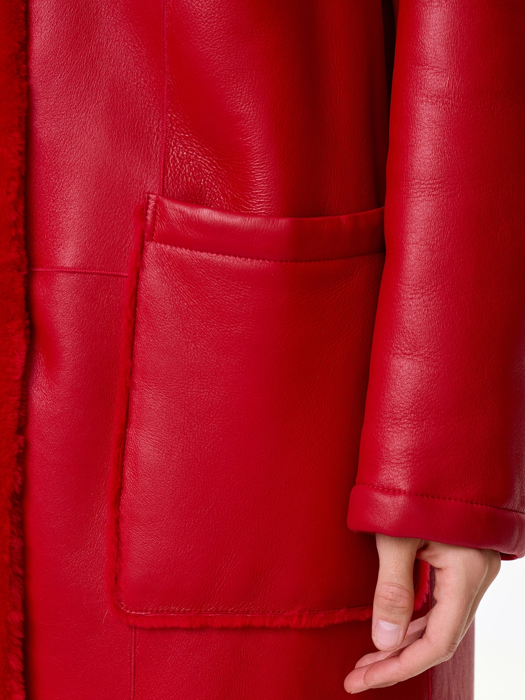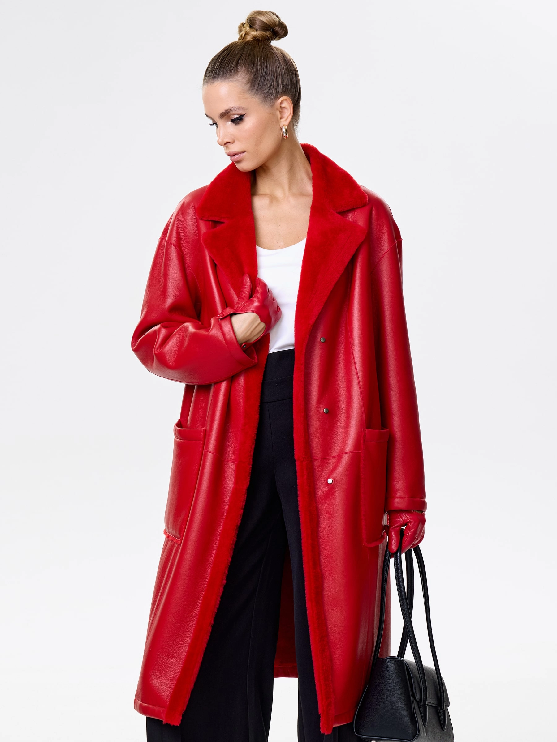 Товар длинная женская дубленка оверсайз премиум класса 2002, красная, размер 48, артикул 62441 выполнен из овчина "мерино" с застежкой кнопки. Рассчитан на сезон: осень-зима. Длина изделия 105 см, силуэт прямой.
