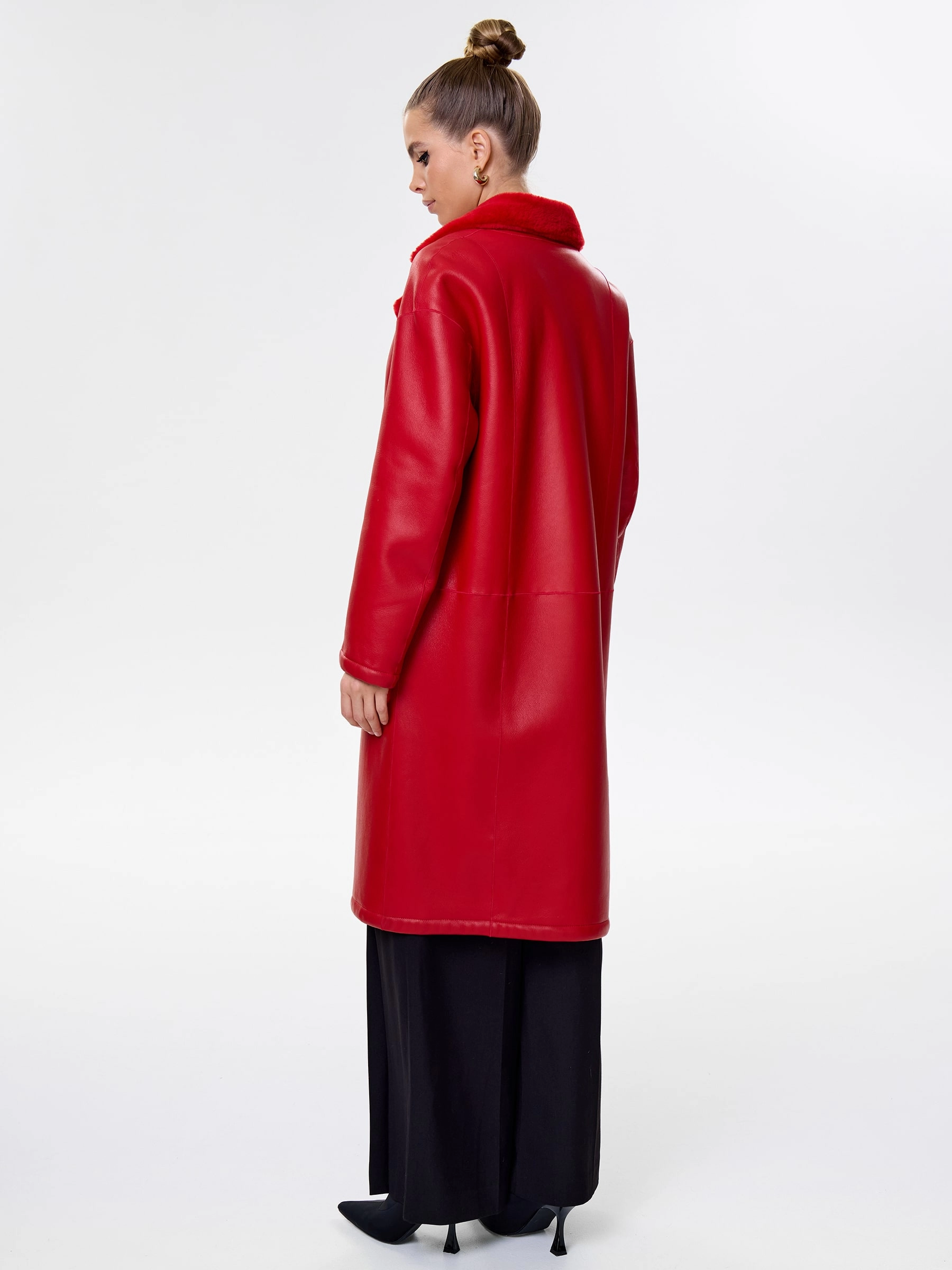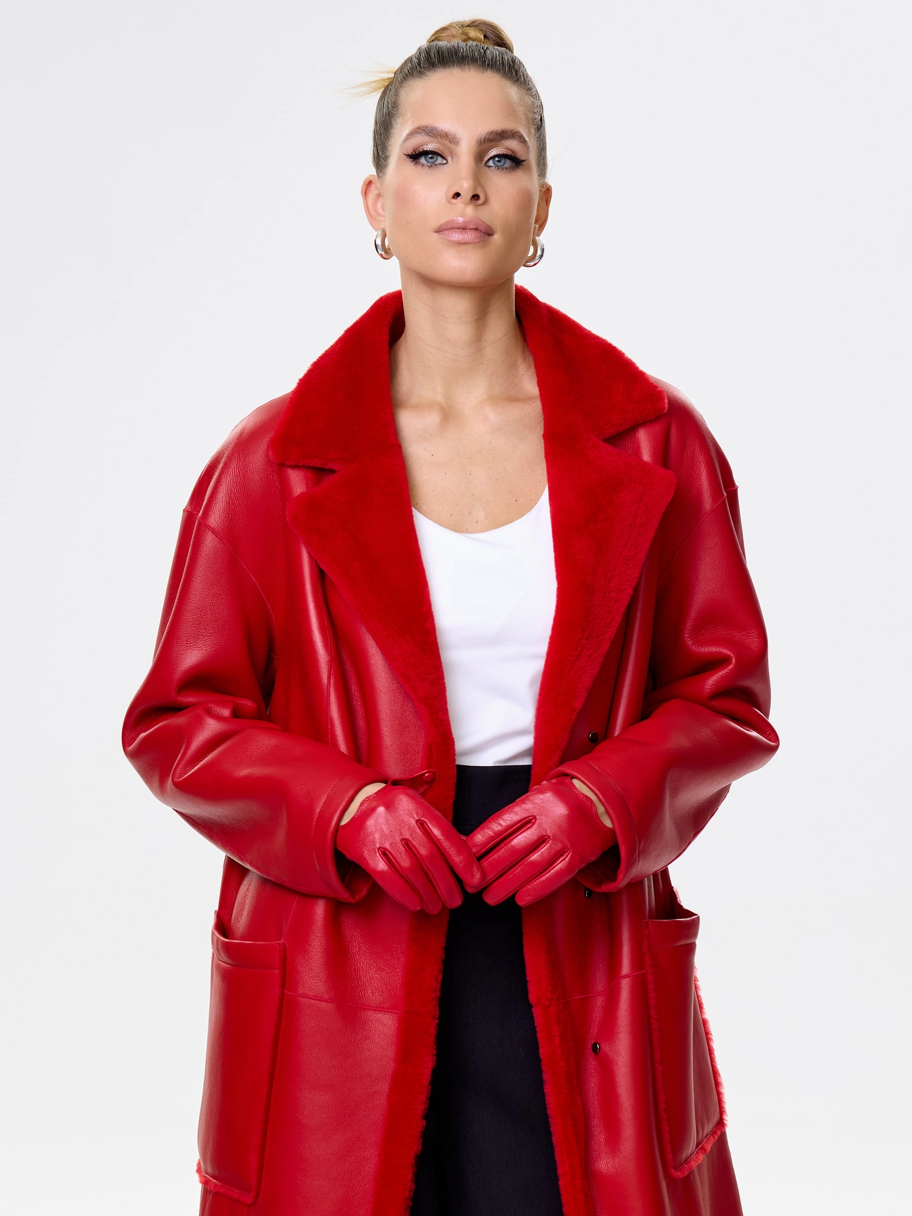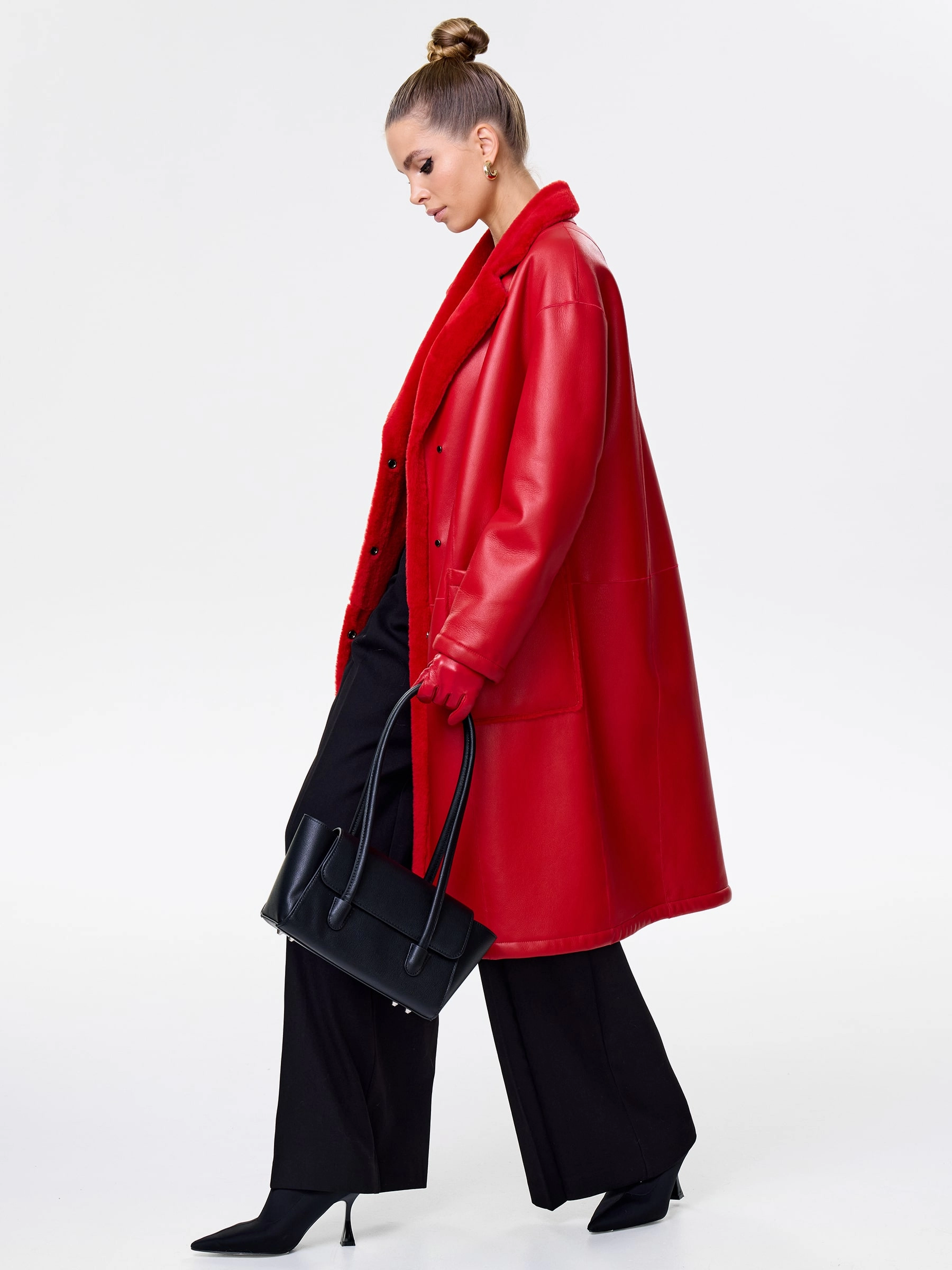 Товар длинная женская дубленка оверсайз премиум класса 2002, красная, размер 48, артикул 62441 выполнен из овчина "мерино" с застежкой кнопки. Рассчитан на сезон: осень-зима. Длина изделия 105 см, силуэт прямой.