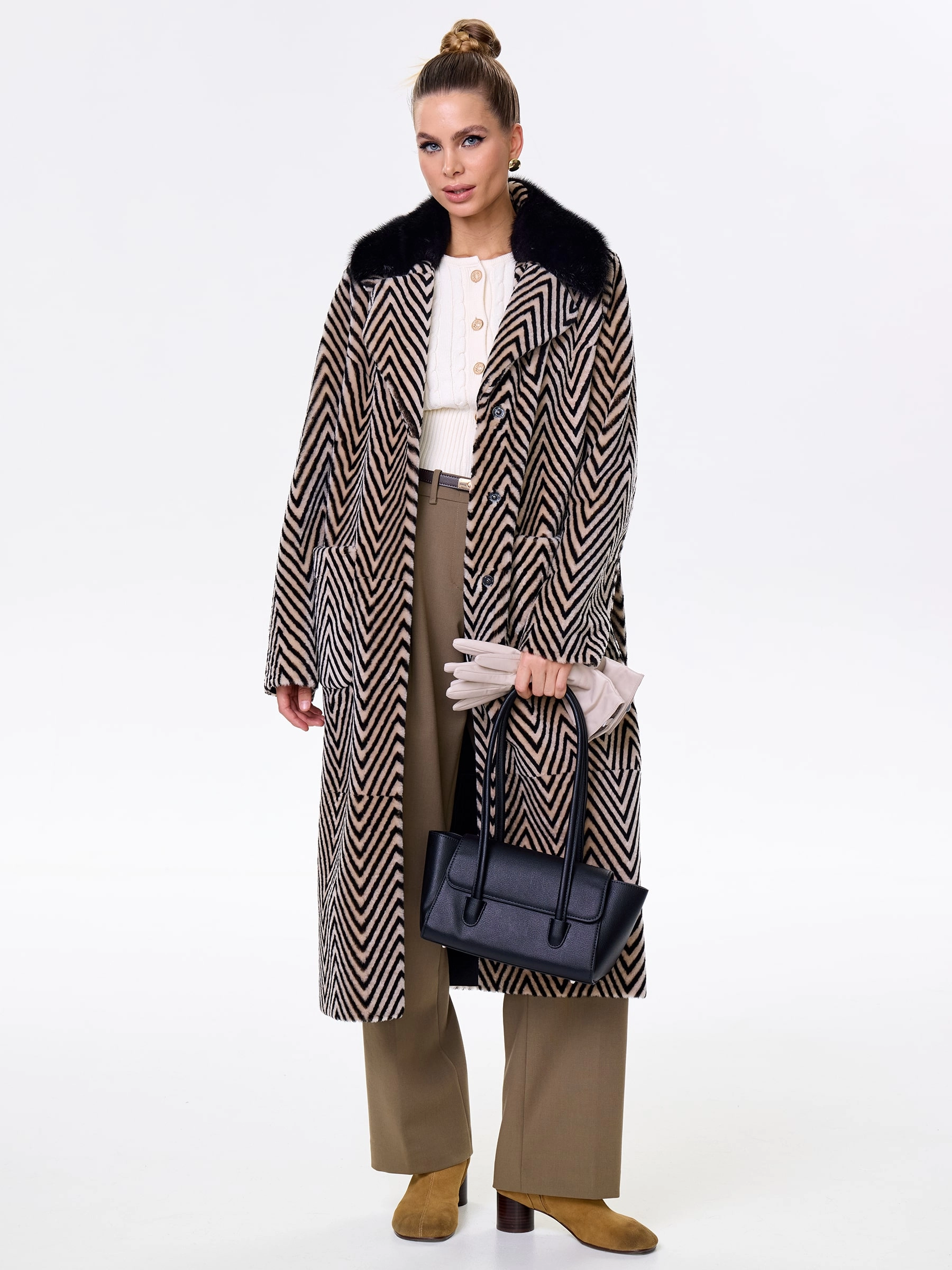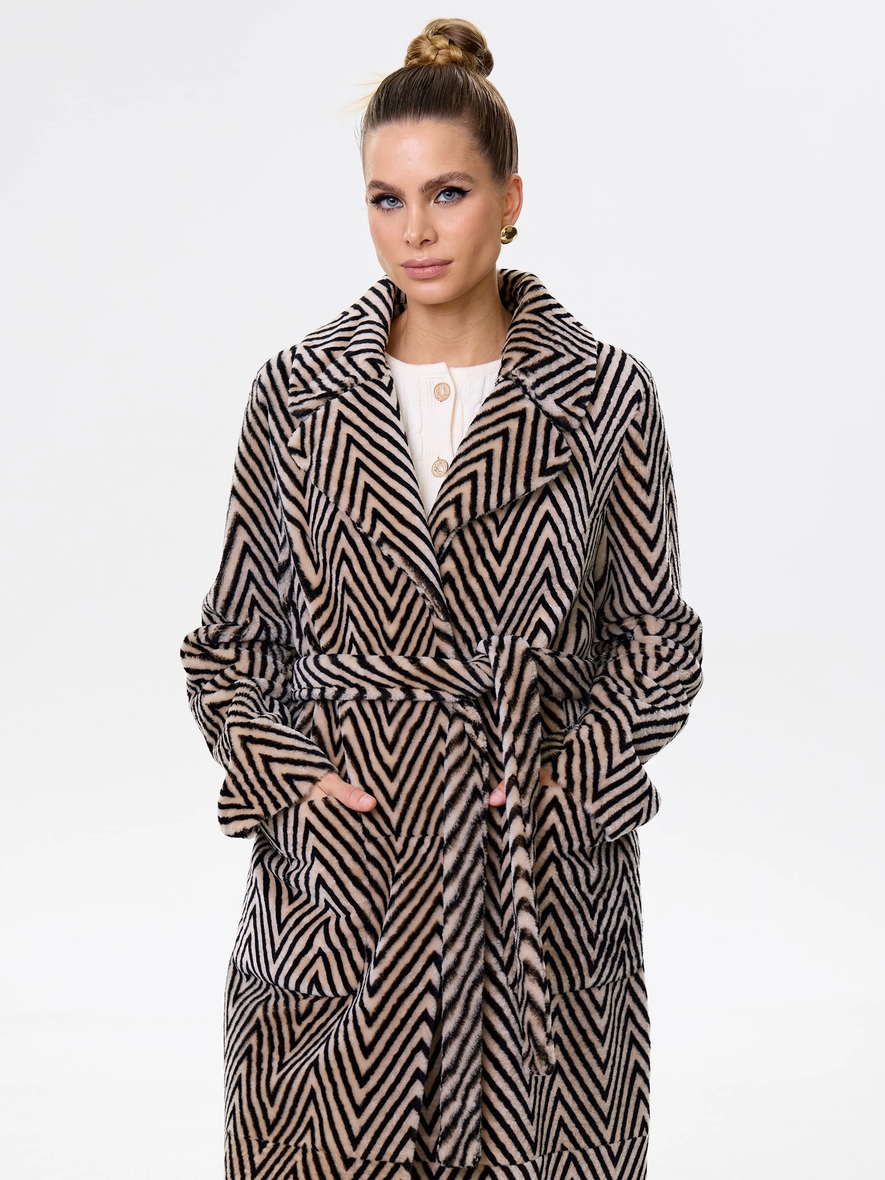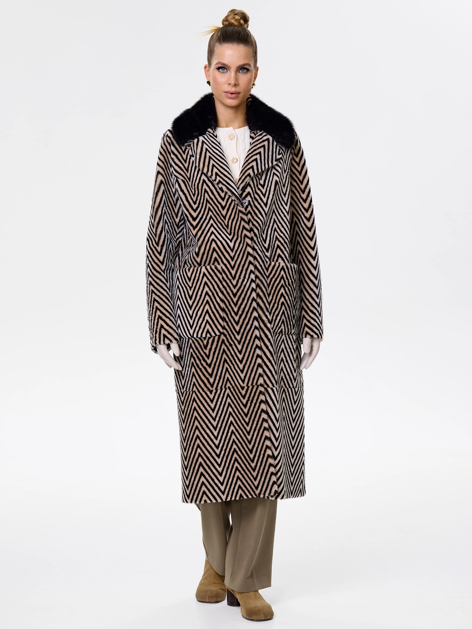 Роскошная двусторонняя дублёнка премиум-класса длиной 119 см: принтованный мех астрагана, то есть ягнёнка, с одной стороны и благородное бронзовое металлизированное покрытие — с другой. Свободный силуэт со съёмным английским воротником из густого чёрного меха норки и удобной застёжкой на кнопках создаёт образ исключительной элегантности. Два накладных кармана и длинный пояс подчёркивают дизайн. Совет стилиста: носите со стороной из астрагана и меховым воротником с платьем-миди и сапогами для вечера или со стороной-металлик без воротника с водолазкой, кожаными брюками и ботинками для дерзкого повседневного лука — максимальная универсальность в одной вещи.