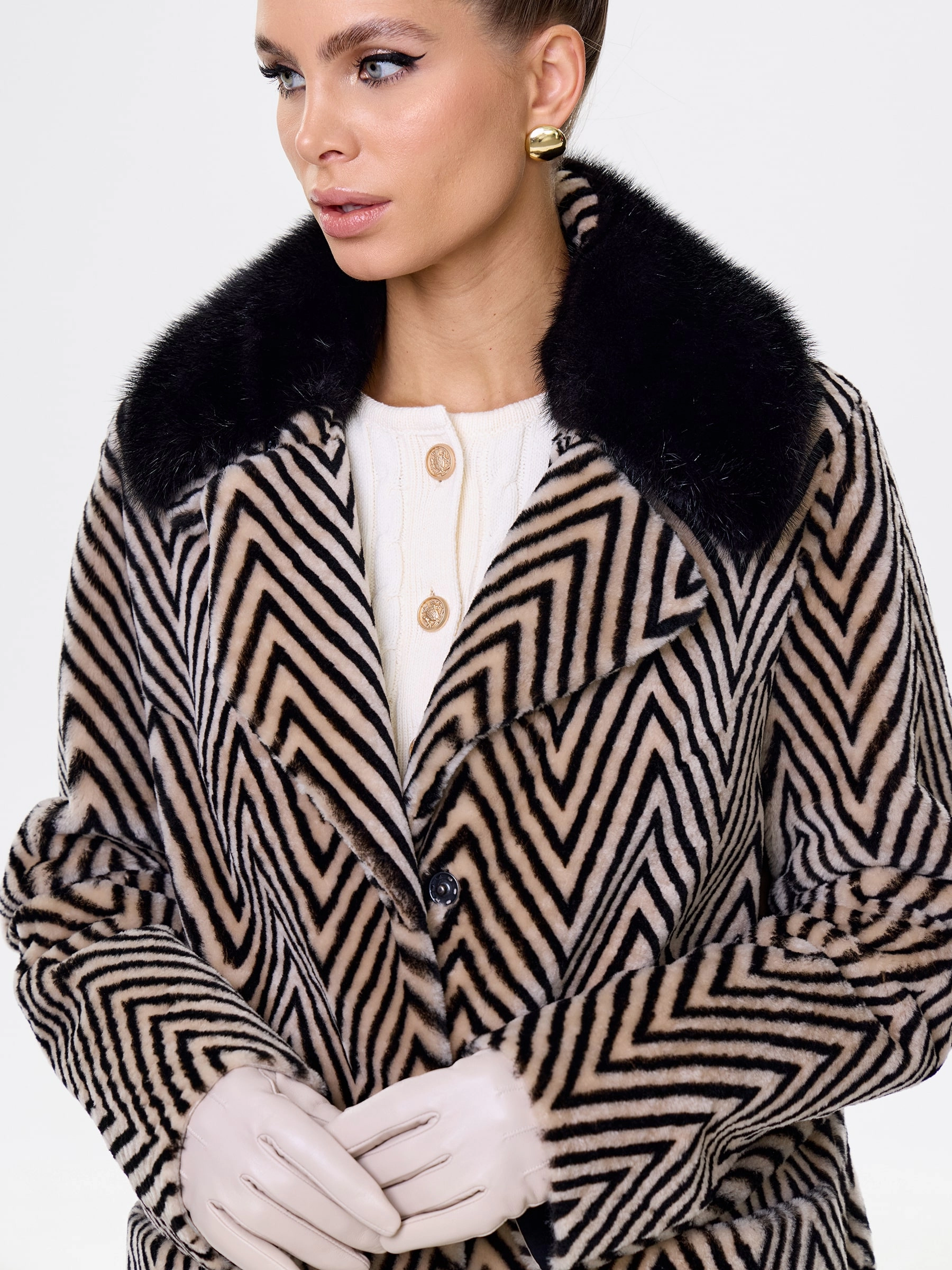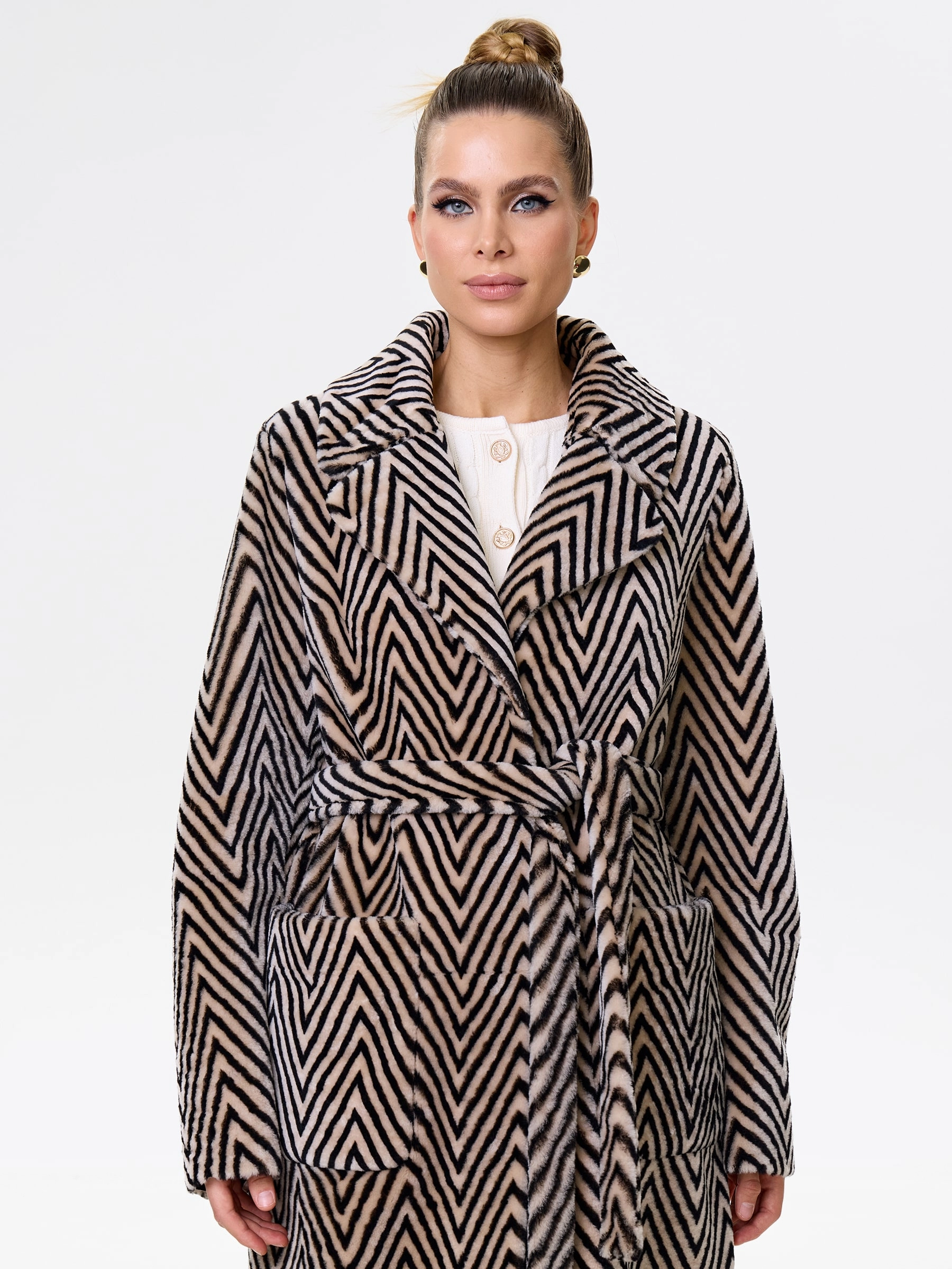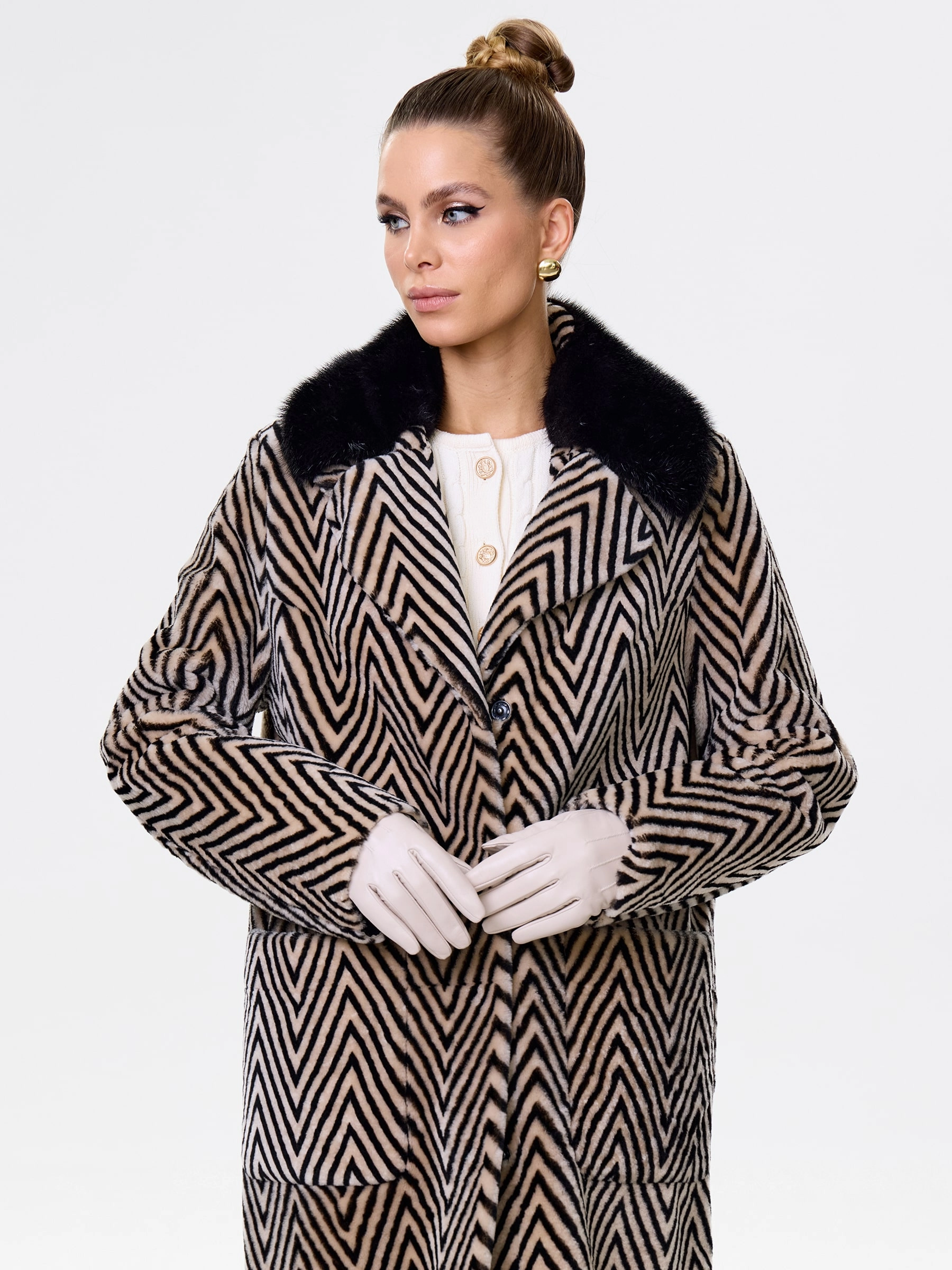 Роскошная двусторонняя дублёнка премиум-класса длиной 119 см: принтованный мех астрагана, то есть ягнёнка, с одной стороны и благородное бронзовое металлизированное покрытие — с другой. Свободный силуэт со съёмным английским воротником из густого чёрного меха норки и удобной застёжкой на кнопках создаёт образ исключительной элегантности. Два накладных кармана и длинный пояс подчёркивают дизайн. Совет стилиста: носите со стороной из астрагана и меховым воротником с платьем-миди и сапогами для вечера или со стороной-металлик без воротника с водолазкой, кожаными брюками и ботинками для дерзкого повседневного лука — максимальная универсальность в одной вещи.