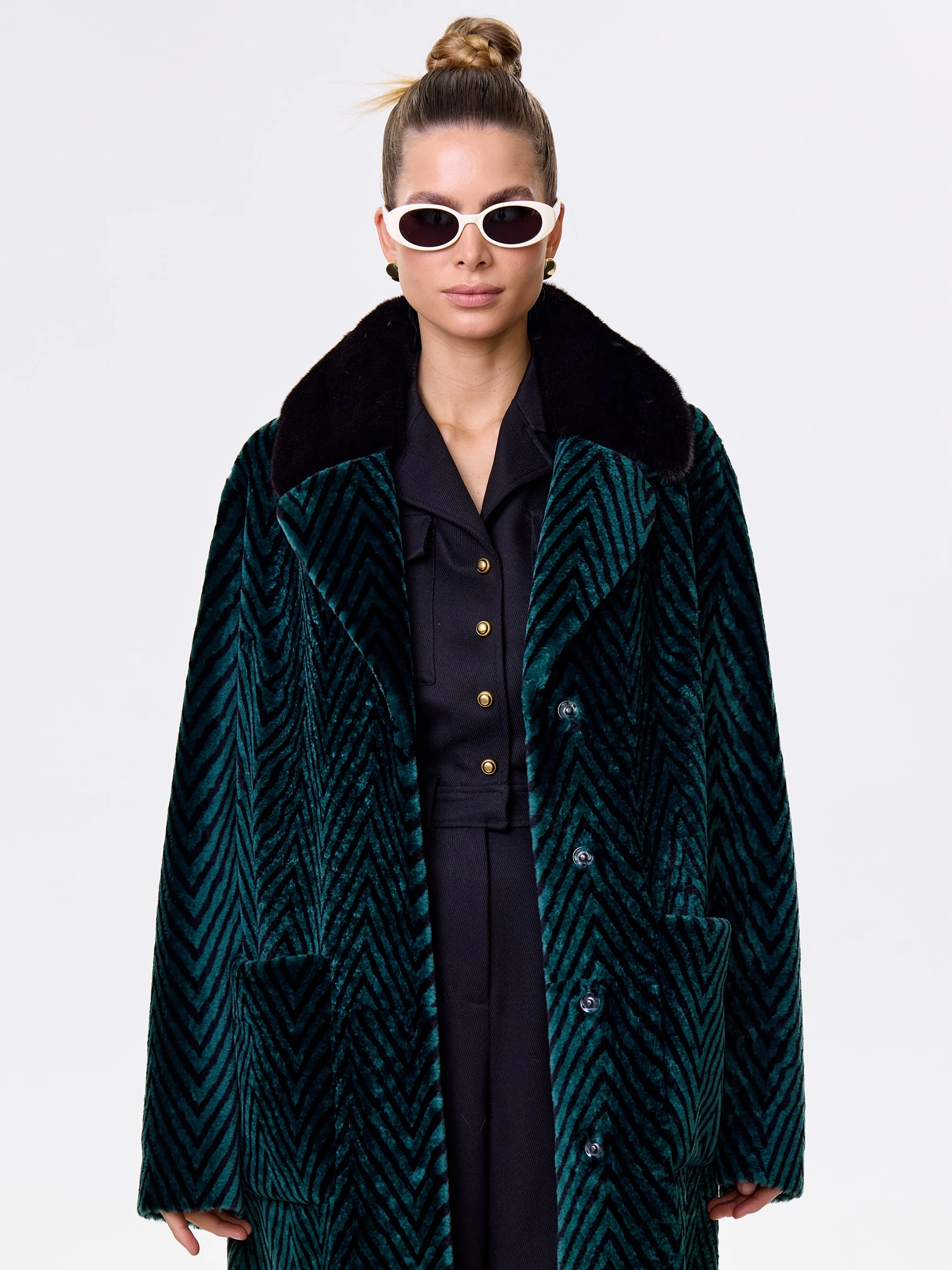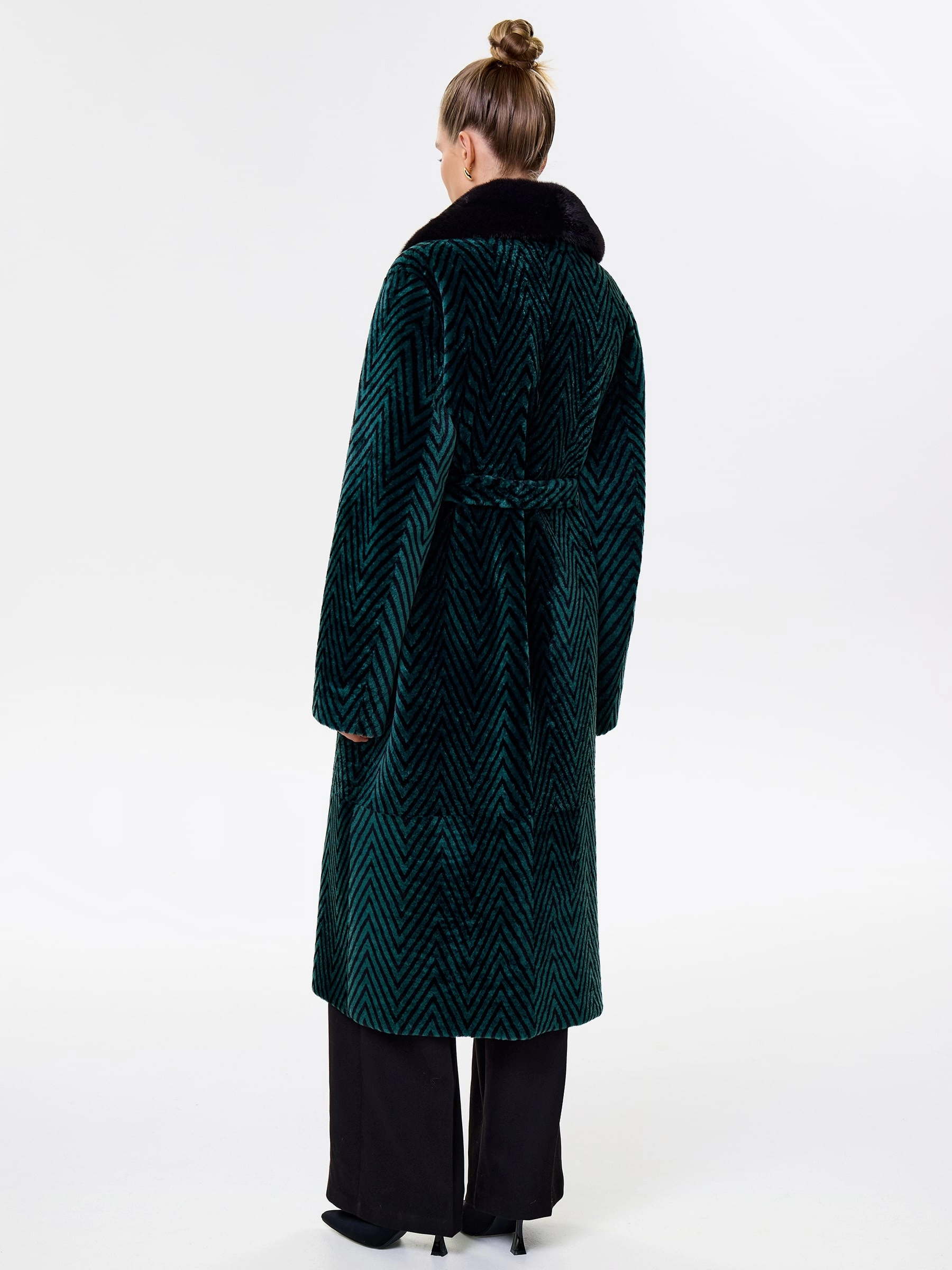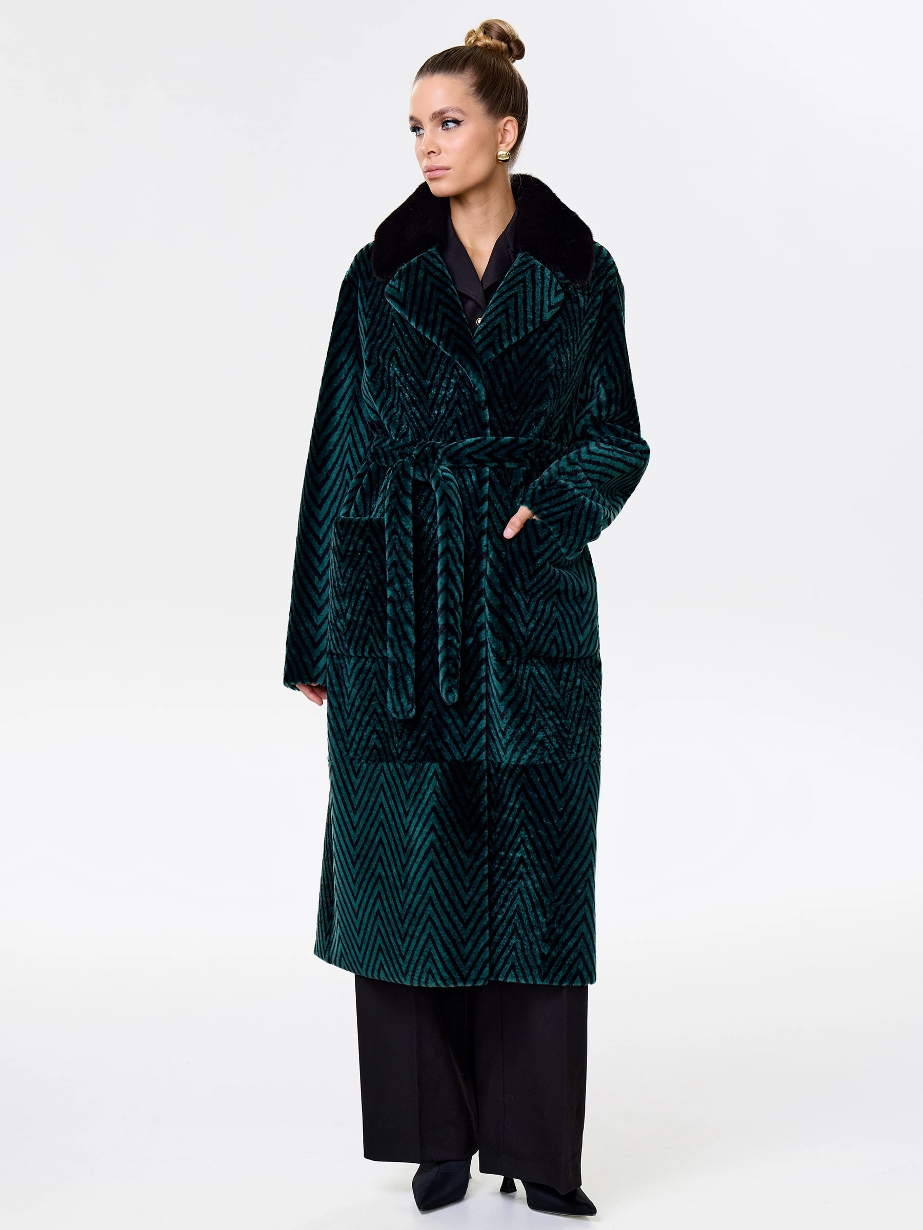 Роскошная двусторонняя дублёнка премиум-класса длиной 119 см: принтованный мех астрагана, то есть ягнёнка, с одной стороны и благородное бронзовое металлизированное покрытие — с другой. Свободный силуэт со съёмным английским воротником из густого чёрного меха норки и удобной застёжкой на кнопках создаёт образ исключительной элегантности. Два накладных кармана и длинный пояс подчёркивают дизайн. Совет стилиста: носите со стороной из астрагана и меховым воротником с платьем-миди и сапогами для вечера или со стороной-металлик без воротника с водолазкой, кожаными брюками и ботинками для дерзкого повседневного лука — максимальная универсальность в одной вещи.