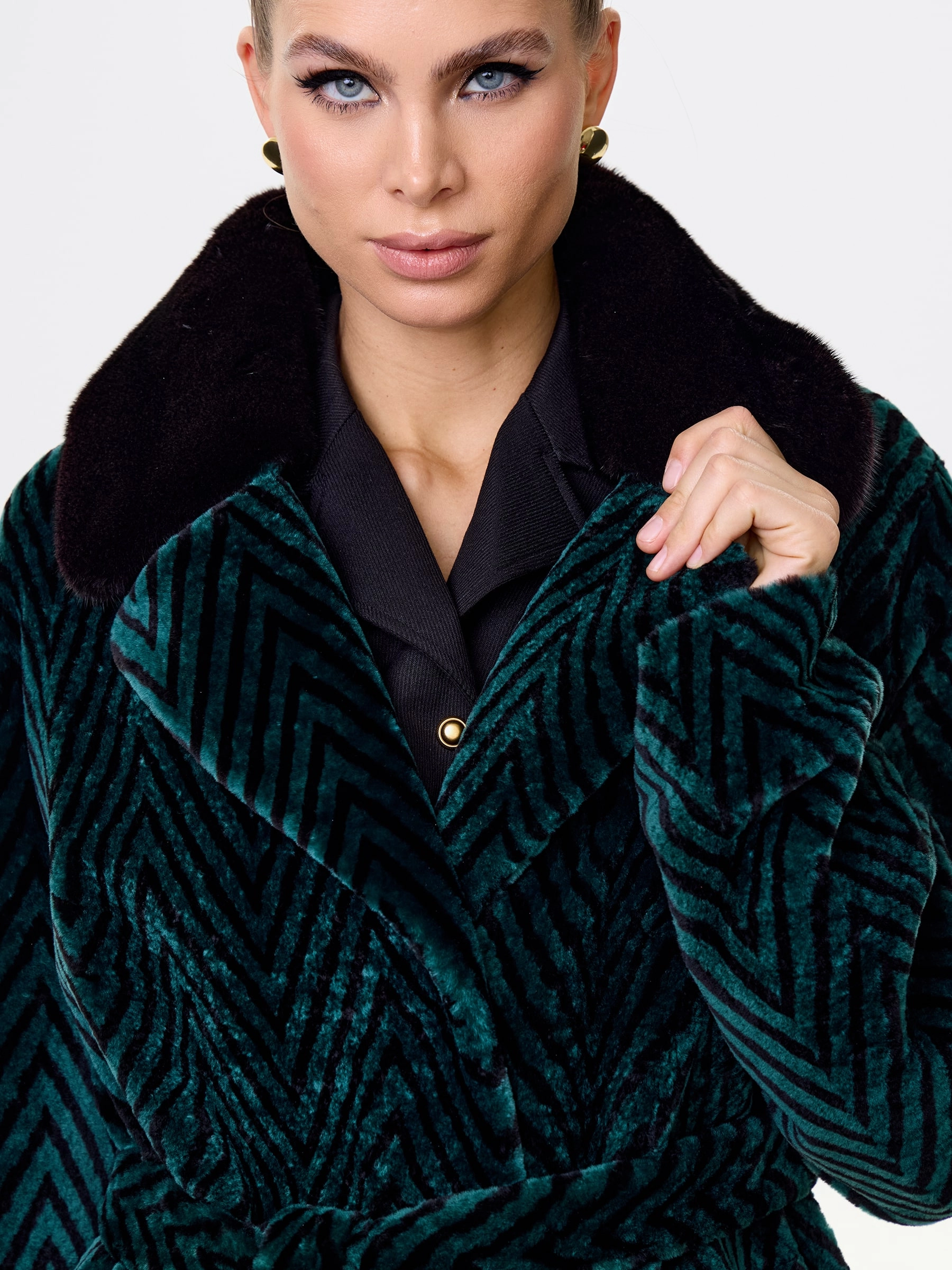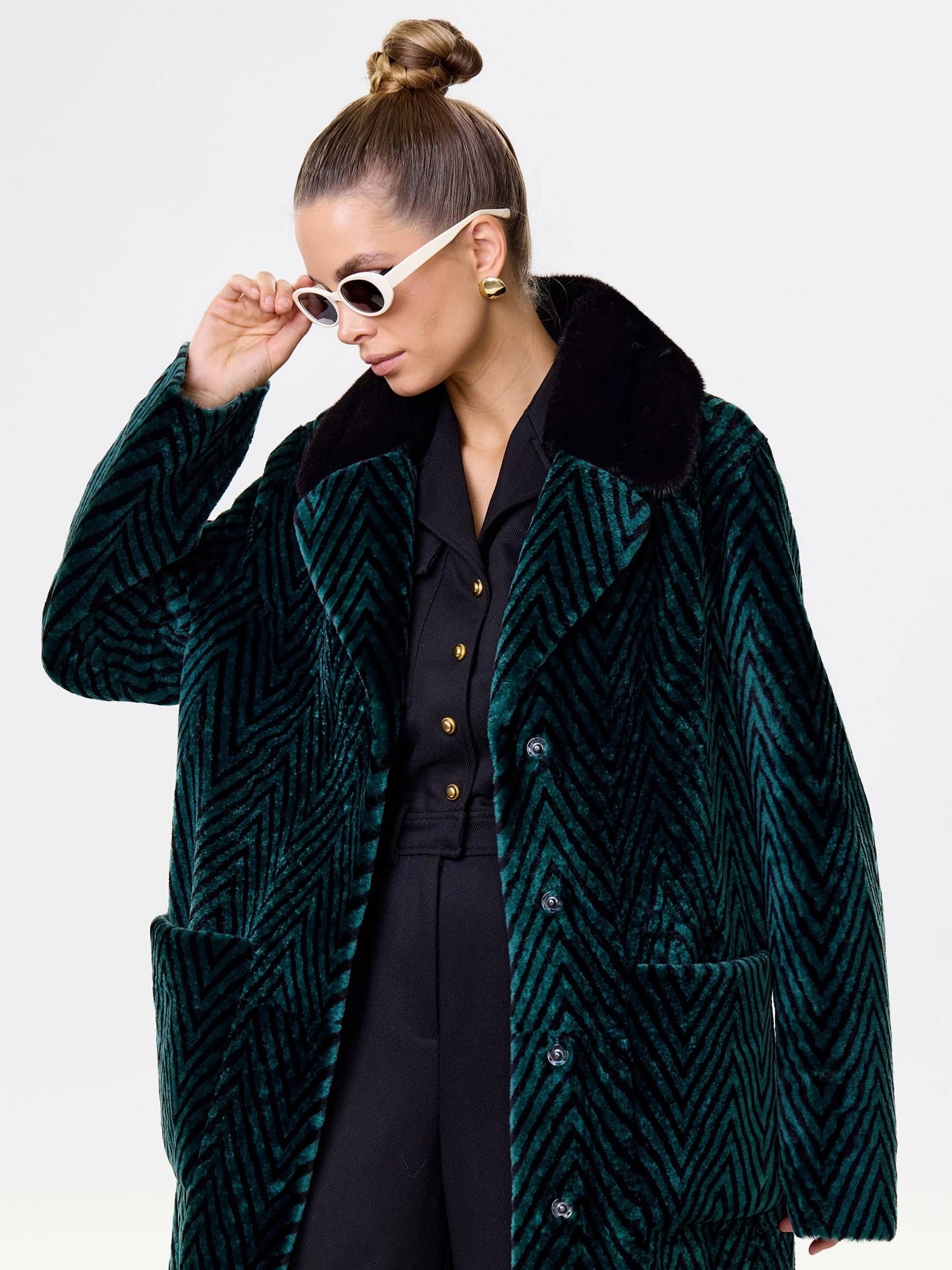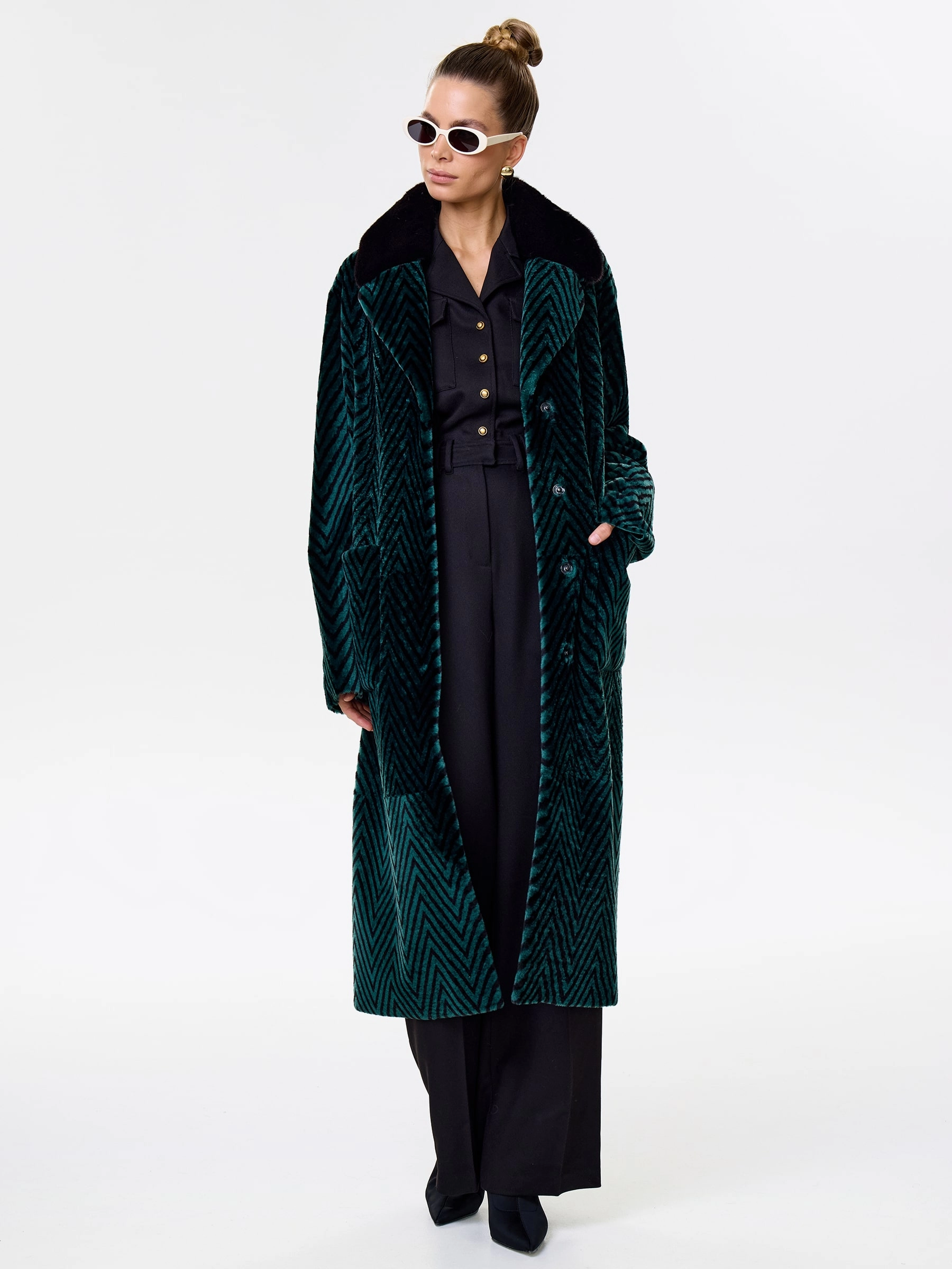 Роскошная двусторонняя дублёнка премиум-класса длиной 119 см: принтованный мех астрагана, то есть ягнёнка, с одной стороны и благородное бронзовое металлизированное покрытие — с другой. Свободный силуэт со съёмным английским воротником из густого чёрного меха норки и удобной застёжкой на кнопках создаёт образ исключительной элегантности. Два накладных кармана и длинный пояс подчёркивают дизайн. Совет стилиста: носите со стороной из астрагана и меховым воротником с платьем-миди и сапогами для вечера или со стороной-металлик без воротника с водолазкой, кожаными брюками и ботинками для дерзкого повседневного лука — максимальная универсальность в одной вещи.