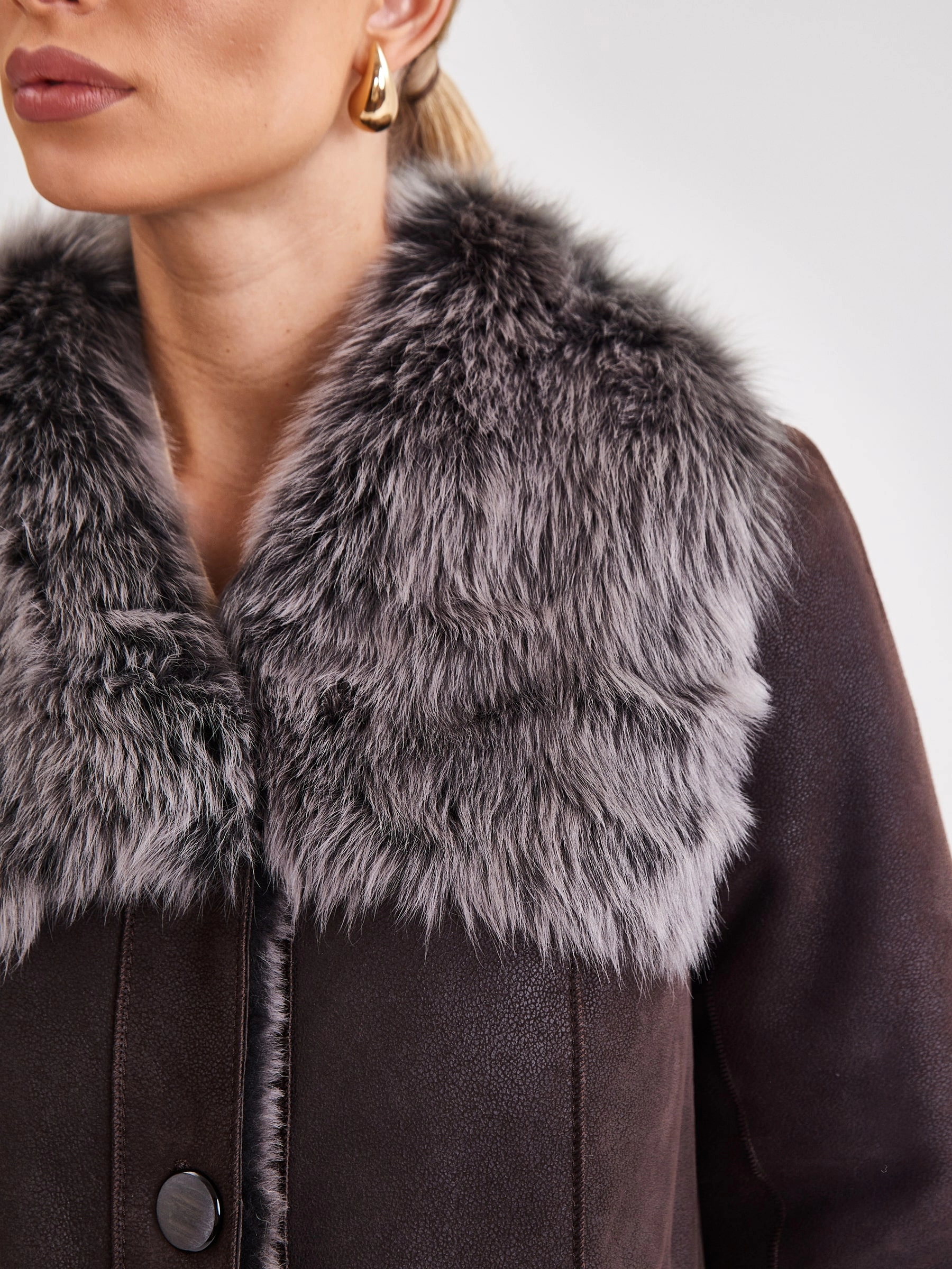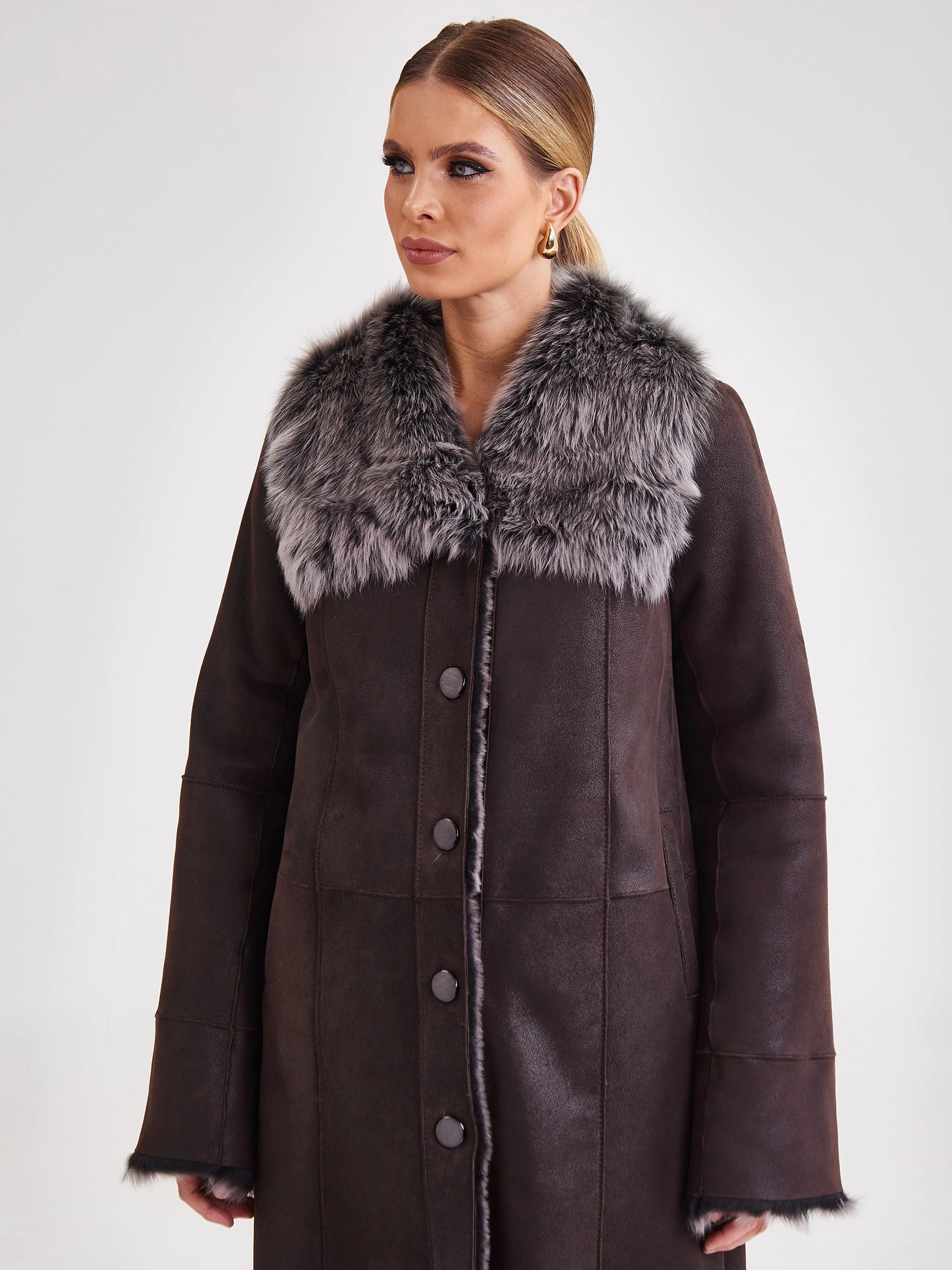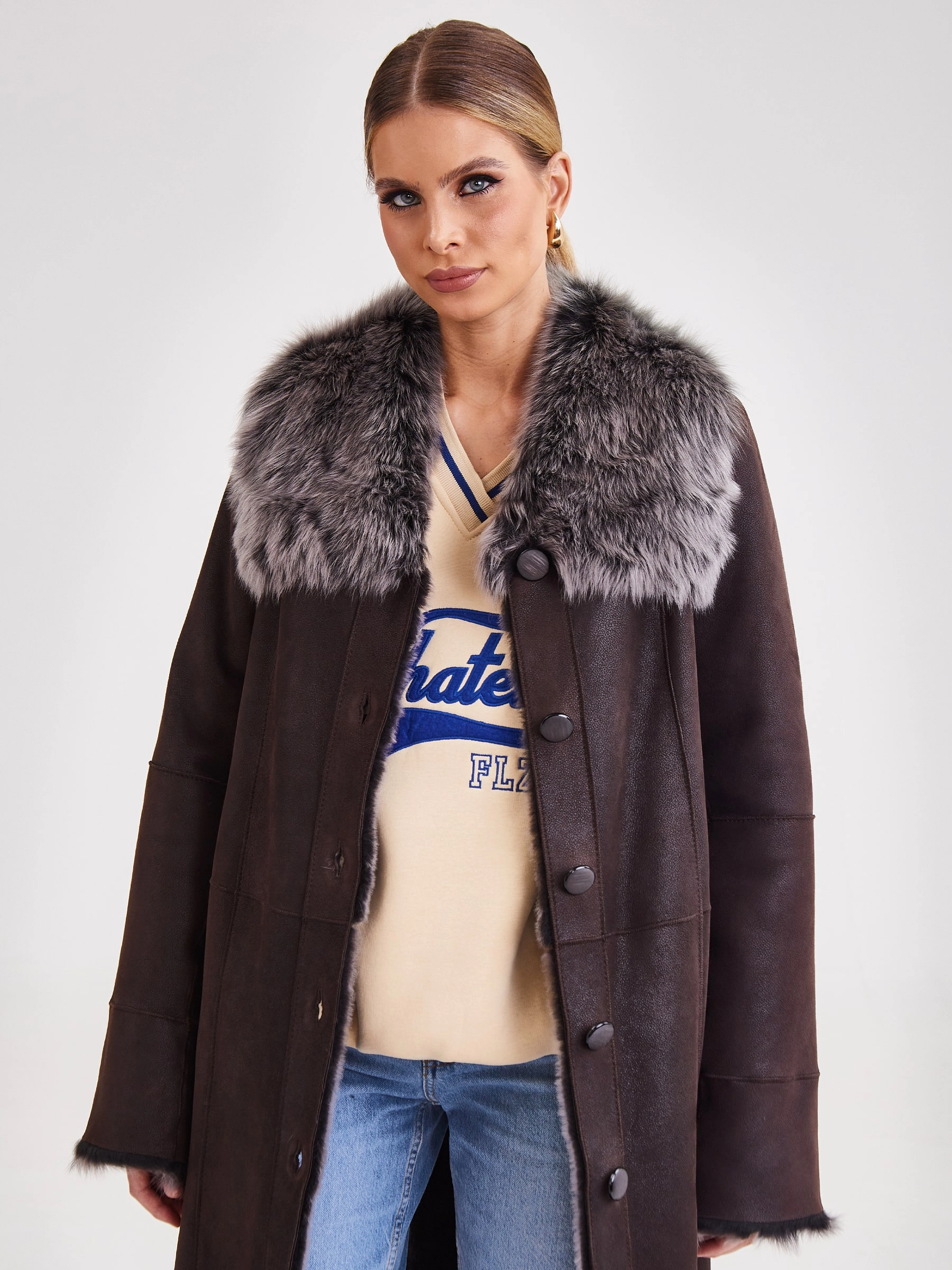 Элегантная длинная классическая дублёнка длиной 100 см из натуральной овчины «мерино» с силуэтом «трапеция» создаёт комфортную и утончённую форму. Модель с втачными рукавами, отложным воротником, отделанным роскошной натуральной овчиной «тоскана», двумя боковыми карманами и застёжкой на пуговицы — носите её с элегантными брюками, платьем-миди и кожаной сумкой для безупречного классического образа.