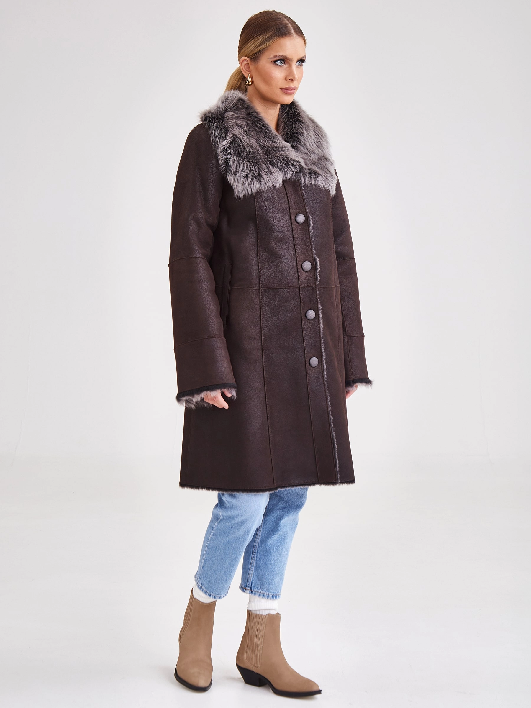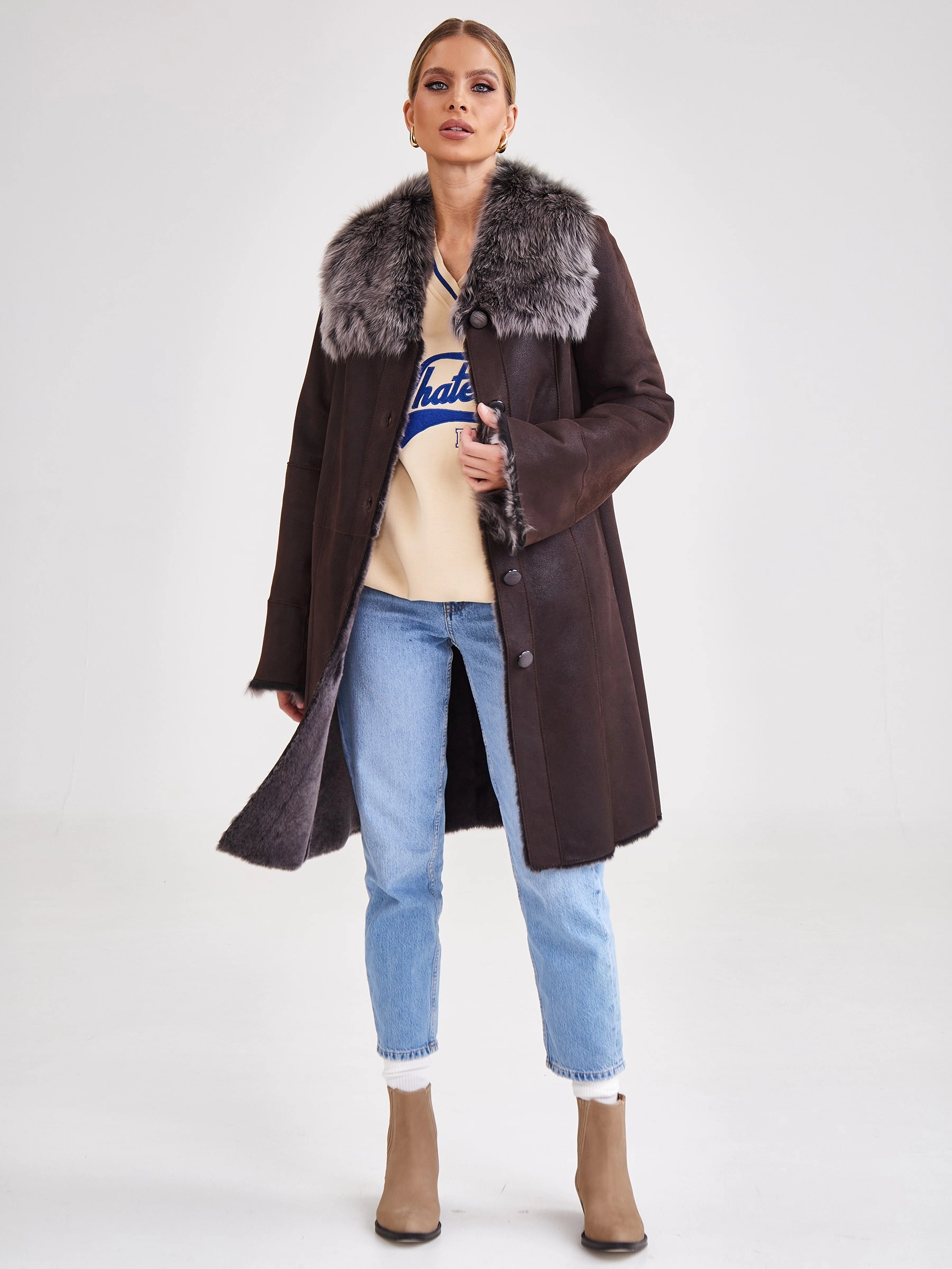 Товар дубленка женская с мехом тосканы 221, коричневая, размер 46, артикул 61421 выполнен из овчина "мерино" с застежкой пуговицы. Рассчитан на сезон: осень-зима. Длина изделия 100 см, силуэт трапеция.