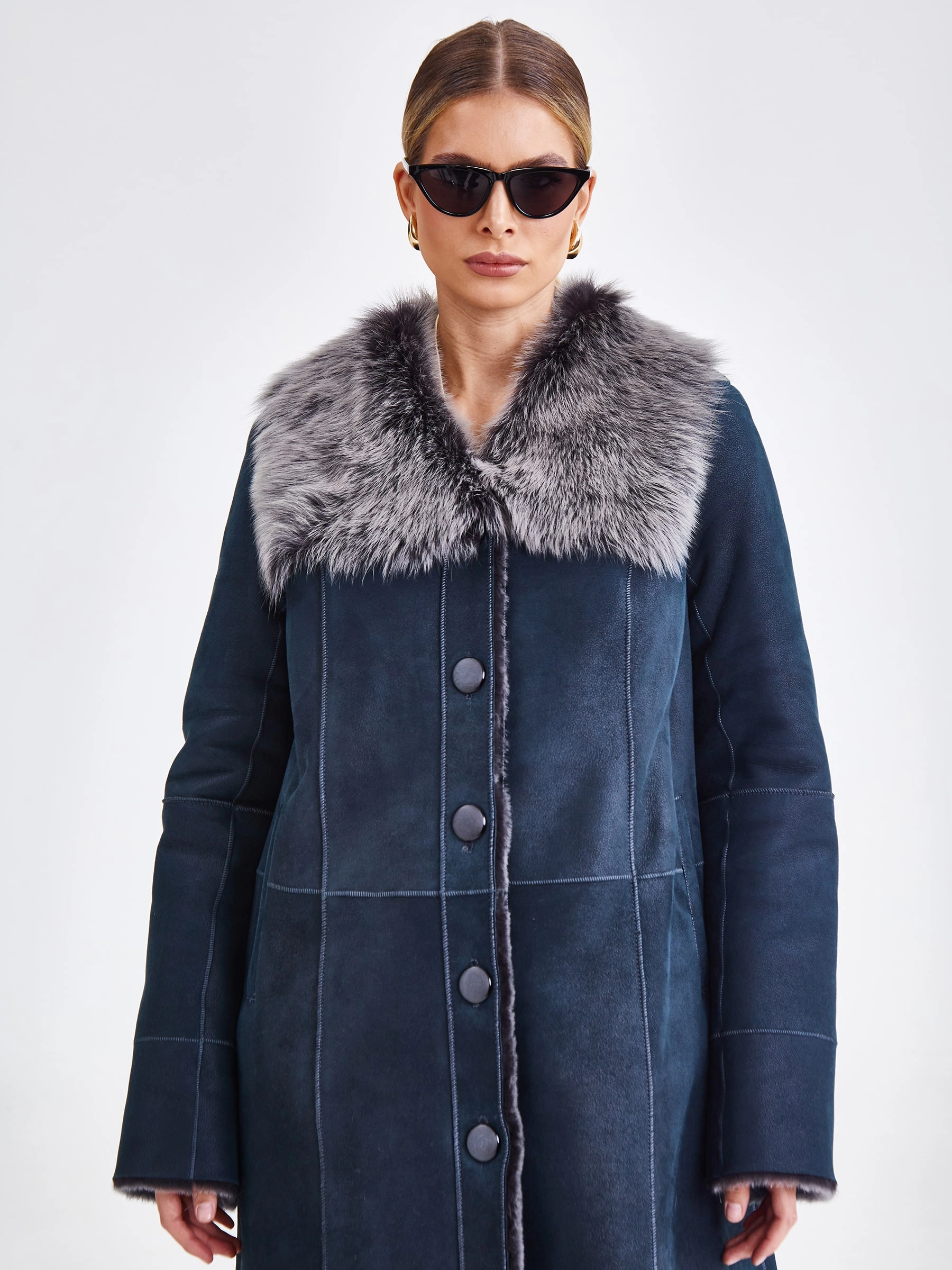 Товар дубленка женская с мехом тосканы 221, синяя, размер 46, артикул 62011 выполнен из овчина "мерино" с застежкой пуговицы. Рассчитан на сезон: осень-зима. Длина изделия 100 см, силуэт трапеция.