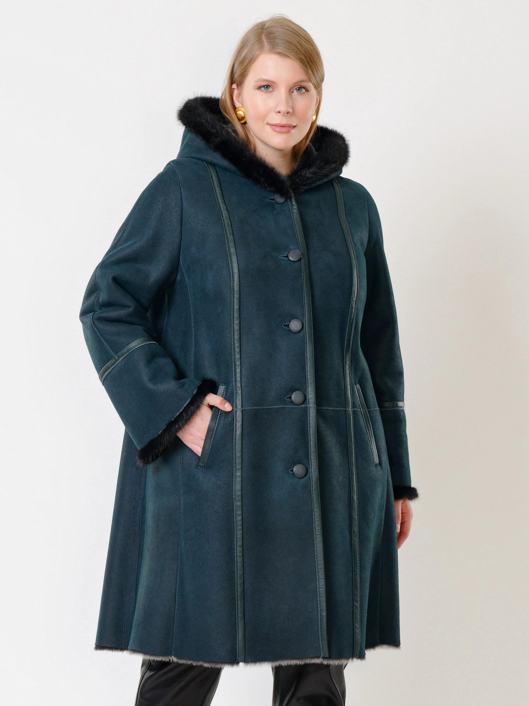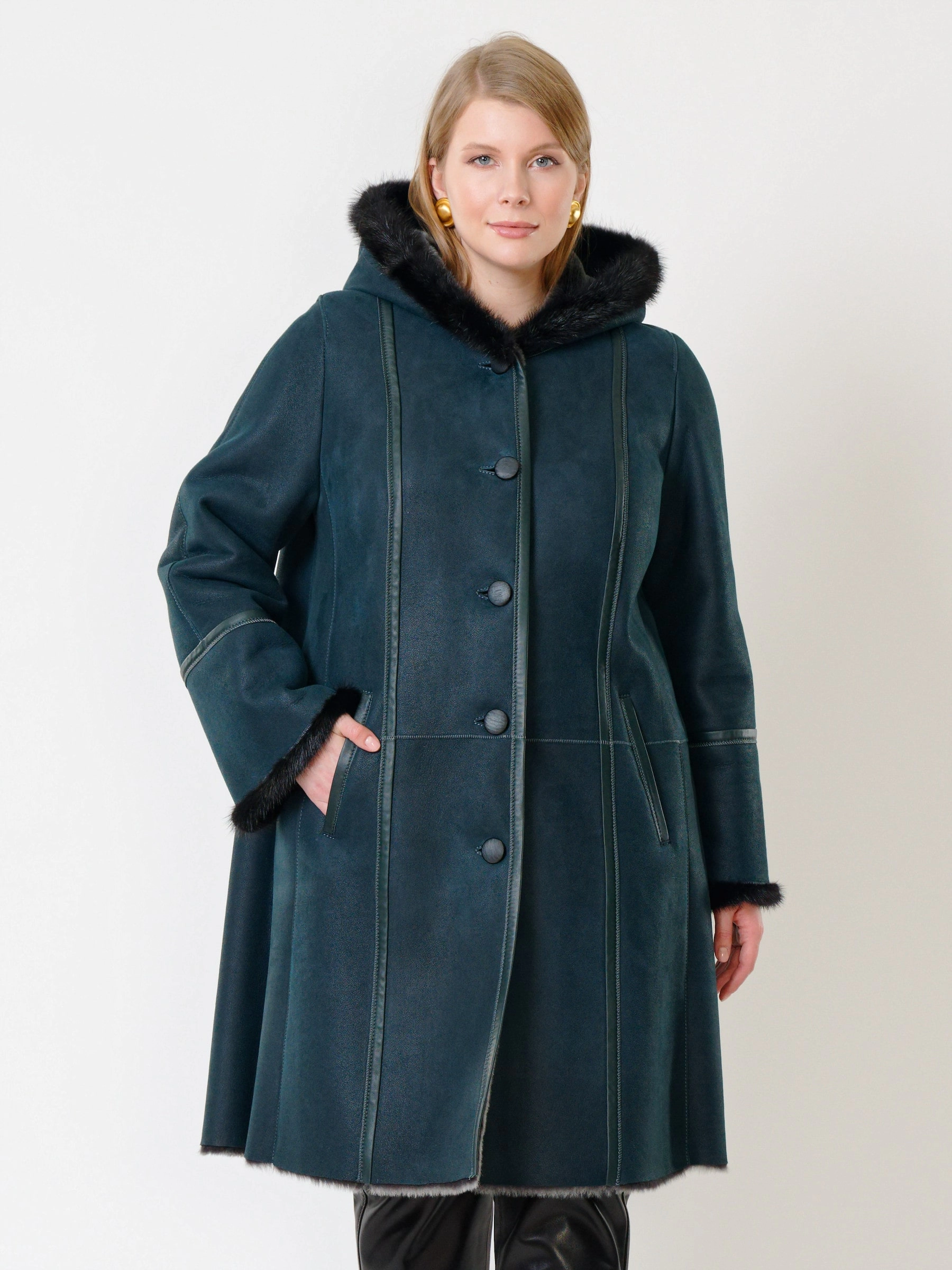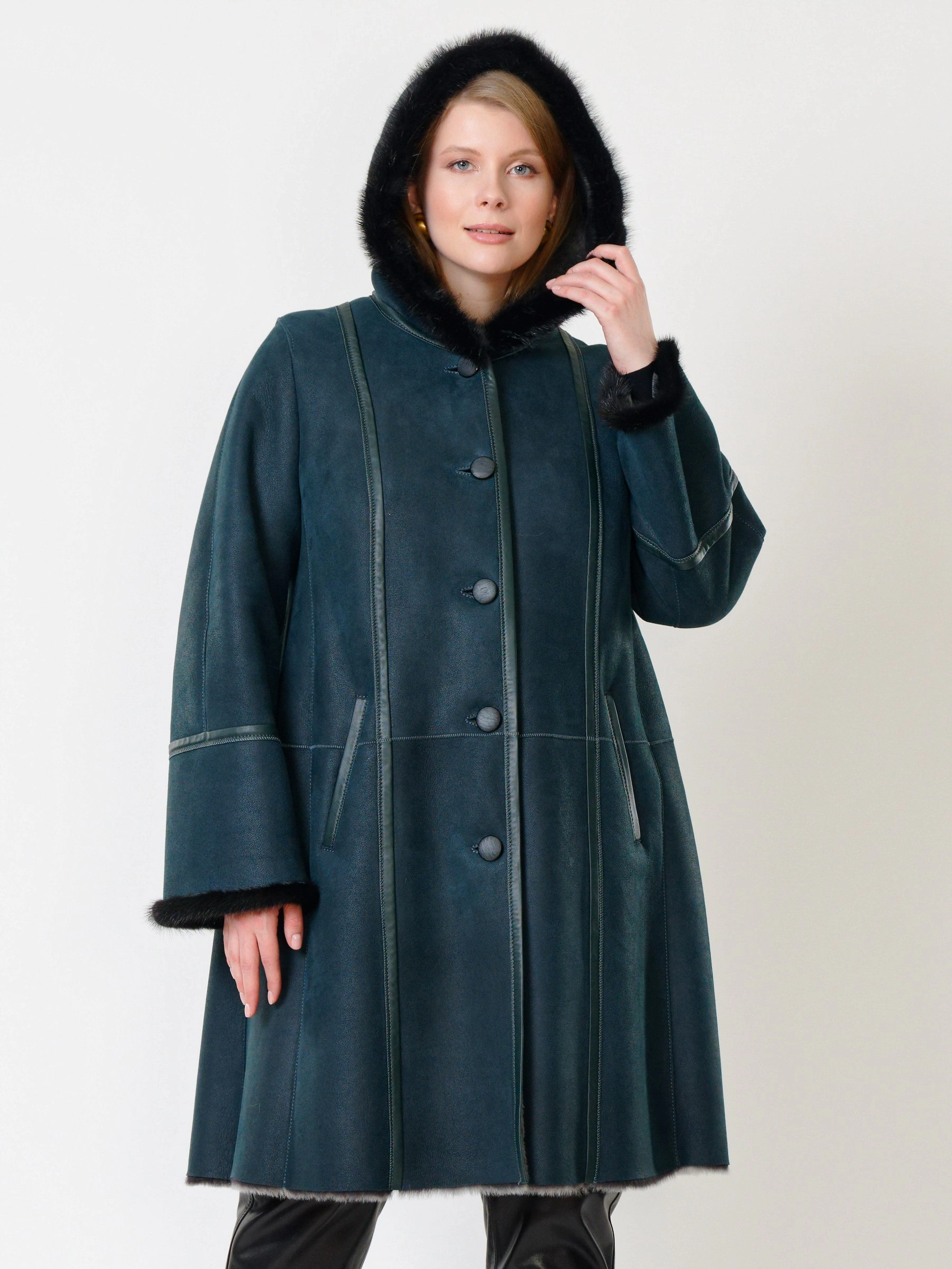 Элегантная дублёнка-трапеция на пуговицах из натуральной овчины «мерино» длиной 100 см с глубоким капюшоном с роскошной опушкой из меха норки и двумя врезными карманами создаёт утончённый тёплый образ — сочетайте её с юбкой-карандаш и высокими сапогами для безупречной элегантности.