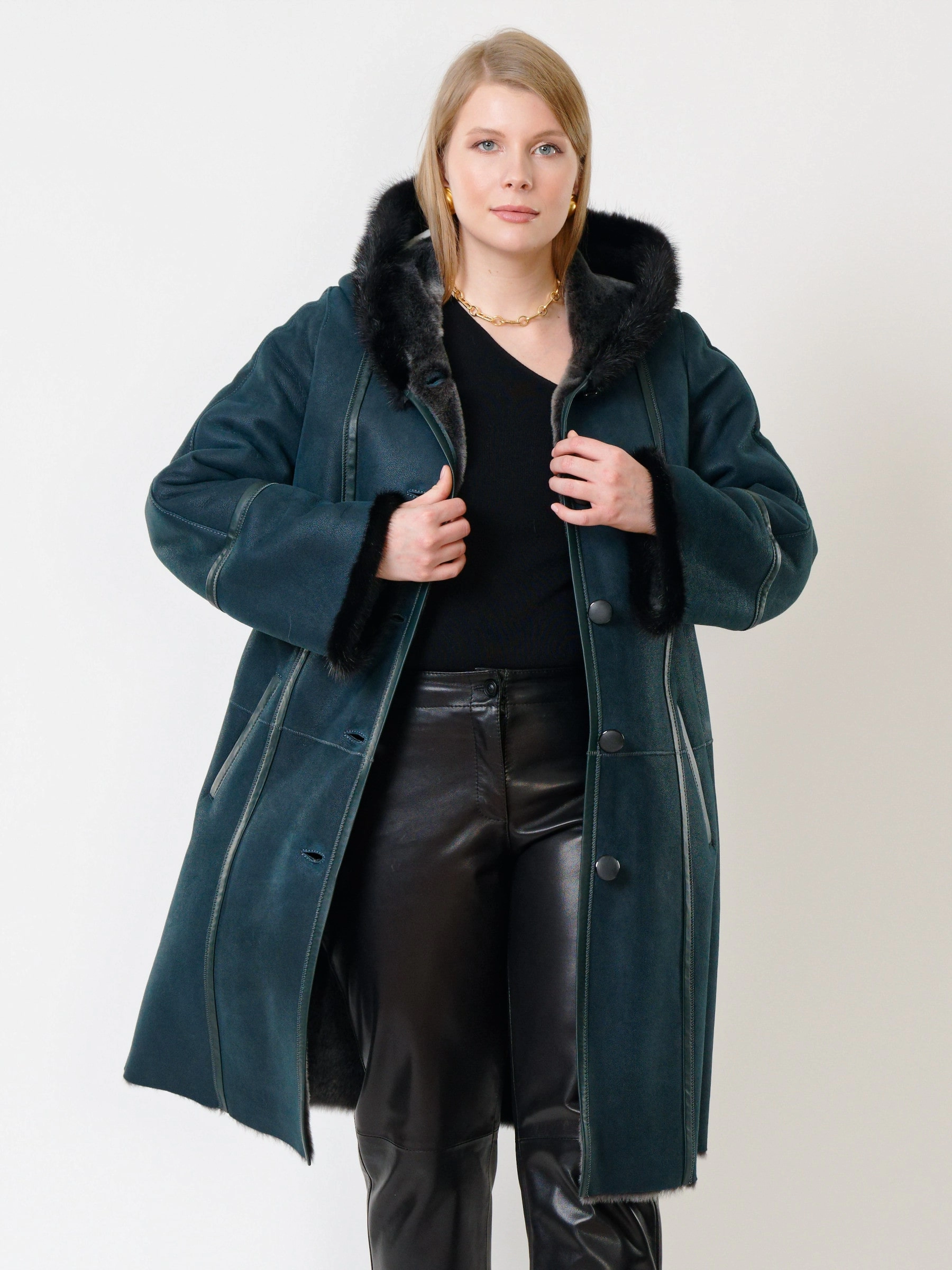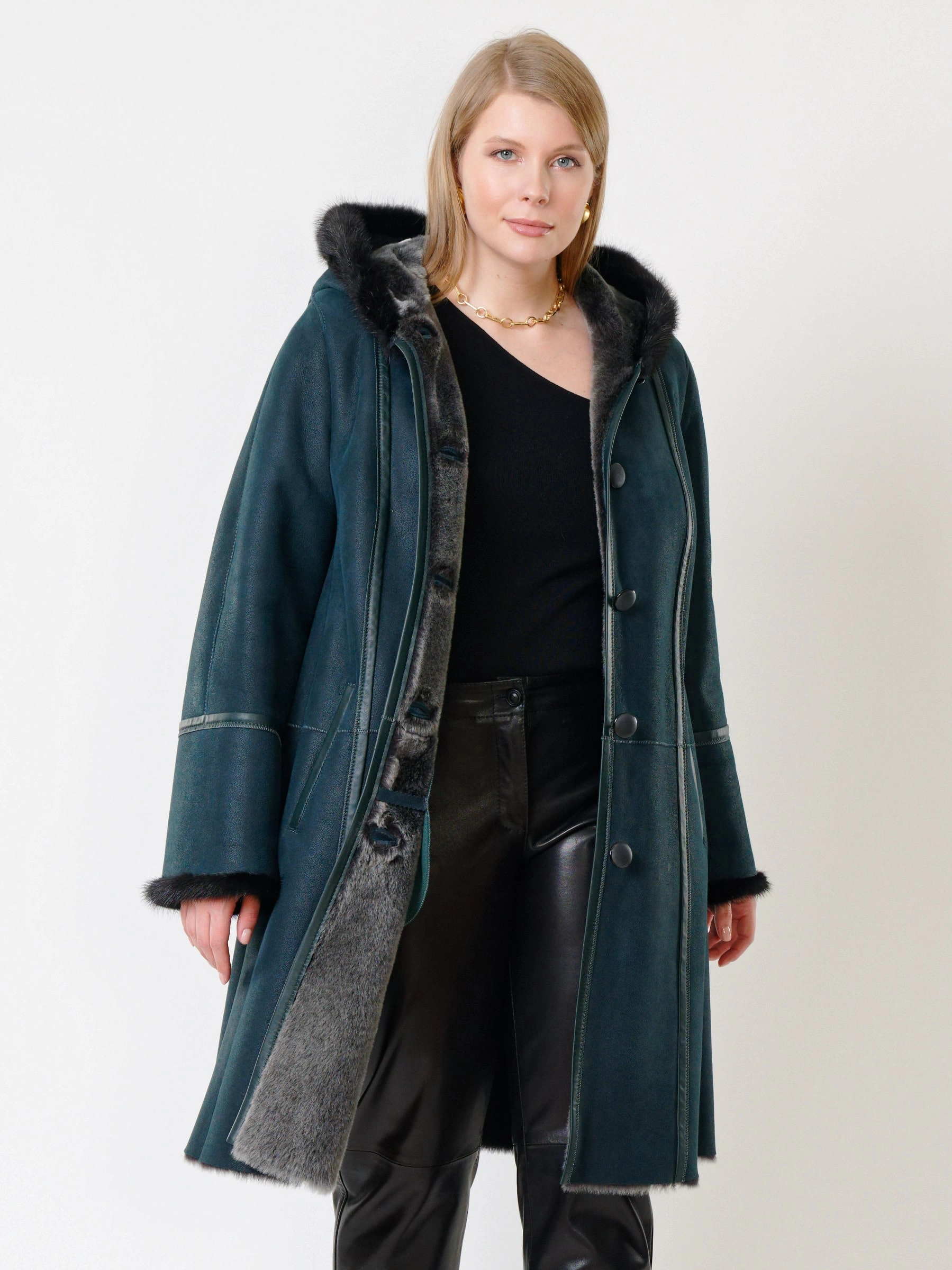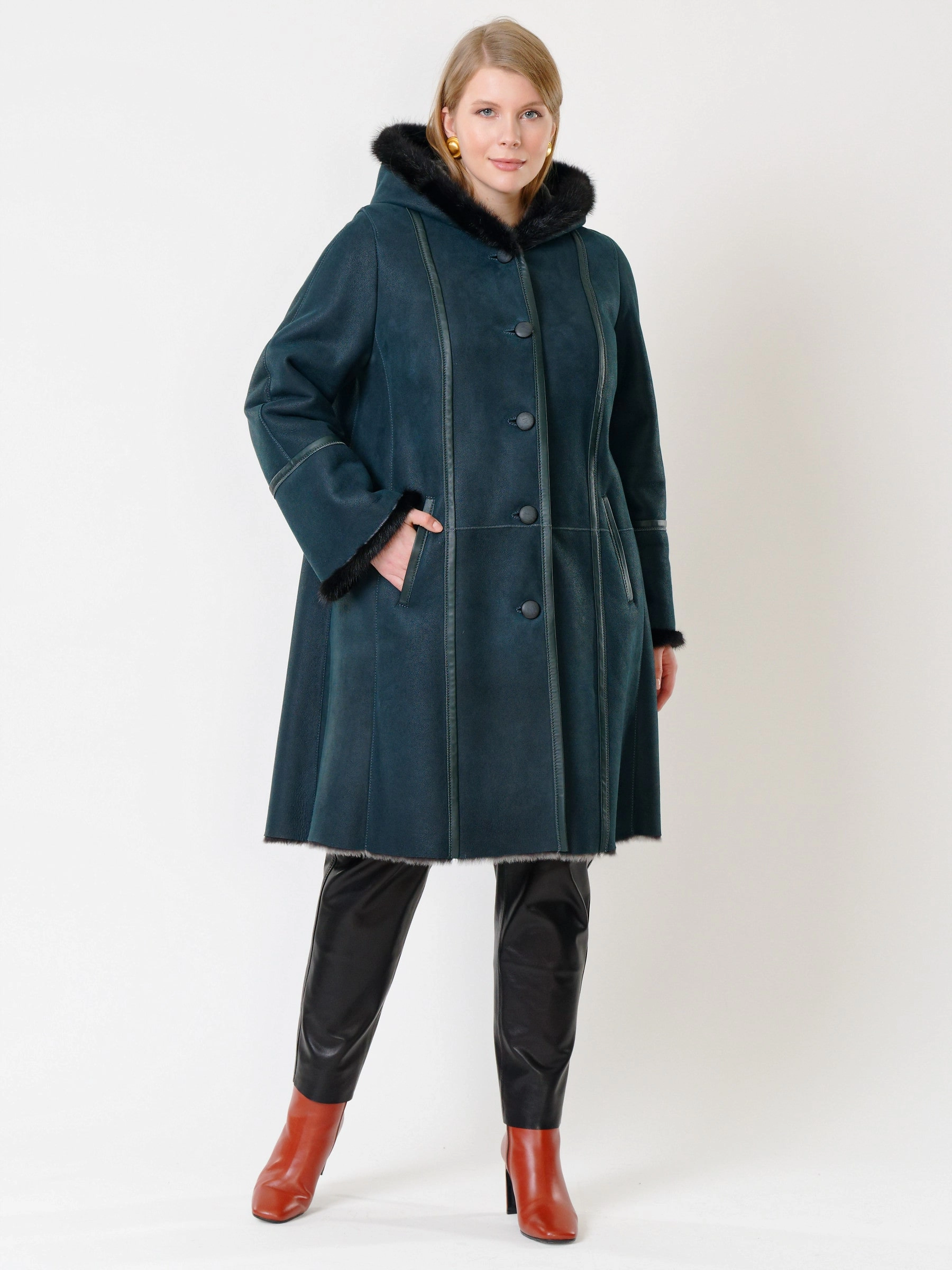 Элегантная дублёнка-трапеция на пуговицах из натуральной овчины «мерино» длиной 100 см с глубоким капюшоном с роскошной опушкой из меха норки и двумя врезными карманами создаёт утончённый тёплый образ — сочетайте её с юбкой-карандаш и высокими сапогами для безупречной элегантности.