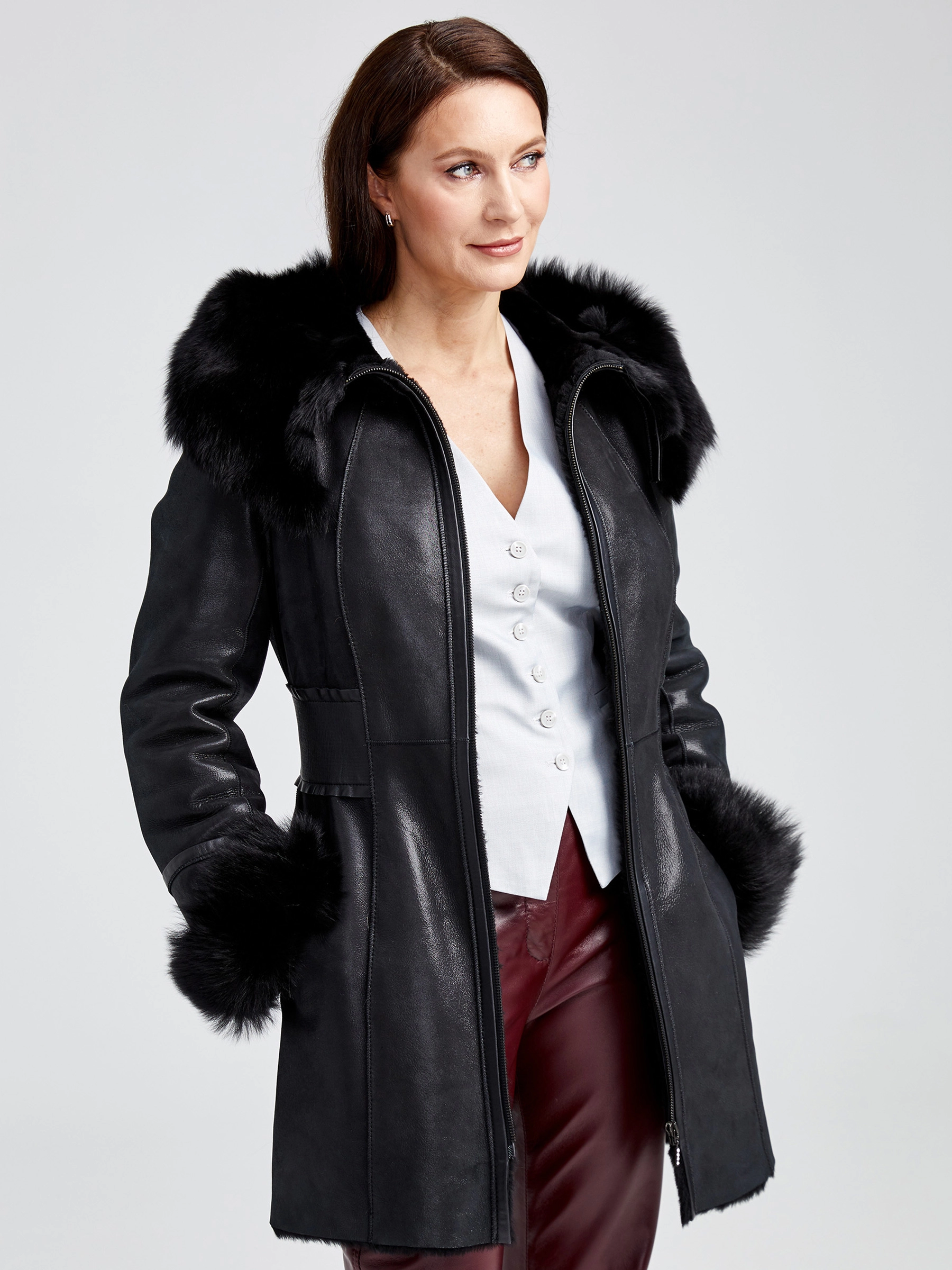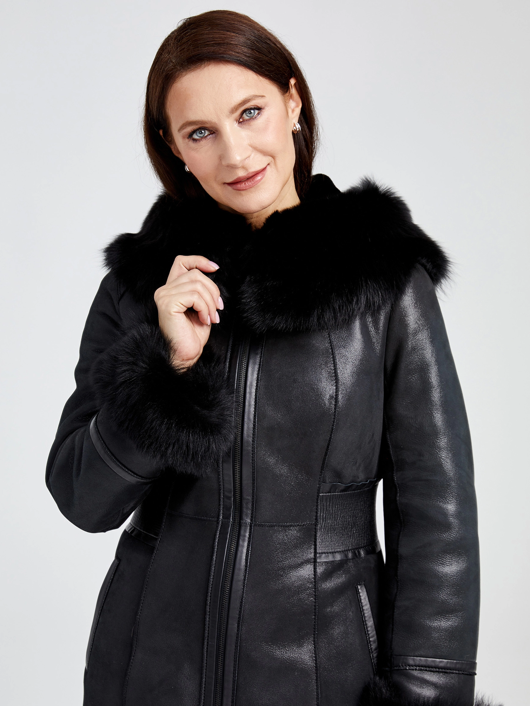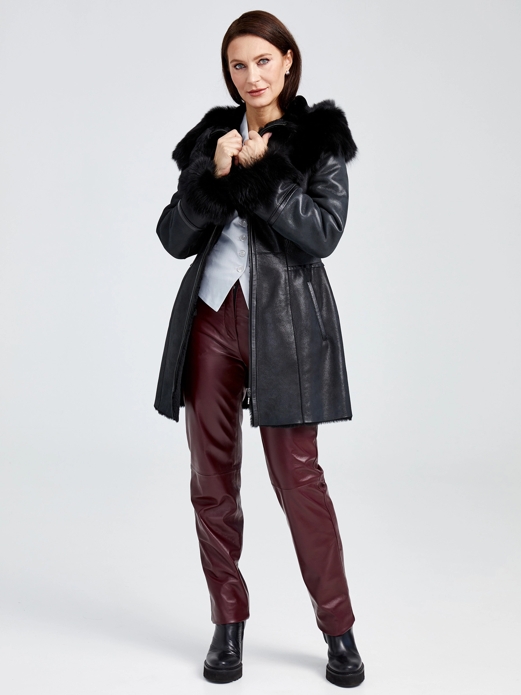 Короткая женская дубленка с капюшоном длиной 80 см на молнии, выполненная из натуральной овчины мериноса классического черного цвета. Полуприлегающий силуэт с эластичной отделкой по талии подчеркивает фигуру, а глубокий несъемный капюшон с меховой отделкой из овчины «тоскана» легко трансформируется в объемный воротник. Практичное влагоустойчивое покрытие и втачные рукава обеспечивают комфорт. Стилисты рекомендуют носить эту дубленку с черными кожаными брюками или светлыми джинсами и объемным свитером для создания элегантного повседневного образа с акцентом на фактуру меха.