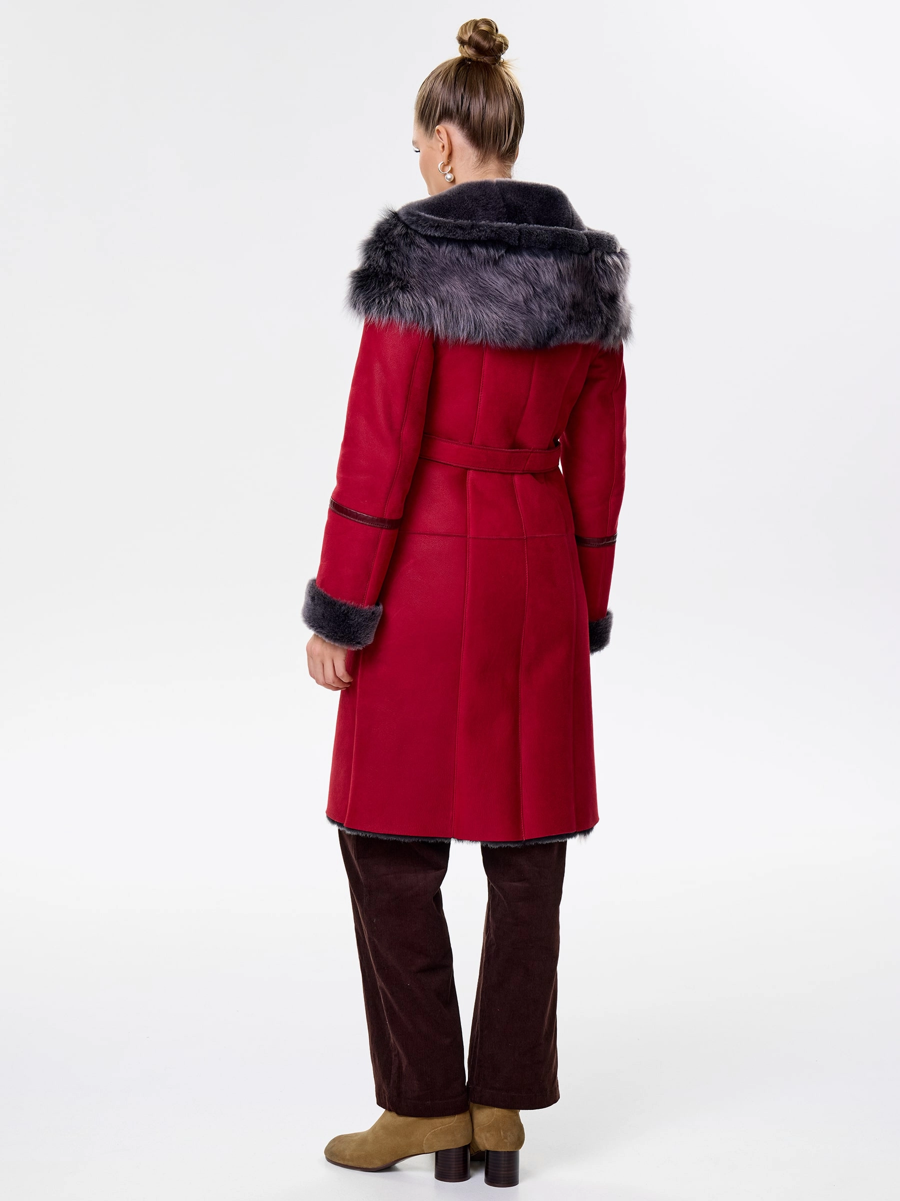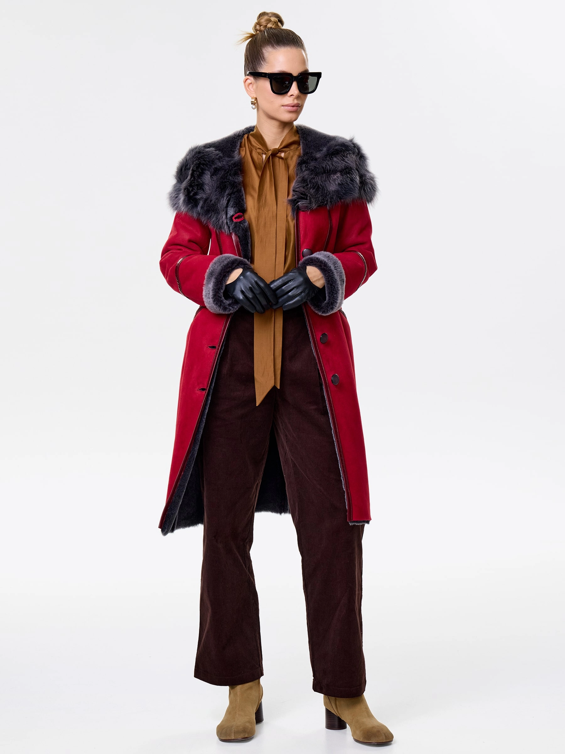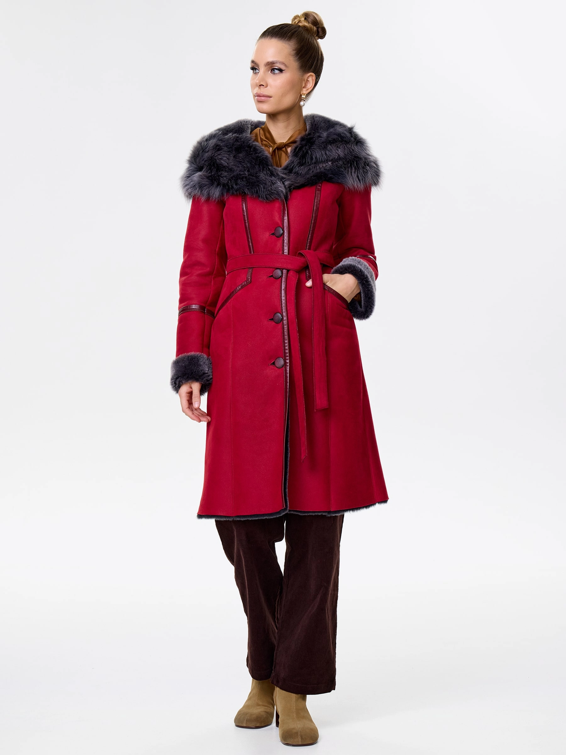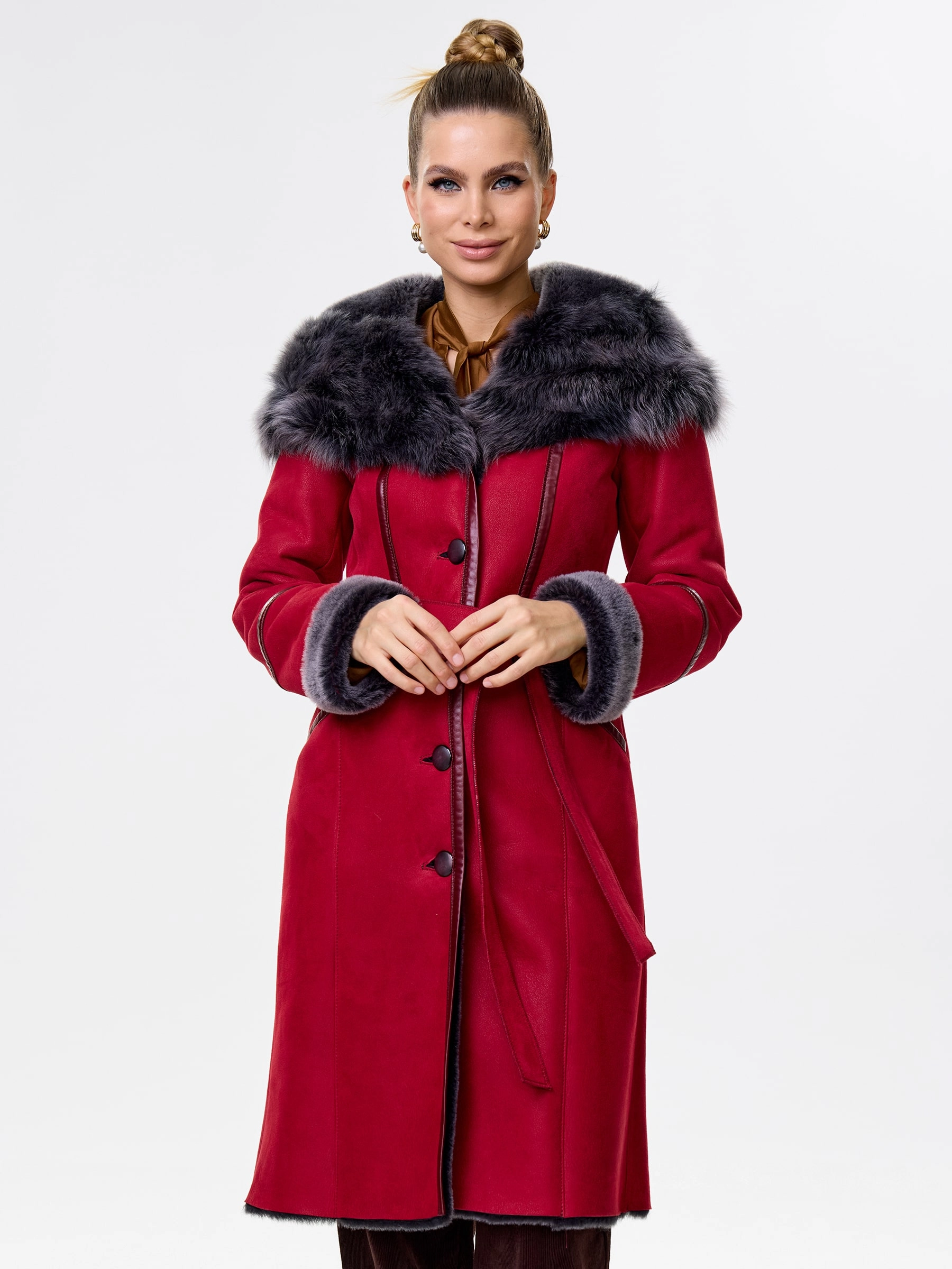 Роскошная женская дублёнка длиной 105 см из натуральной овчины «мерино». Полуприлегающий силуэт с втачными рукавами обеспечивает безупречную комфортную посадку по фигуре, подчёркивая изящество. Дублёнку дополняет глубокий несъёмный капюшон с опушью из тосканской овчины, дарящий тепло в любую стужу. Длинный пояс подчеркнёт талию, а застёжка на пуговицы и два боковых кармана добавят удобства и классического шарма. Идеальна с джинсами и свитером для повседневного шика или с платьями и юбками для элегантного выхода.