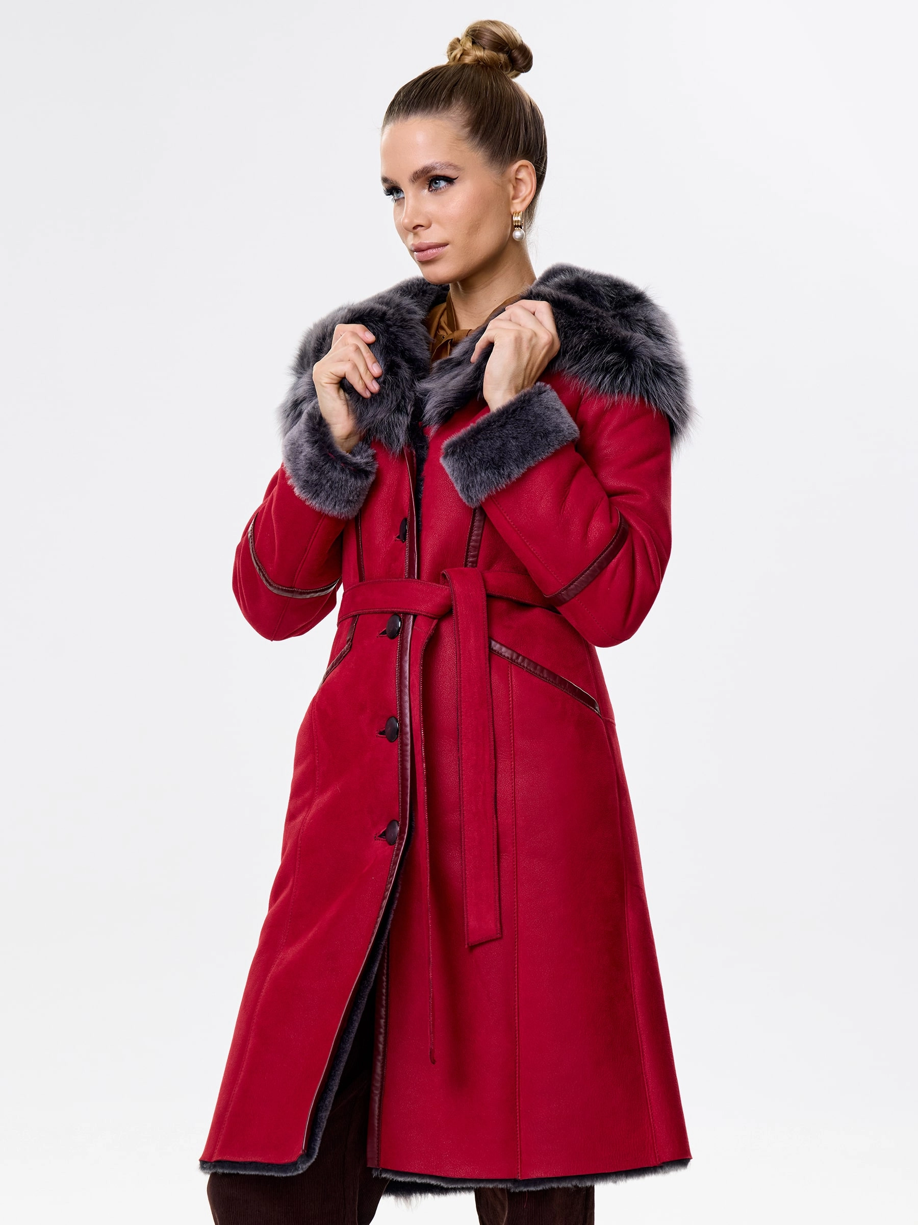 Товар женская дубленка с капюшоном из тосканы 263, красная, размер 44, артикул 61931 выполнен из овчина "мерино" с застежкой пуговицы. Рассчитан на сезон: осень-зима. Длина изделия 105 см, силуэт полуприлегающий.