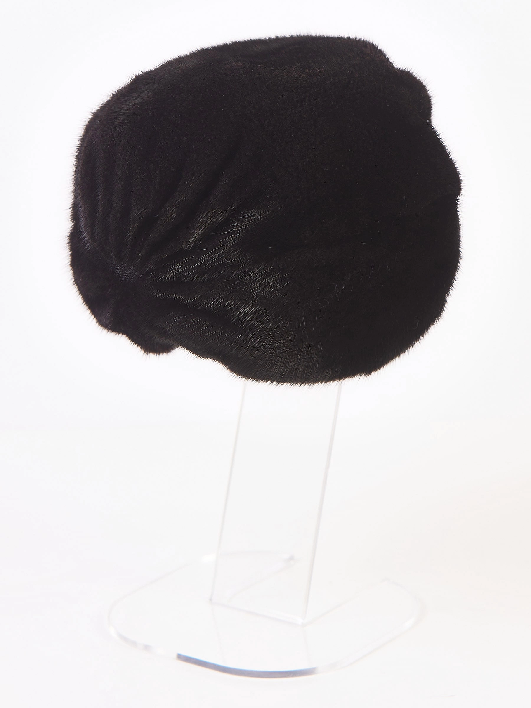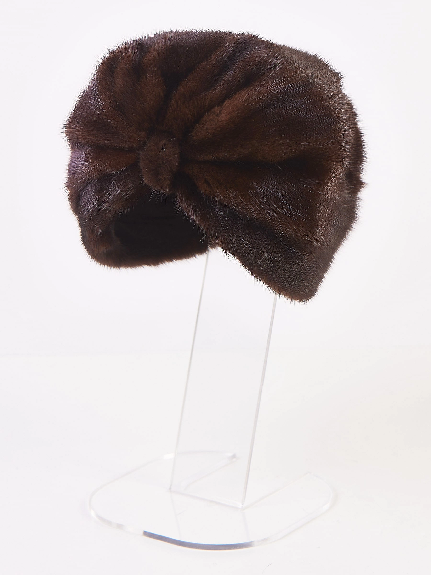 Эту модель выполнили из однотонной шелковистой густой норки, которая хорошо сохраняет тепло. Спереди модель дополнили перемычкой, создающей эффект чалмы.