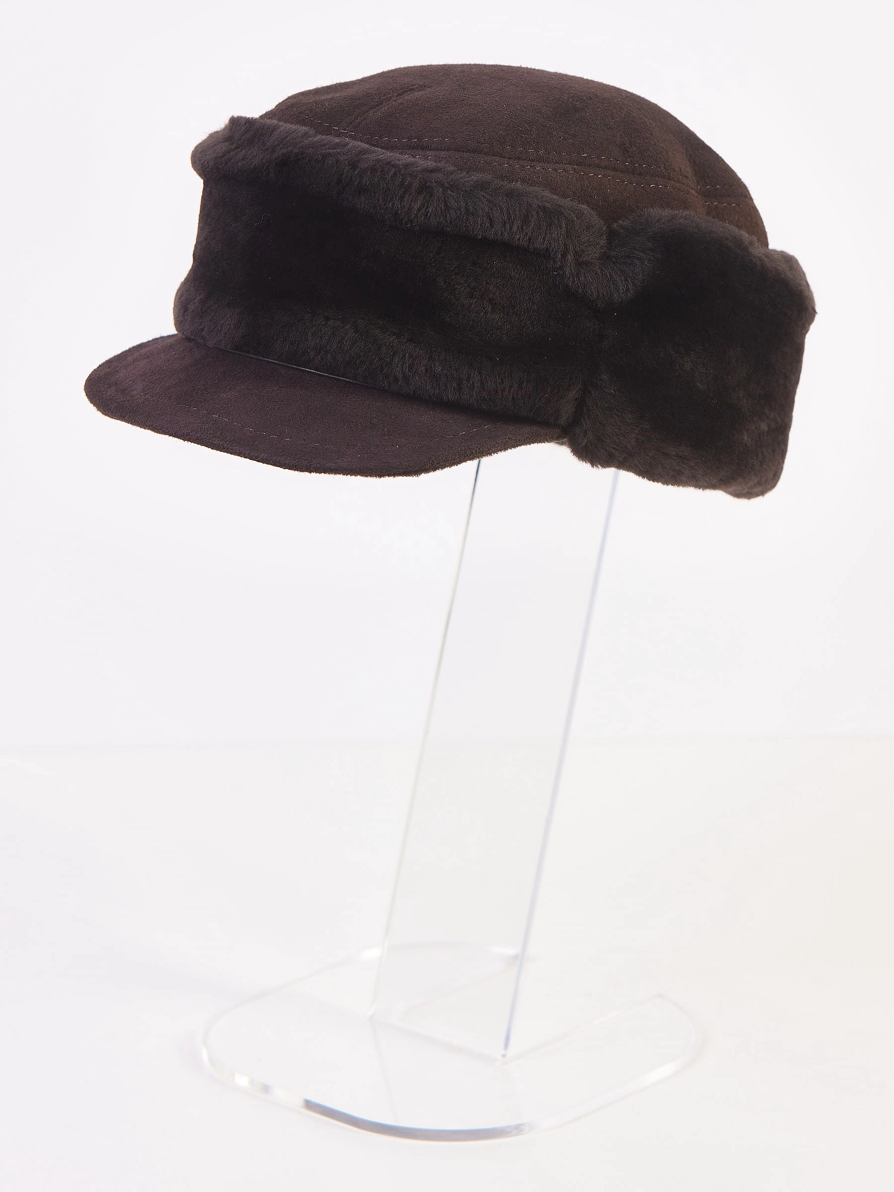Очень легкий, но тем не менее теплый головной убор выполнен из плотной овчины. Жесткий козырек. Для максимальной защиты от ветра у аксессуара имеется меховой отворот.
