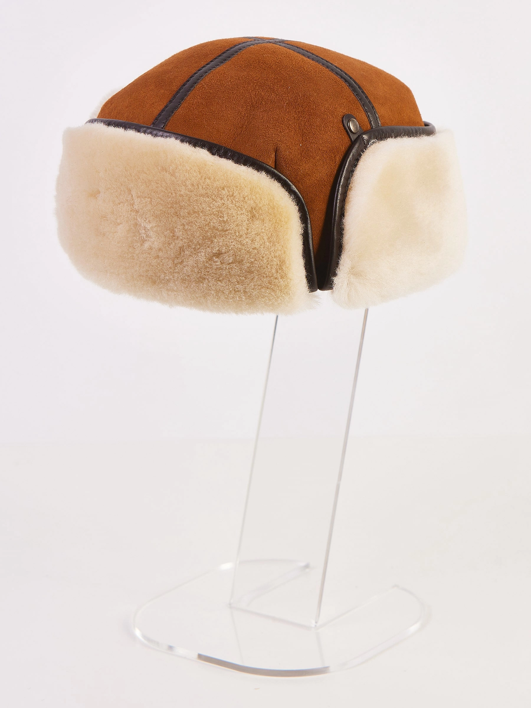 Мужской головной убор выполнен из плотной меховой овчины. Лицевая сторона из натуральной замши. Ветрозащитный клапан фиксируется кнопками и опускается.