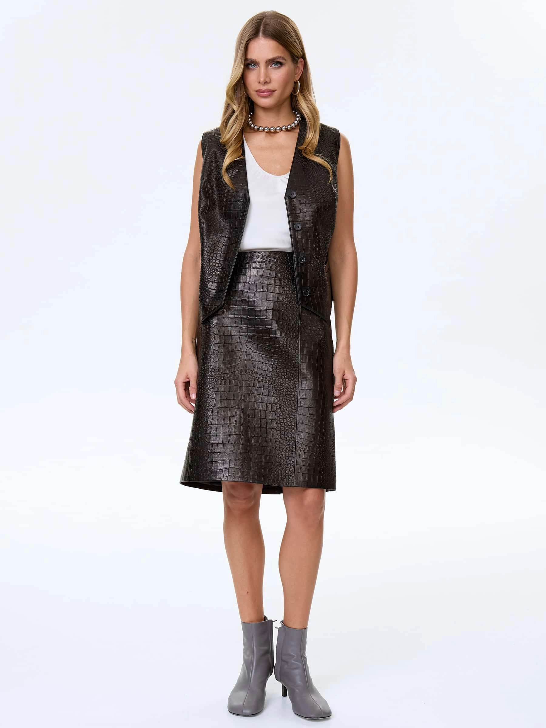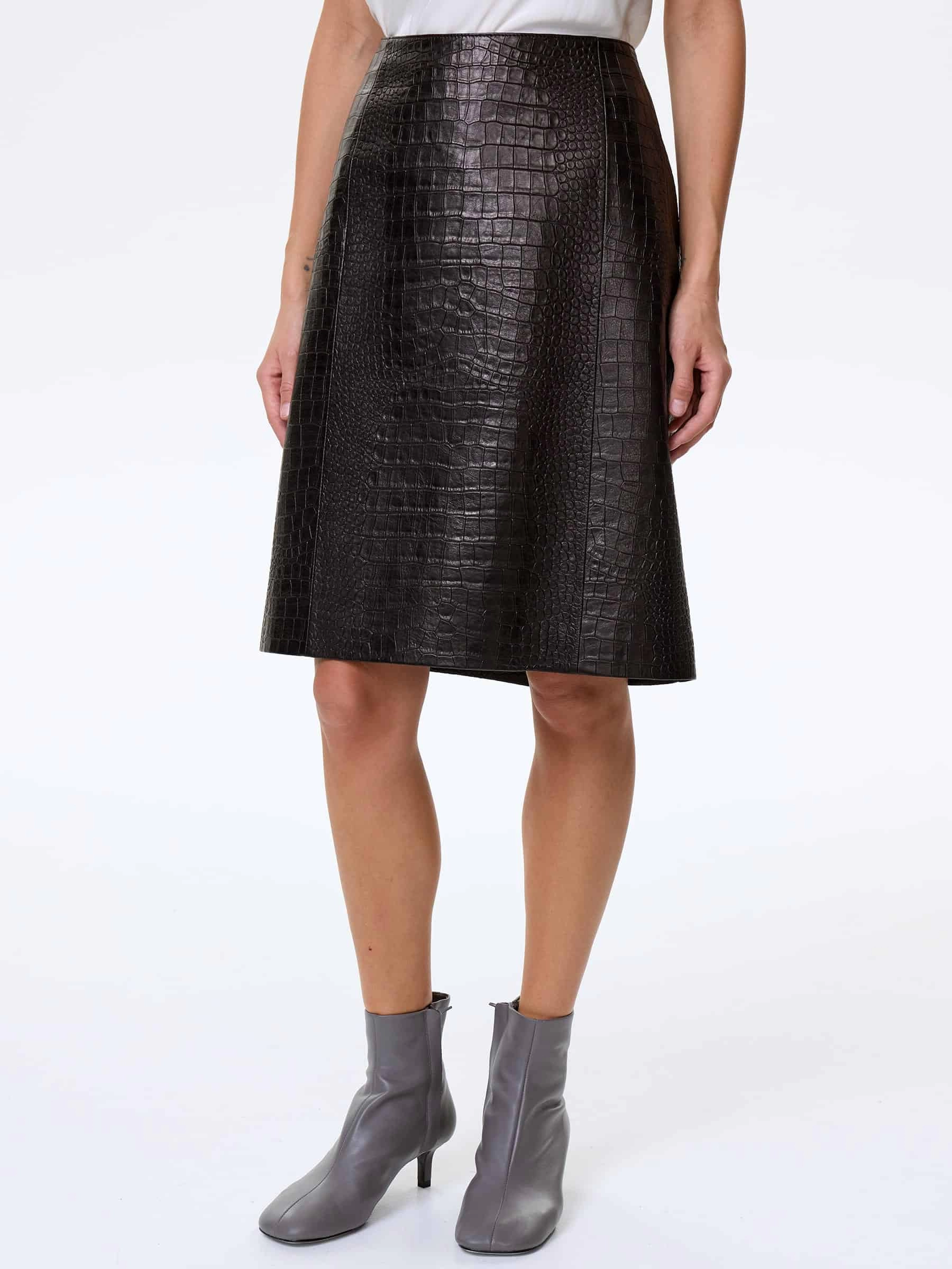 Юбка из мягкой натуральной кожи с эффектным тиснением под крокодила в глубоком черном цвете — образец элегантности и безупречного кроя. Изысканный блеск кожи, удобная застежка и лаконичный силуэт без пояса делают эту модель универсальной основой гардероба. Носите ее с классическими блузами для работы, с массивными джемперами для прогулок или с облегающими топами для вечера — благородная фактура кожи гарантирует безупречный вид в любой ситуации.