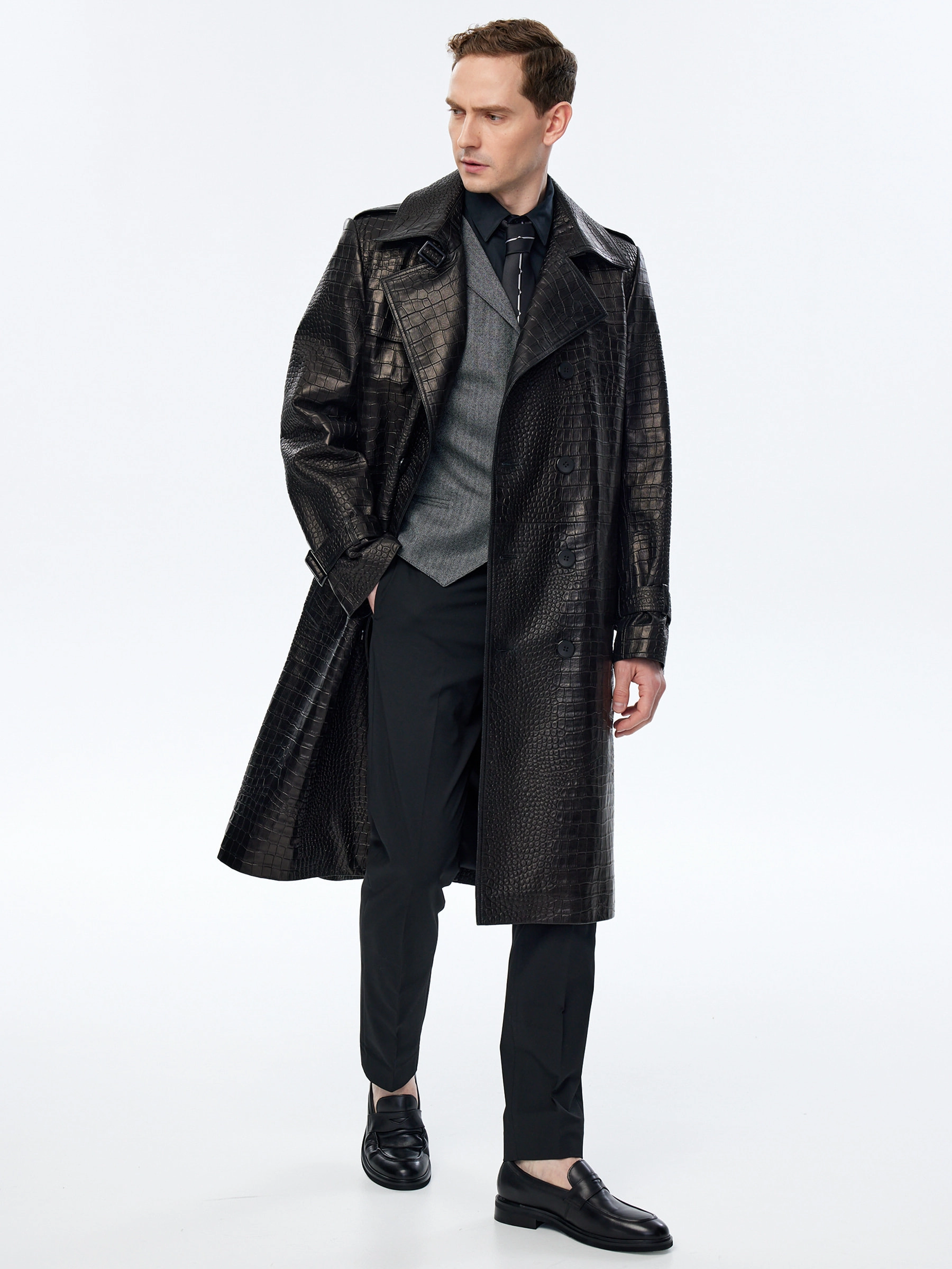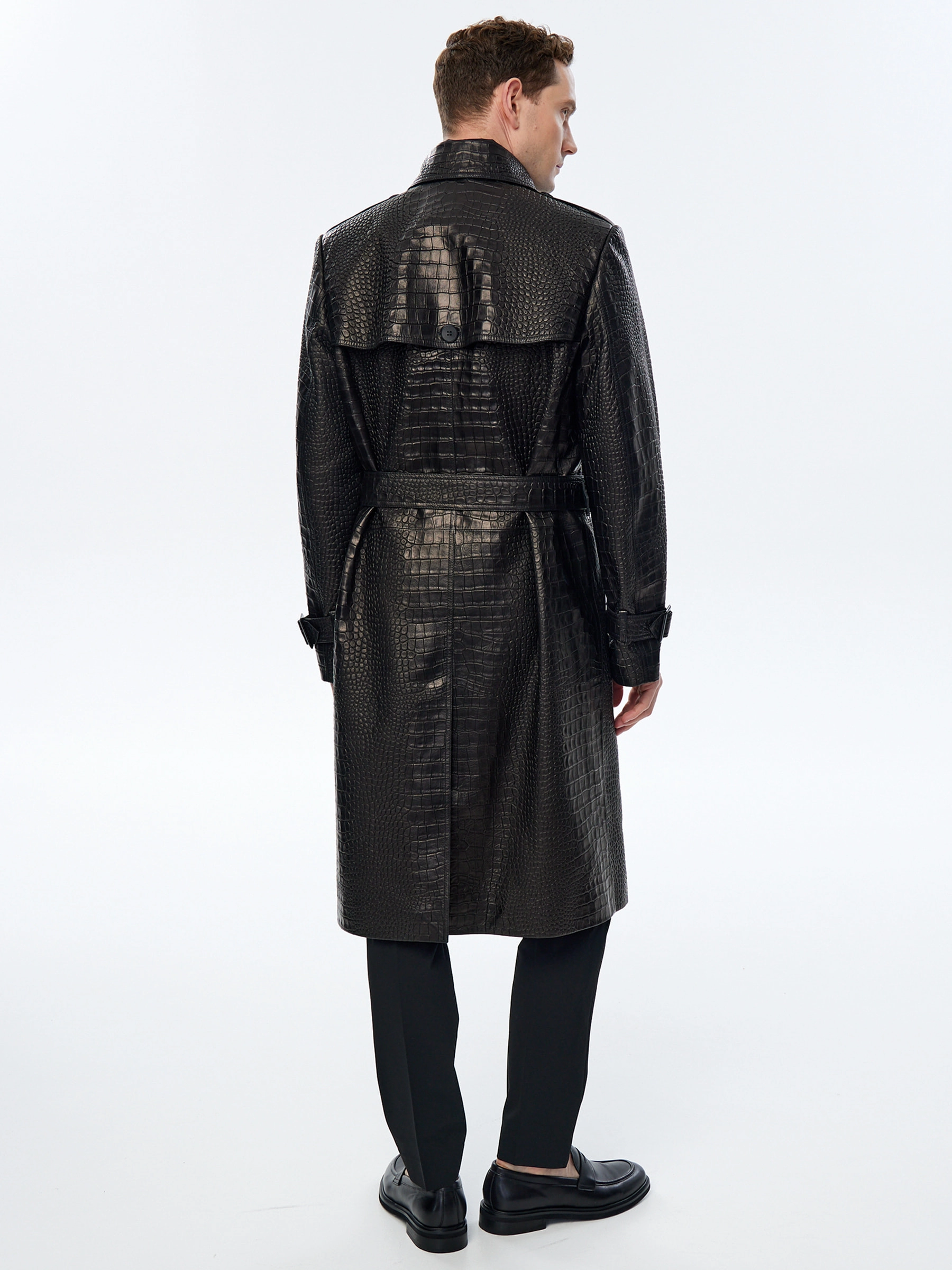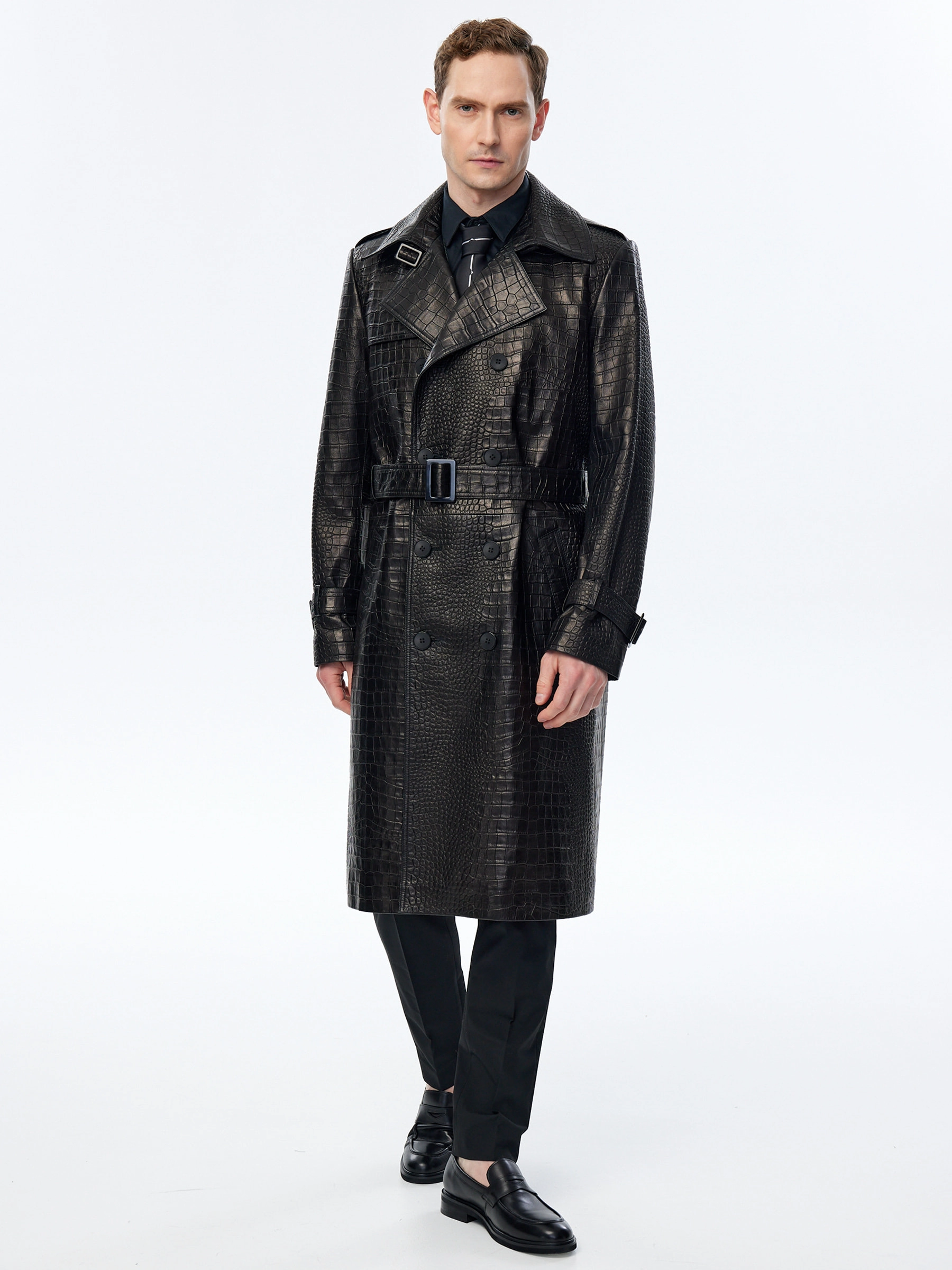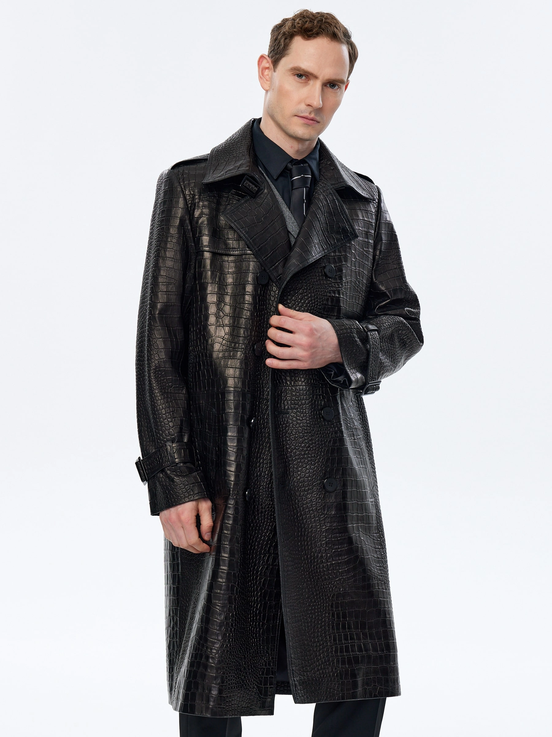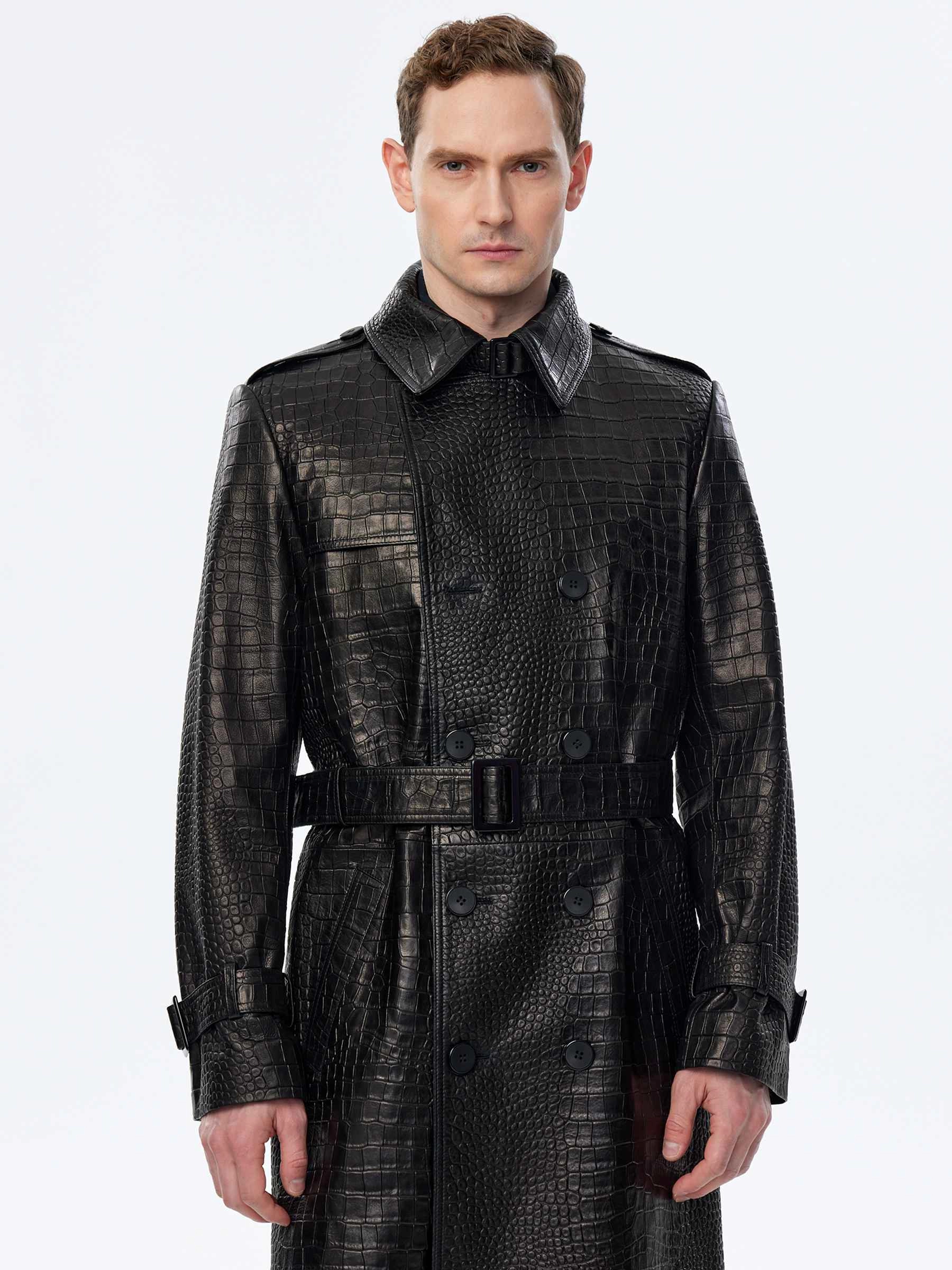 Классическое двубортное кожаное пальто с полным отсутствием декора из мягкой кожи кроко премиального качества. Широкие лацкана и два боковые кармана. Идеальное сочетание с любыми брюками.