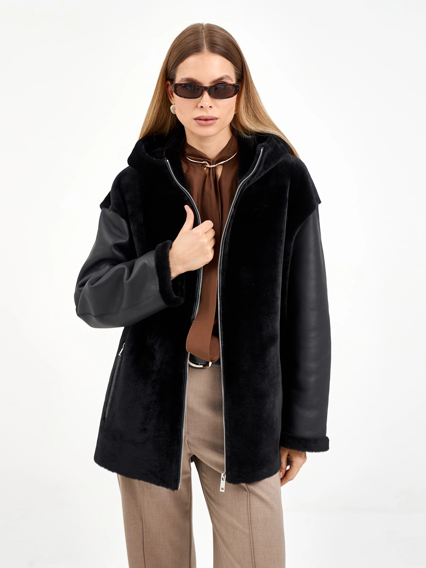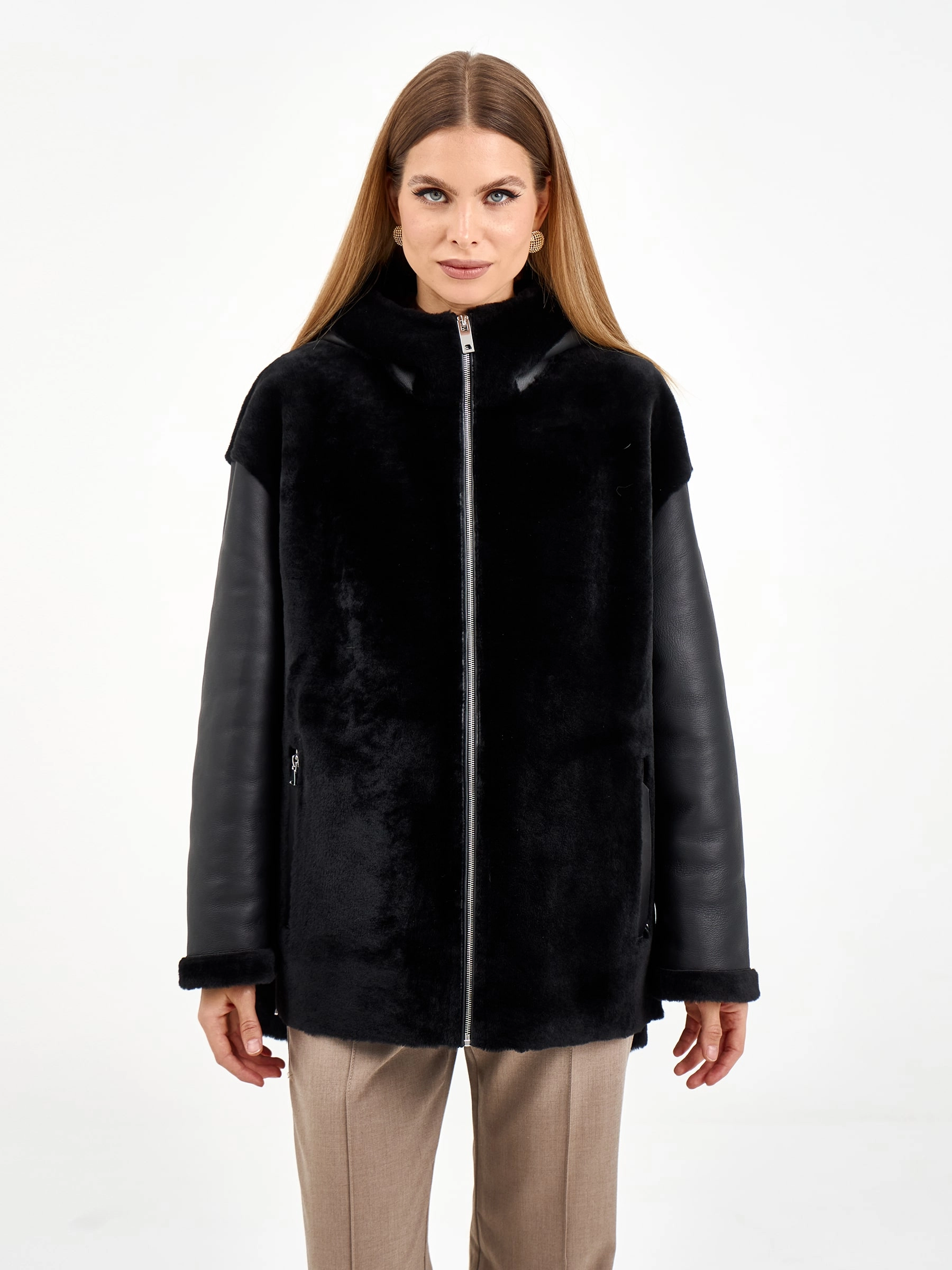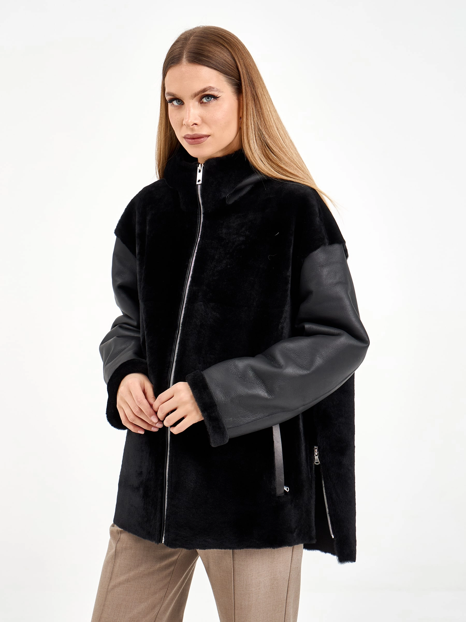 Короткая комбинированная дубленка из овчины мерино с кожаными рукавами. Модель свободного кроя длиной 75 см с воротником-стойкой и спущенным рукавом сочетает смелые текстурные контрасты. Боковые разрезы и врезные карманы застегиваются на молнии, подчеркивая современный дизайн. Стилисты рекомендуют носить с монохромными базовыми вещами — черными узкими джинсами, водолазкой и кожаными ботильонами, чтобы выразительная фактура дубленки стала центром образа. Идеальный выбор для создания смелого городского образа, где дерзкая эстетика встречается с непревзойденным комфортом.