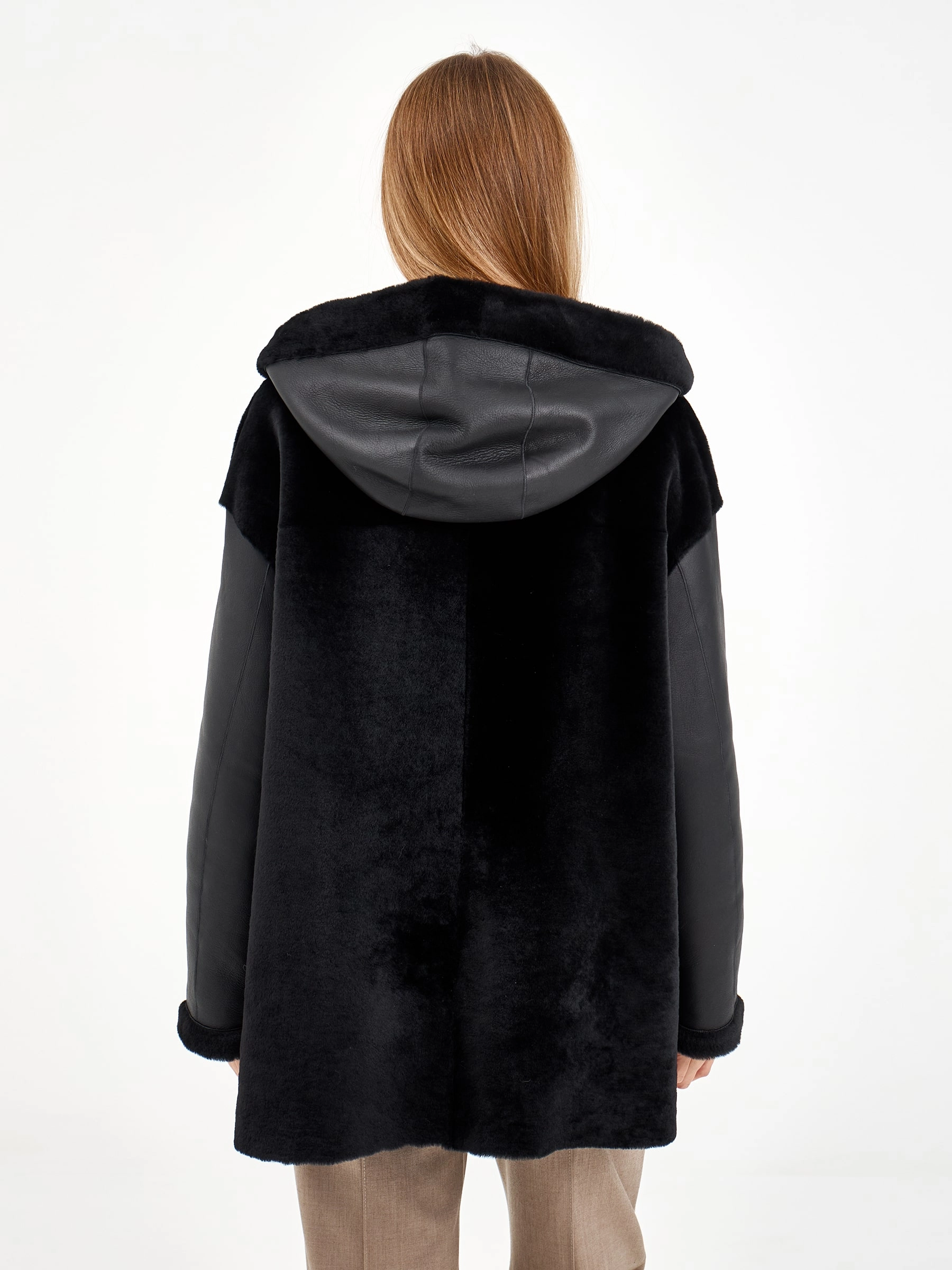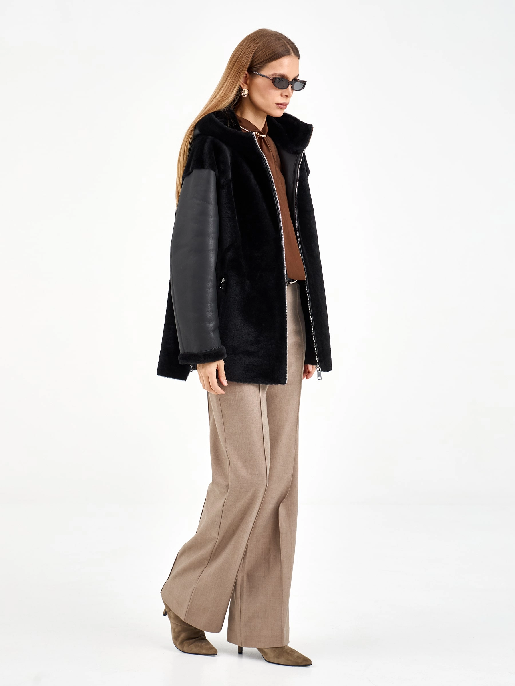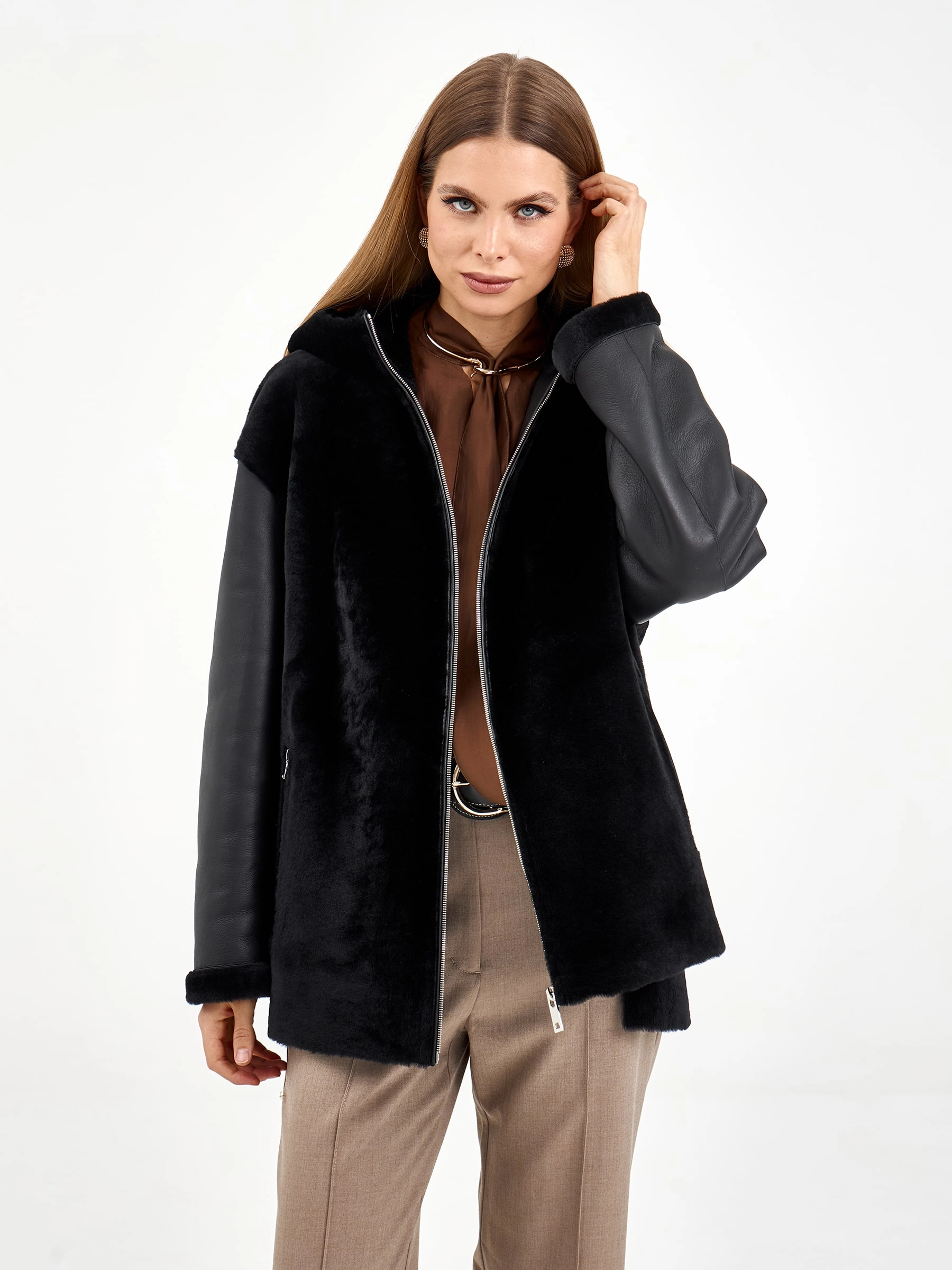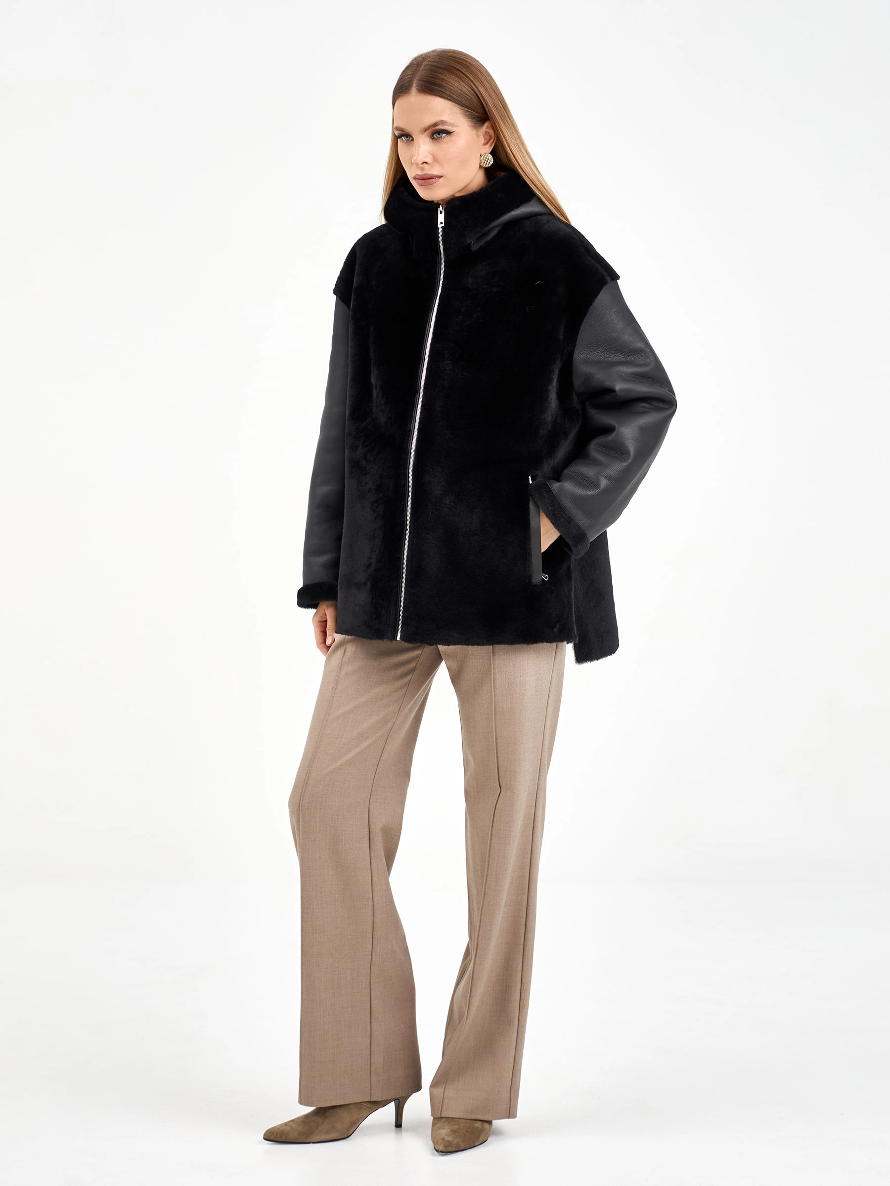 Короткая комбинированная дубленка из овчины мерино с кожаными рукавами. Модель свободного кроя длиной 75 см с воротником-стойкой и спущенным рукавом сочетает смелые текстурные контрасты. Боковые разрезы и врезные карманы застегиваются на молнии, подчеркивая современный дизайн. Стилисты рекомендуют носить с монохромными базовыми вещами — черными узкими джинсами, водолазкой и кожаными ботильонами, чтобы выразительная фактура дубленки стала центром образа. Идеальный выбор для создания смелого городского образа, где дерзкая эстетика встречается с непревзойденным комфортом.