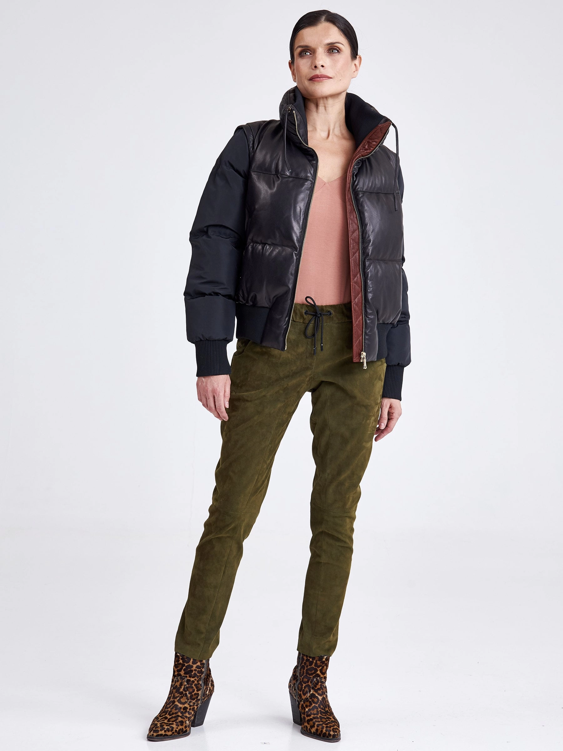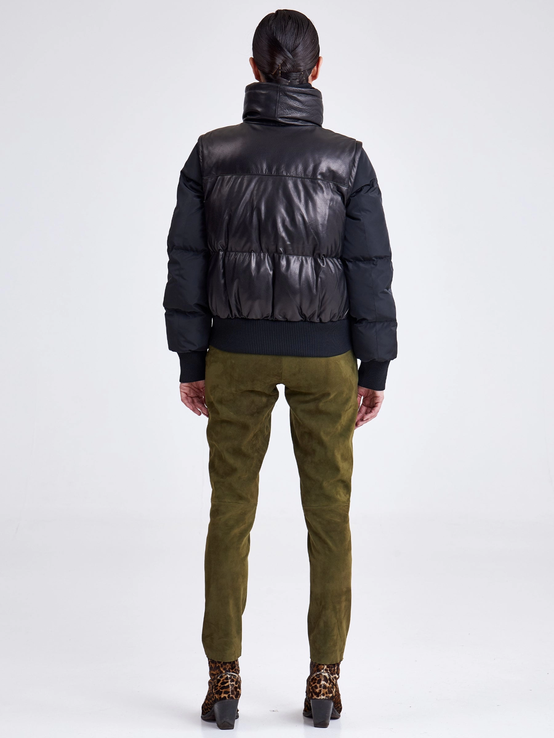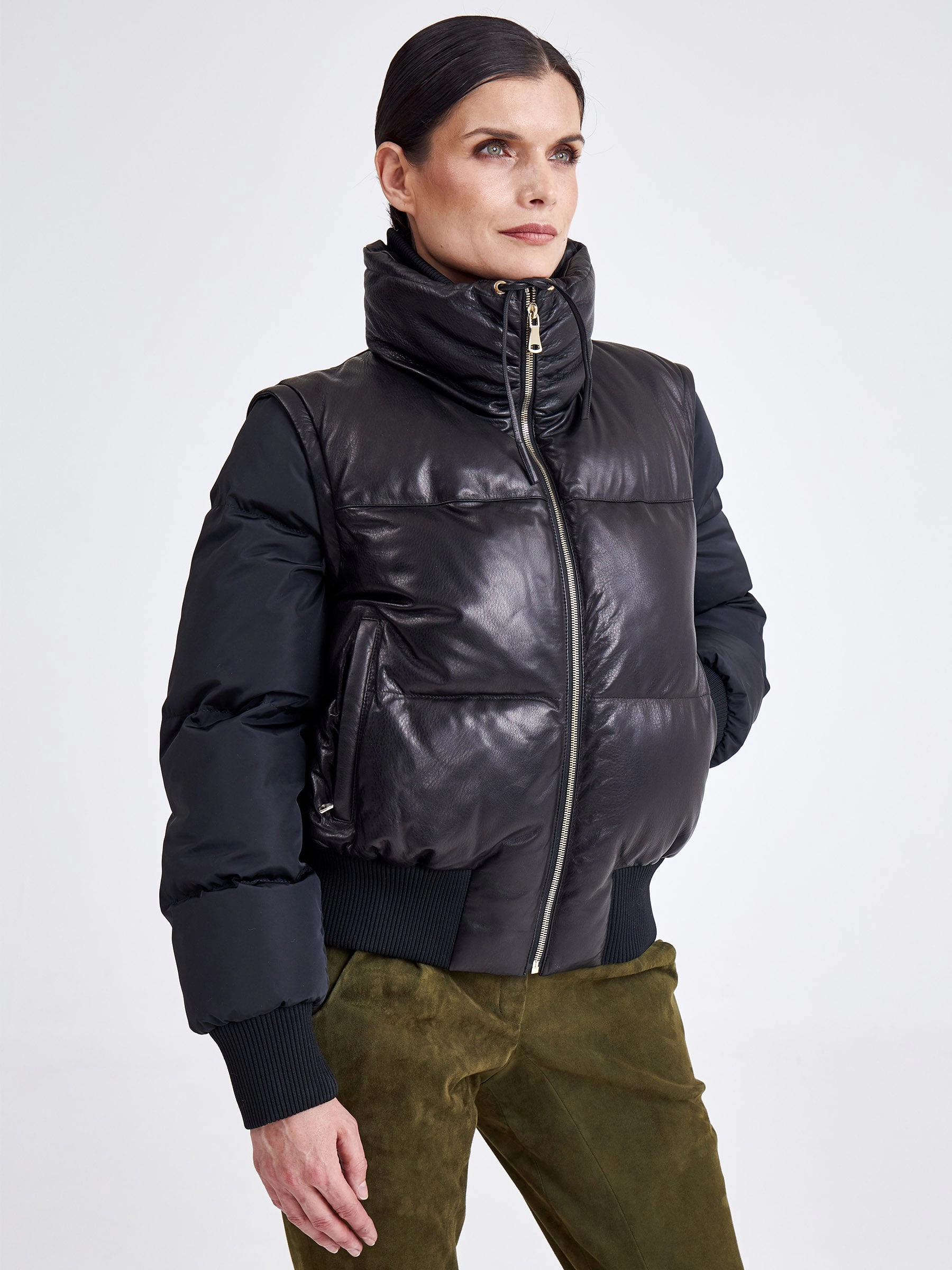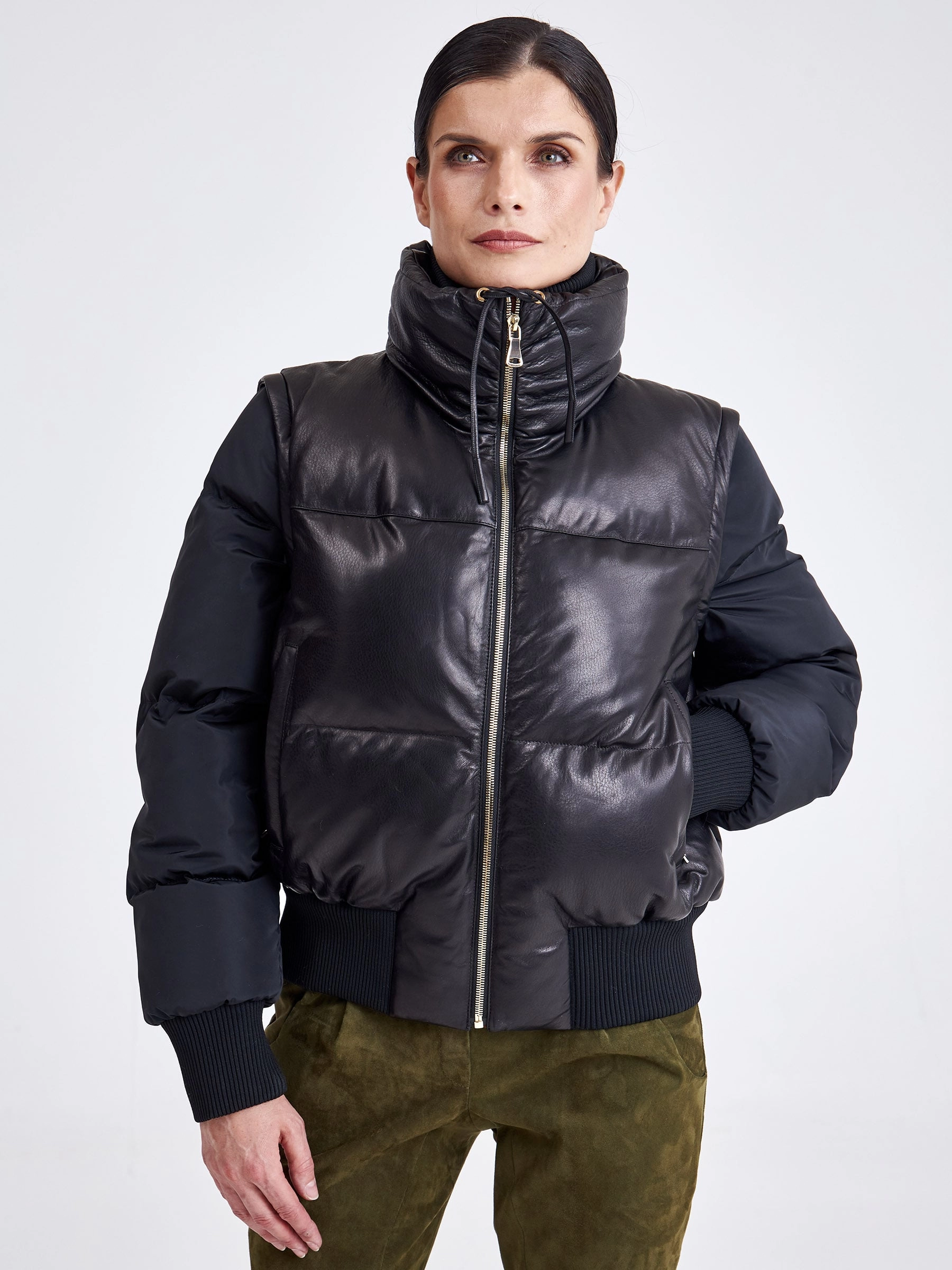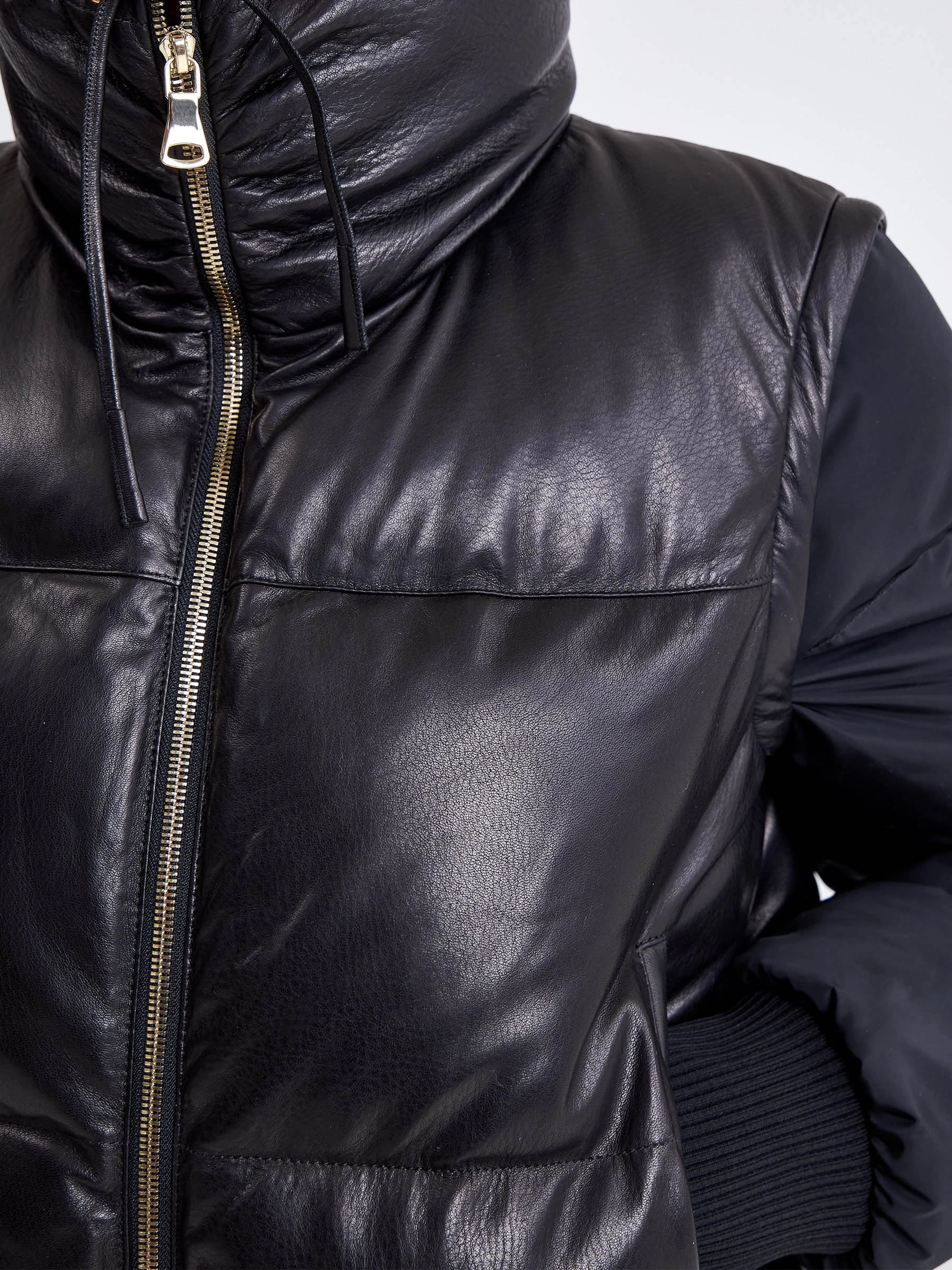 Черный укороченный пуховик премиум-класса, выполненный из натуральной кожи и водоотталкивающей ткани спортивного кроя, станет ключевой вещью в вашем межсезонном гардеробе. Его универсальная длина до середины бедра (51-74 см) и практичность благодаря отстёгивающимся рукавам позволяют создавать разные образы: от спортивного аутфита с кроссовками до элегантного лука с жилеткой поверх платья. Плотные трикотажные манжеты и двойной воротник-стойка надёжно защищают от ветра, а легкий немецкий синтепон Freudenberg внутри гарантирует отличную теплоизоляцию, воздухопроницаемость и простой уход. Совет стилиста: носите его с прямыми джинсами и базовым верхом для повседневного образа или используйте как жилет, чтобы добавить фактуры и дерзости деловому костюму или объёмному свитеру.