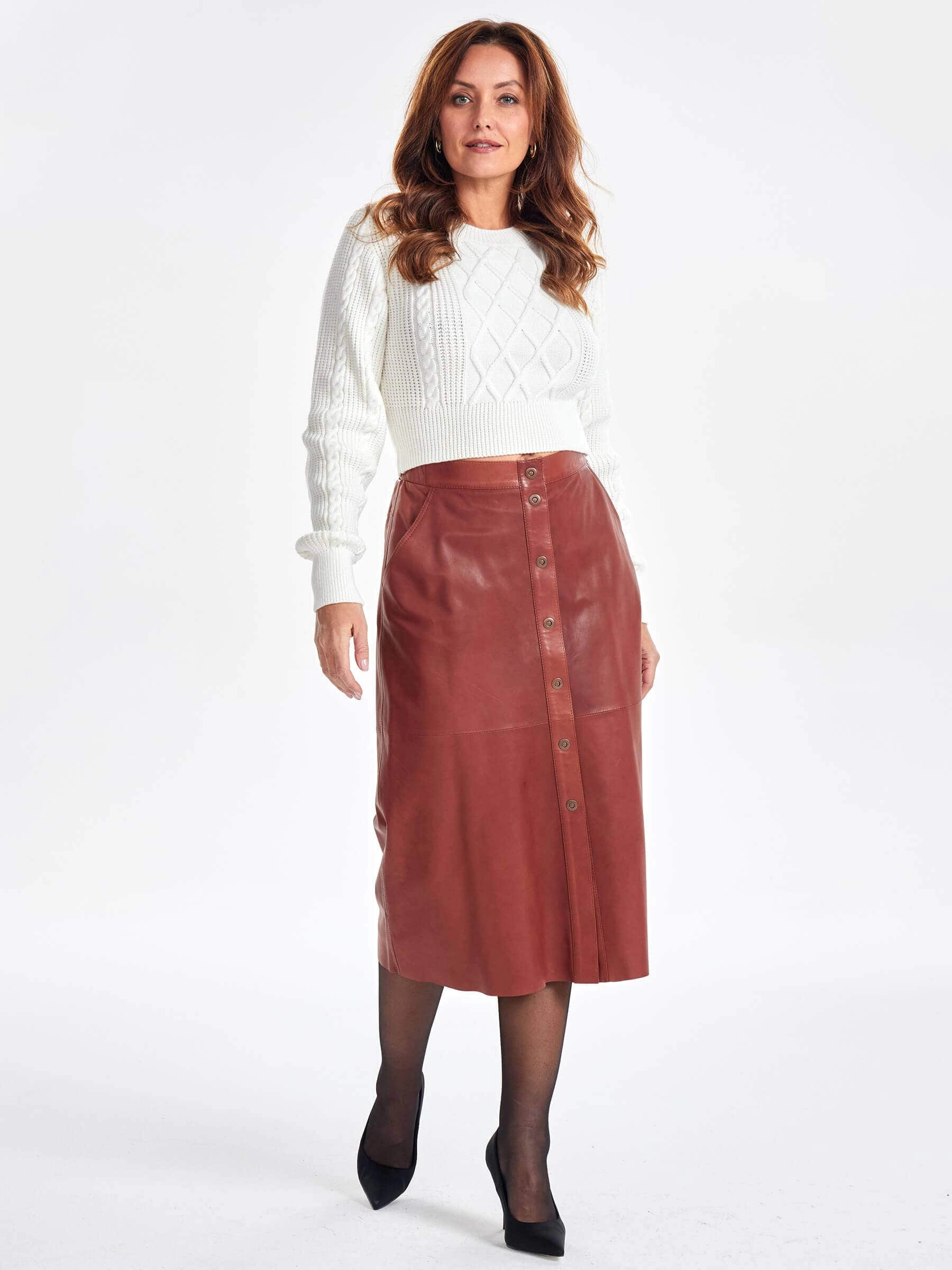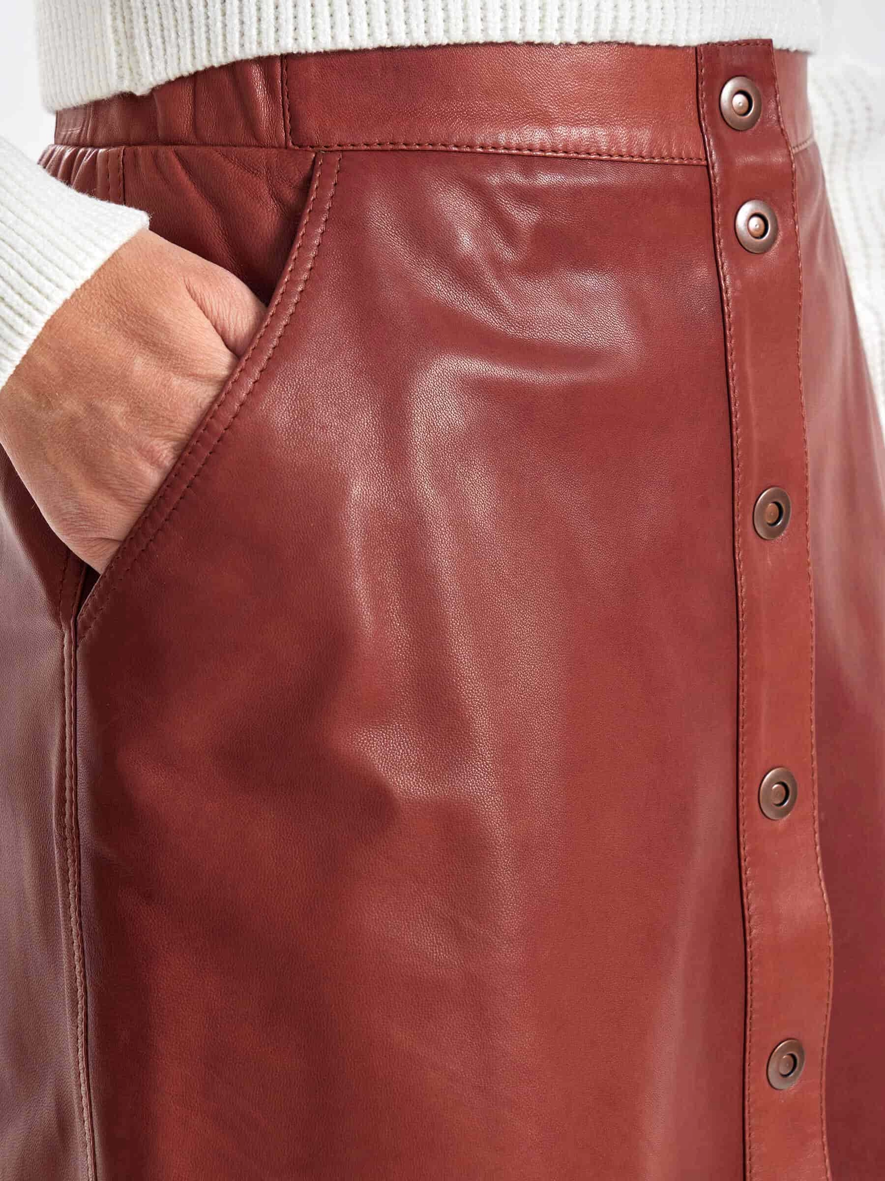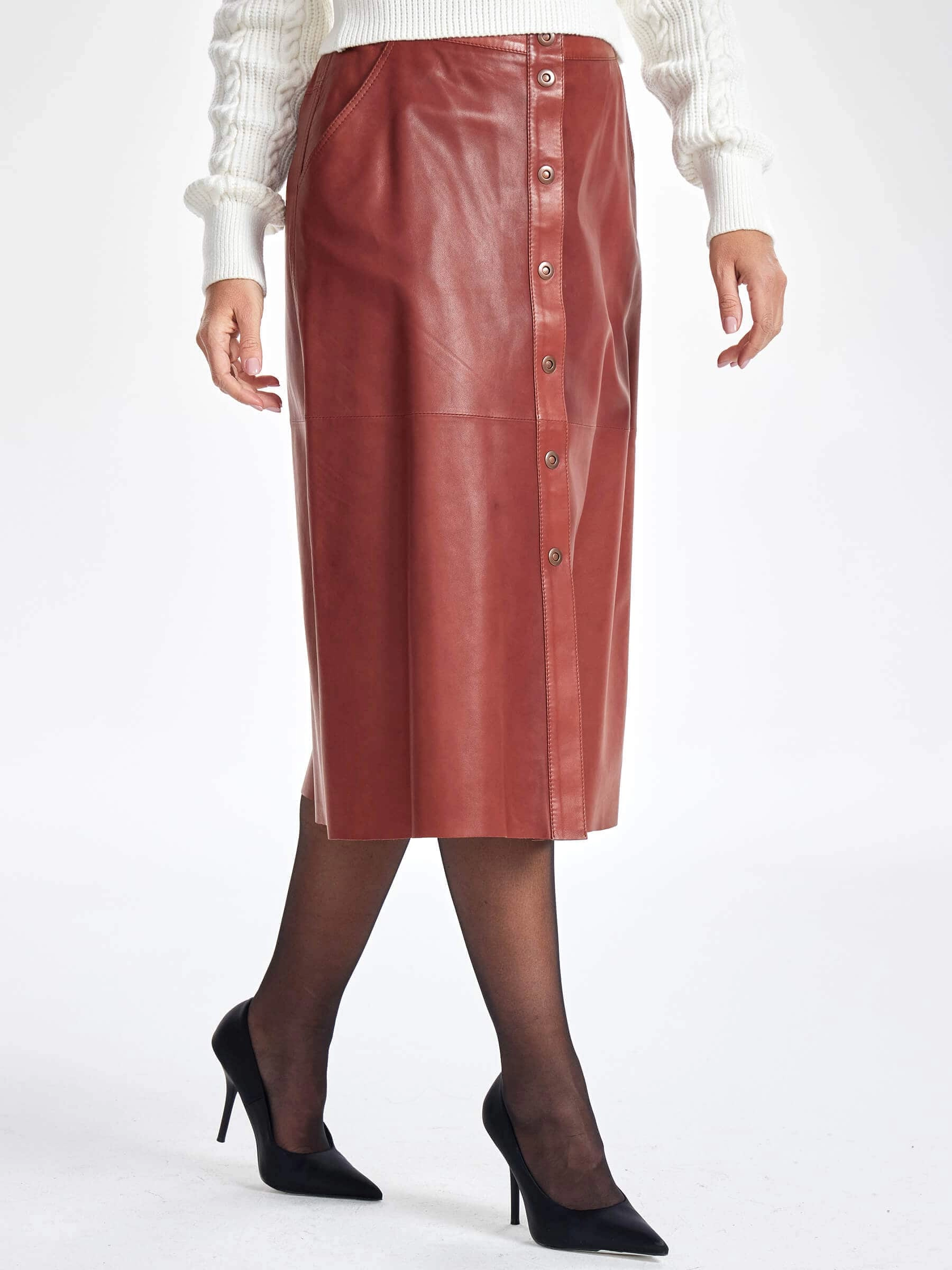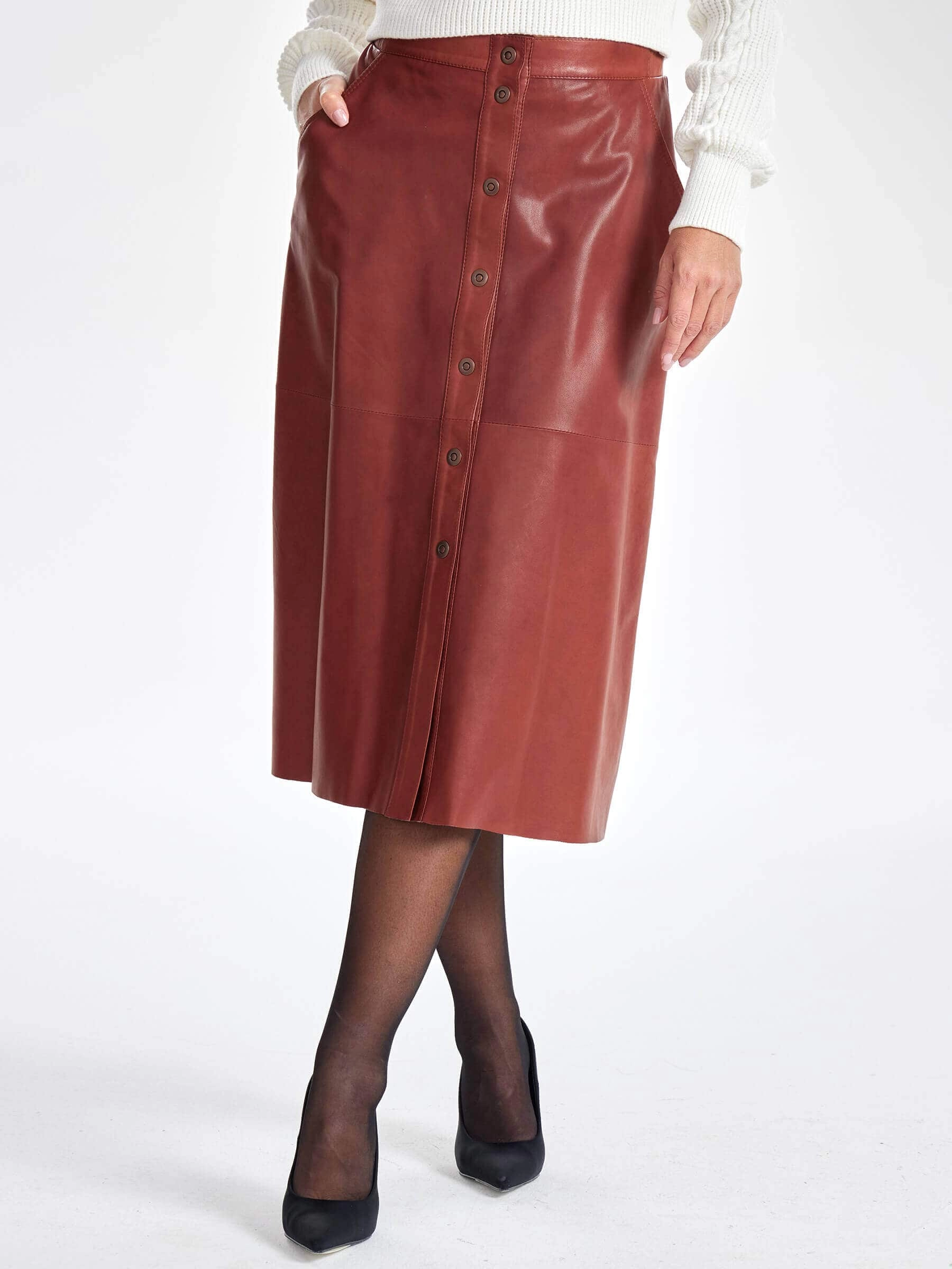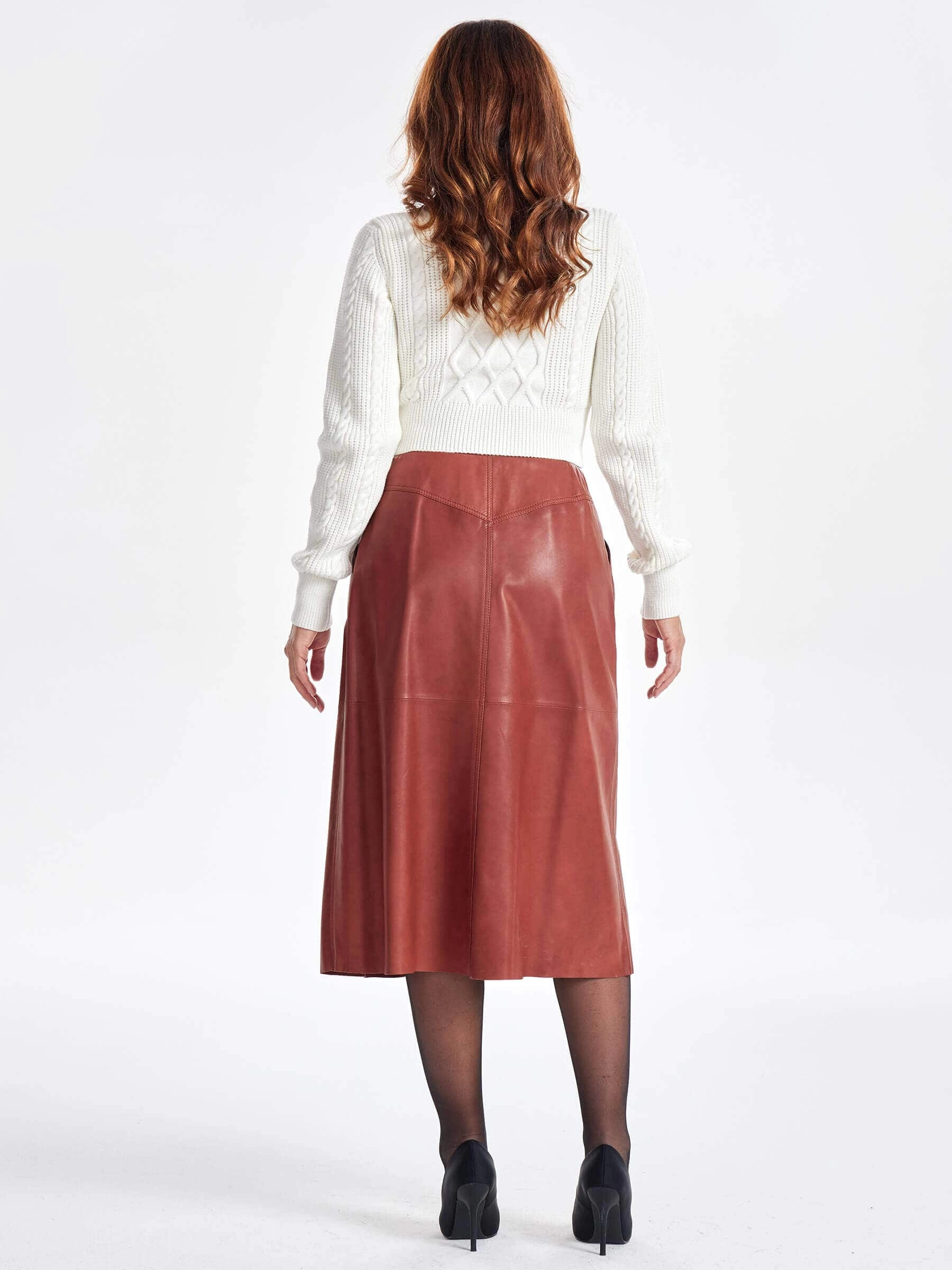 Товар коньячная кожаная юбка 08, размер 46, артикул 86351 выполнен из натуральной кожи с застежкой кнопки. Рассчитан на сезон: демисезон. Длина изделия 80 см, силуэт расклешенный.