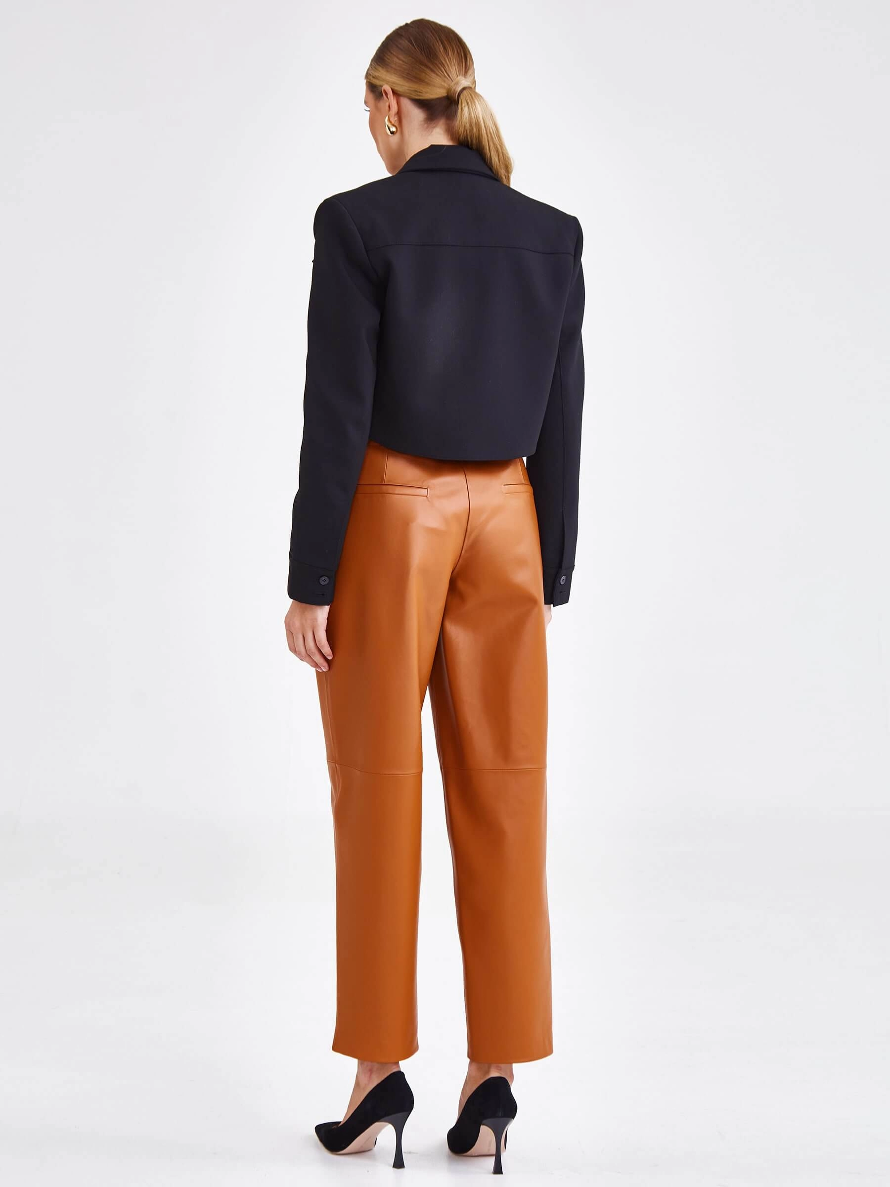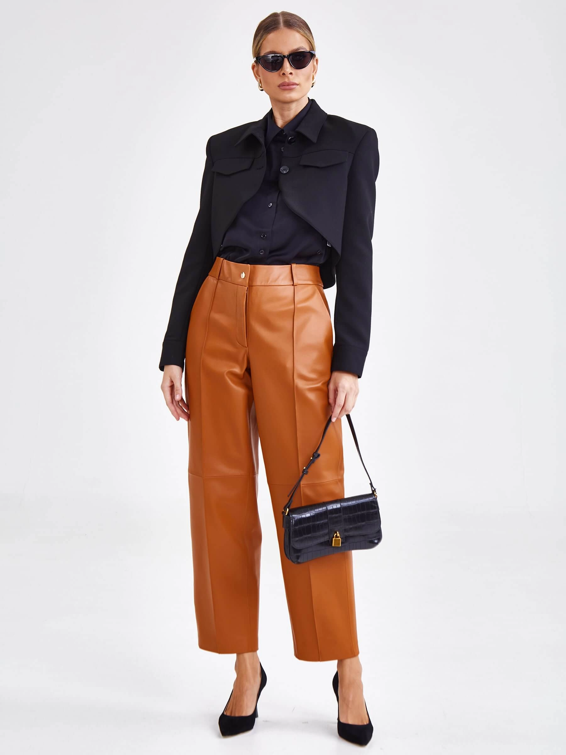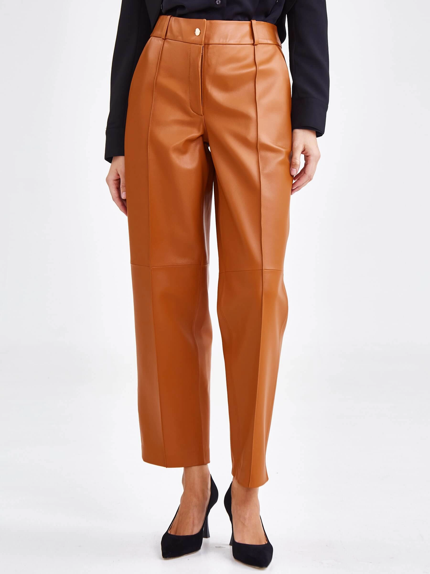 Создать эффектный образ помогут брюки со стрелками из натуральной кожи премиум-класс. Прямой крой, средняя посадка, удобные боковые карманы.