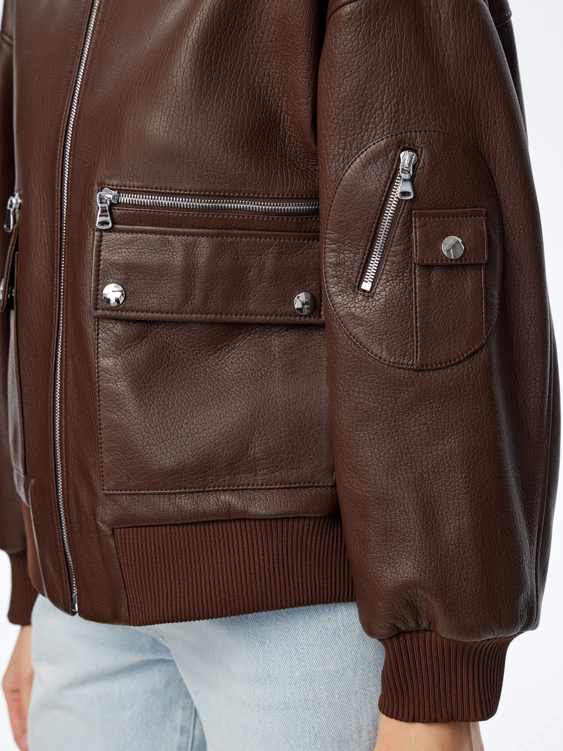 Короткая кожаная куртка бомбер для женщин премиум класса 3064, коричневая, размер 46, артикул 24030