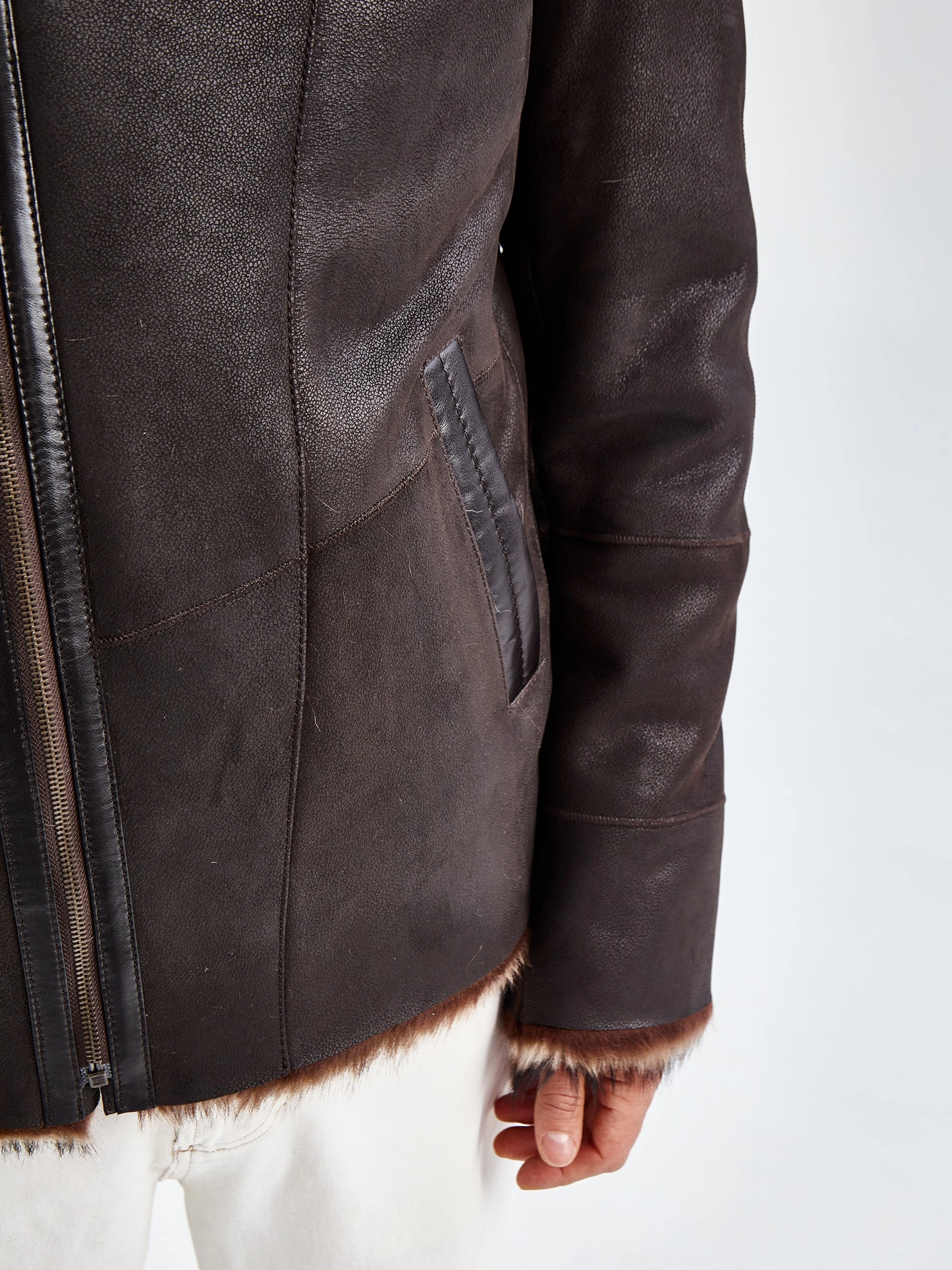 Это короткая дубленка с широкими лацканами и диагональной молнией, как у косухи. При пошиве использовали мягкую овчину с матовой поверхностью снаружи и густым мехом тоскана внутри. Изделие прямого кроя получилось легким и очень теплым. Длина рукавов регулируется манжетом. Идеальная посадка по фигуре.