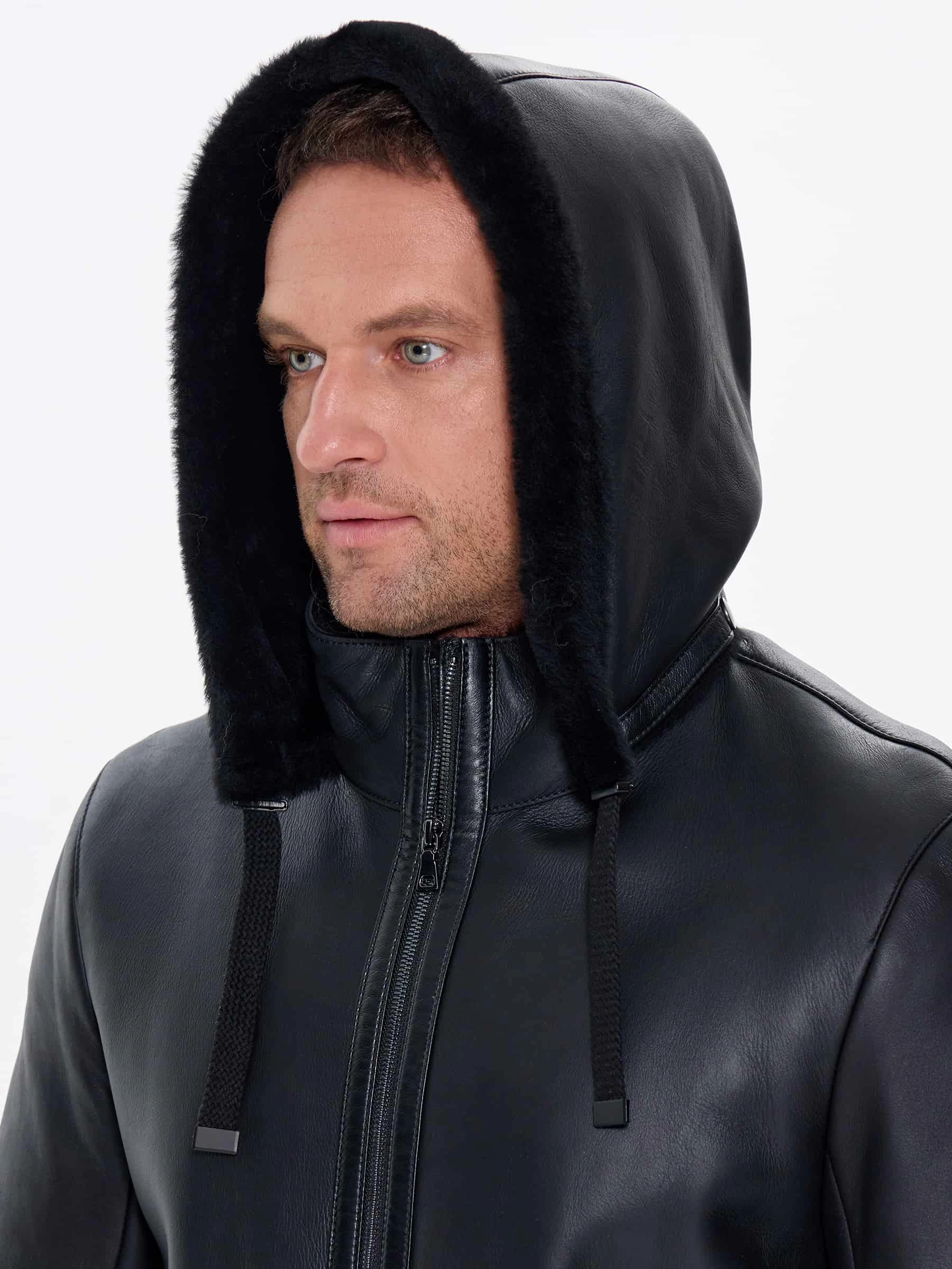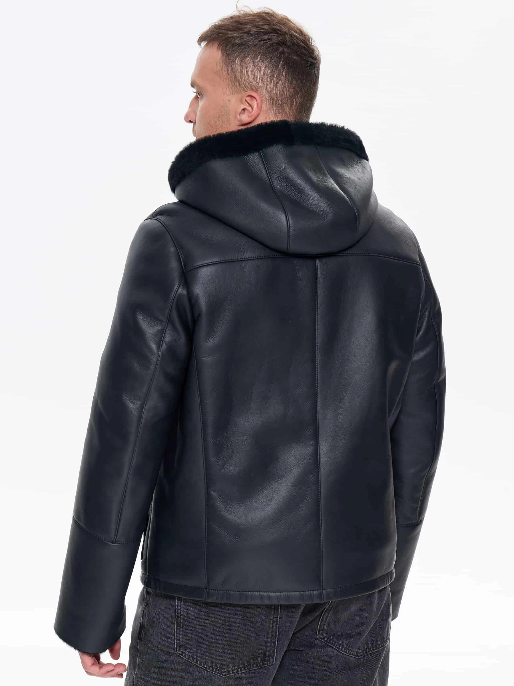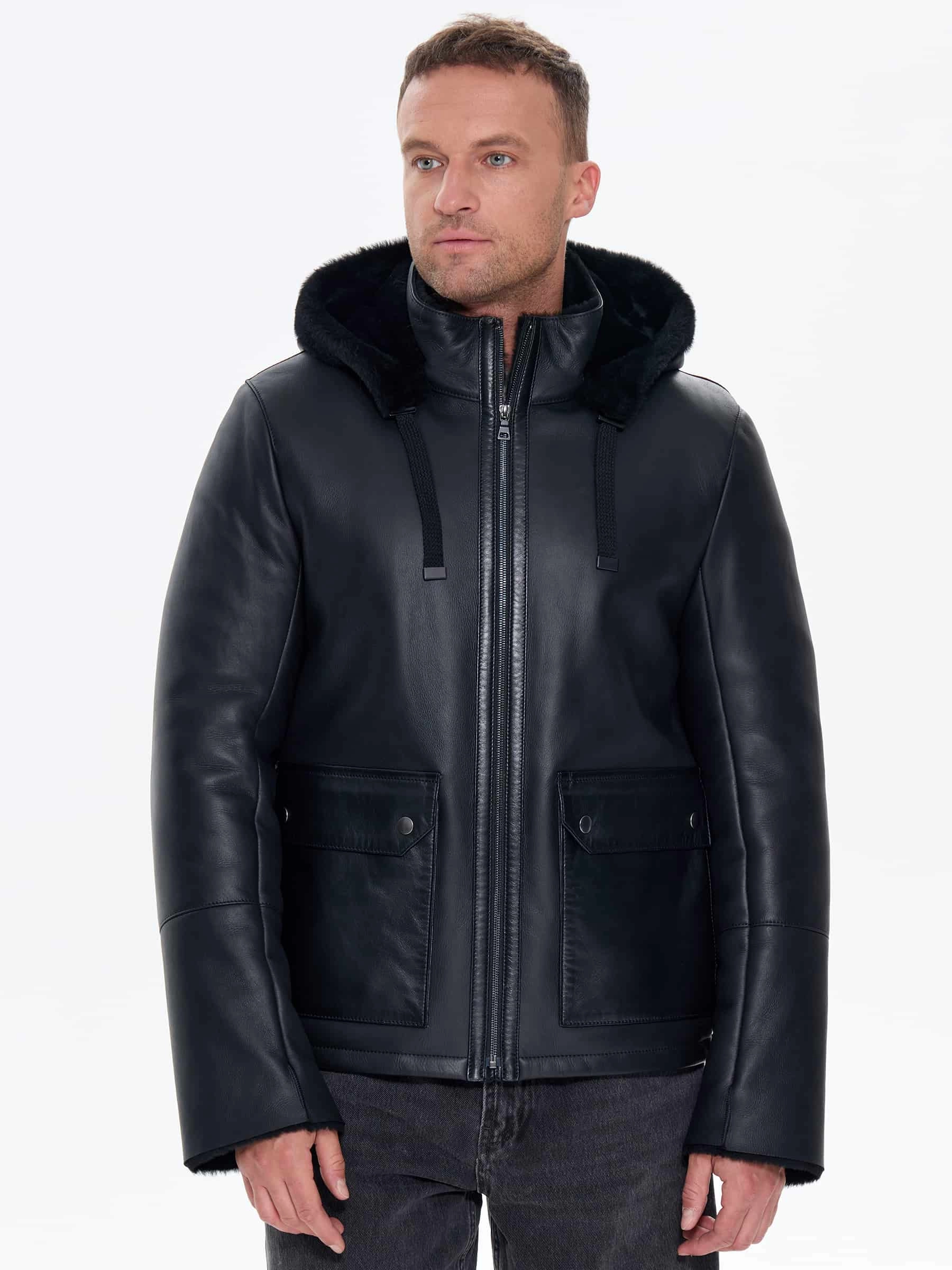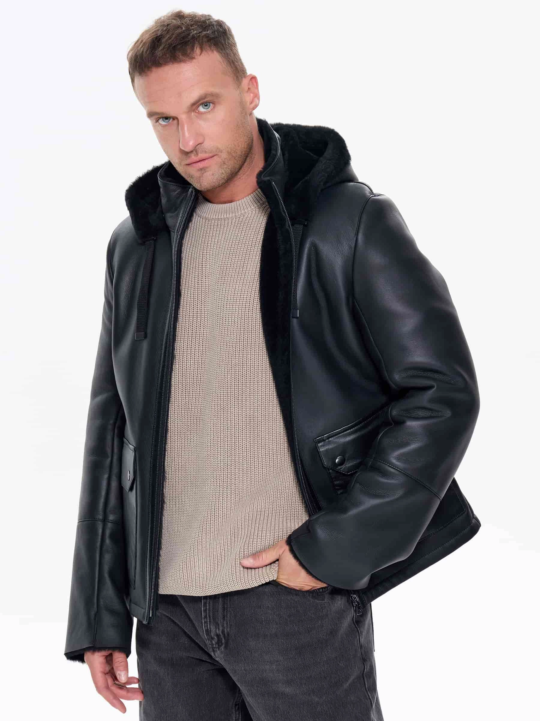 Товар короткая мужская дубленка с капюшоном премиум класса 441, черная, размер 48, артикул 41230 выполнен из овчина "мерино" с застежкой молния. Рассчитан на сезон: зима. Длина изделия 68 см, силуэт прямой.