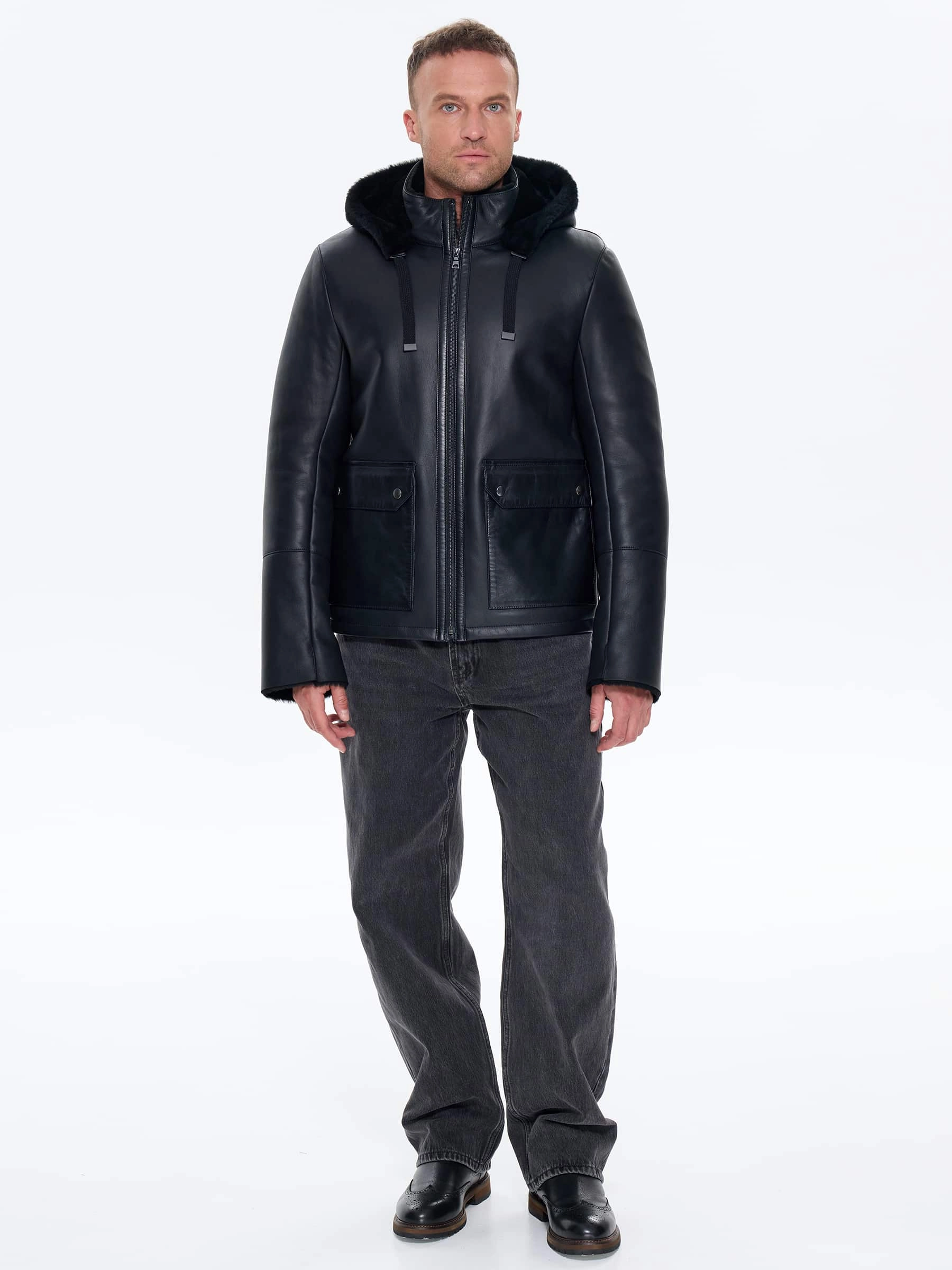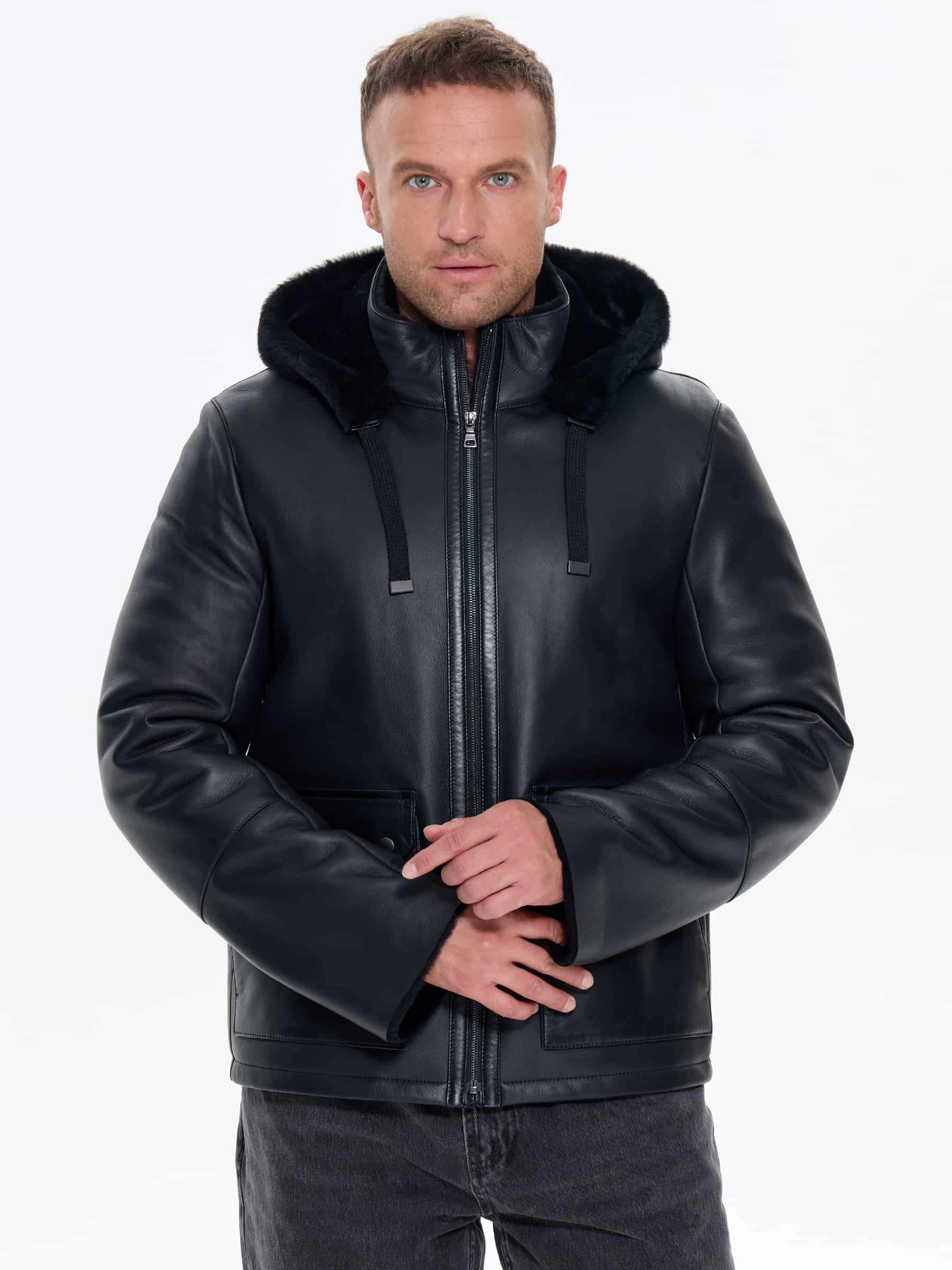 Короткая мужская дубленка с капюшоном премиум класса 441, черная, размер 48, артикул 41230