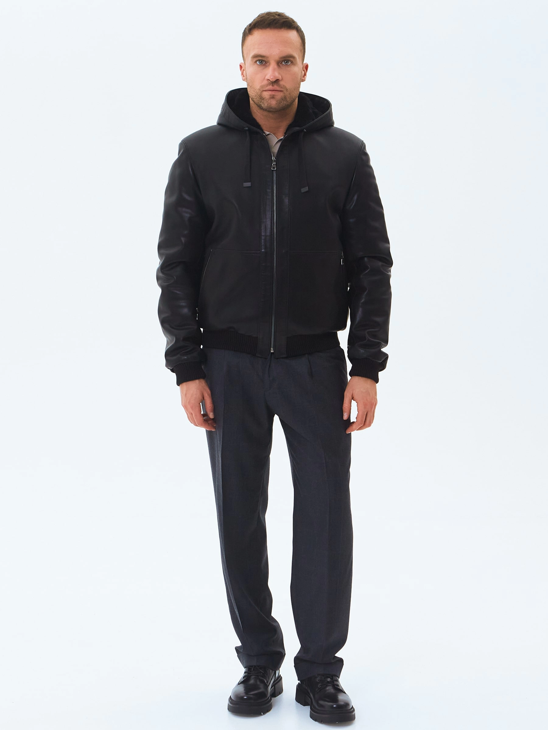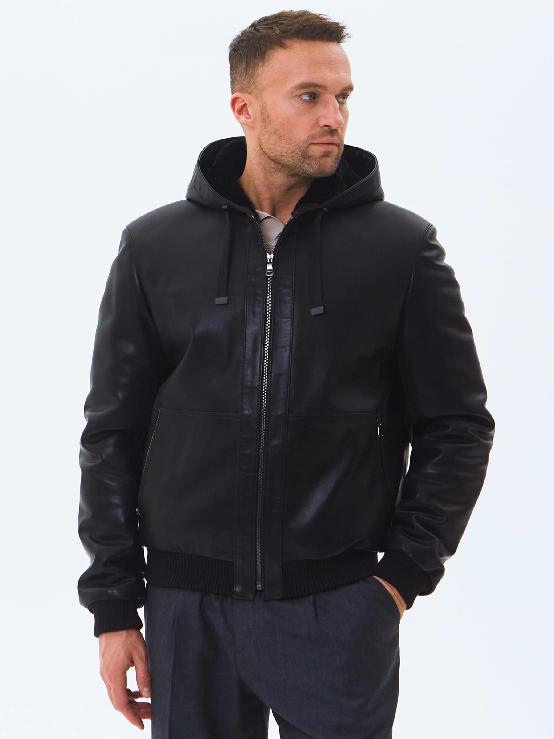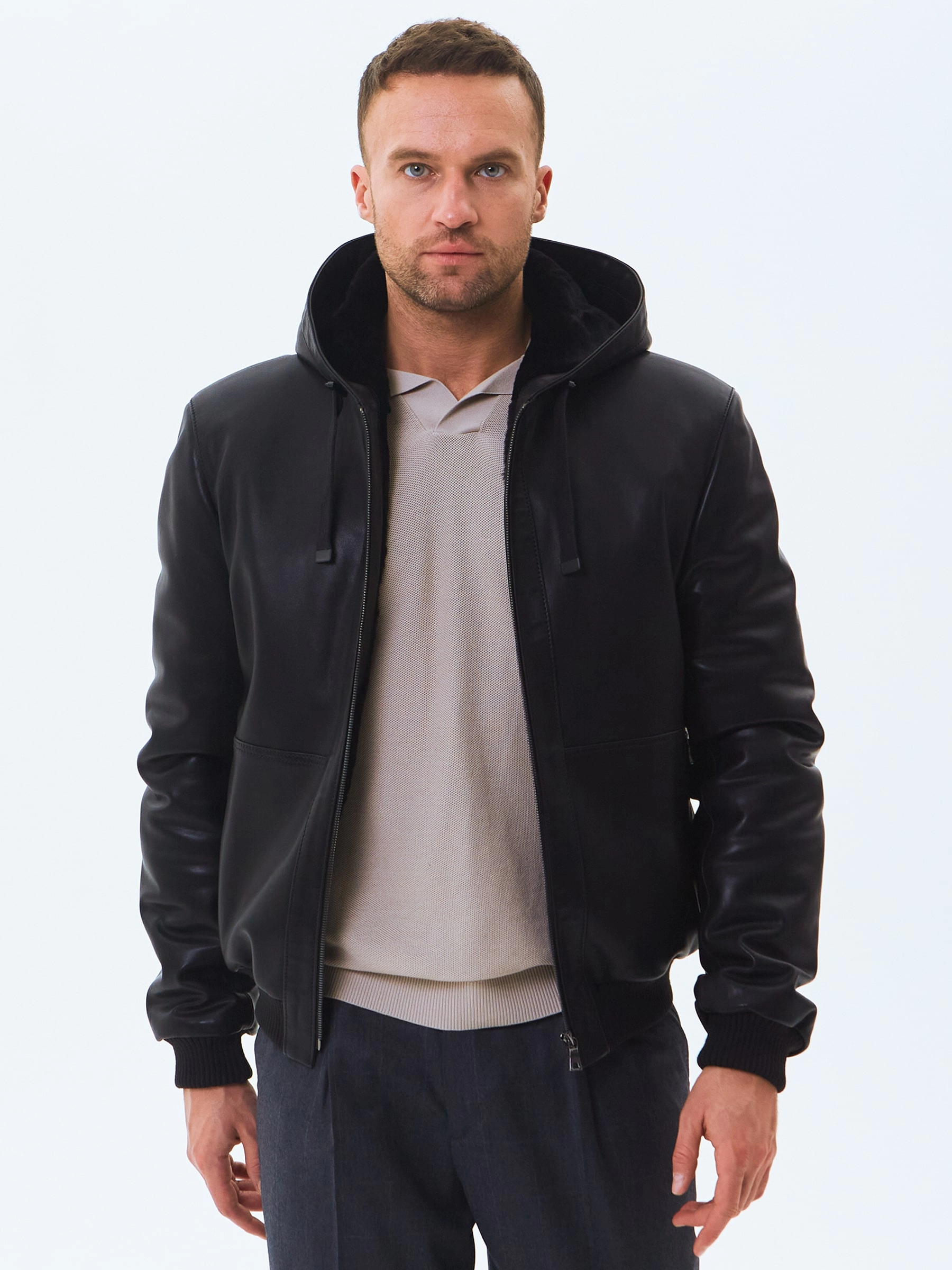 Короткая мужская кожаная дубленка бомбер с капюшоном премиум класса 561мех, черная, размер 48, артикул 71550