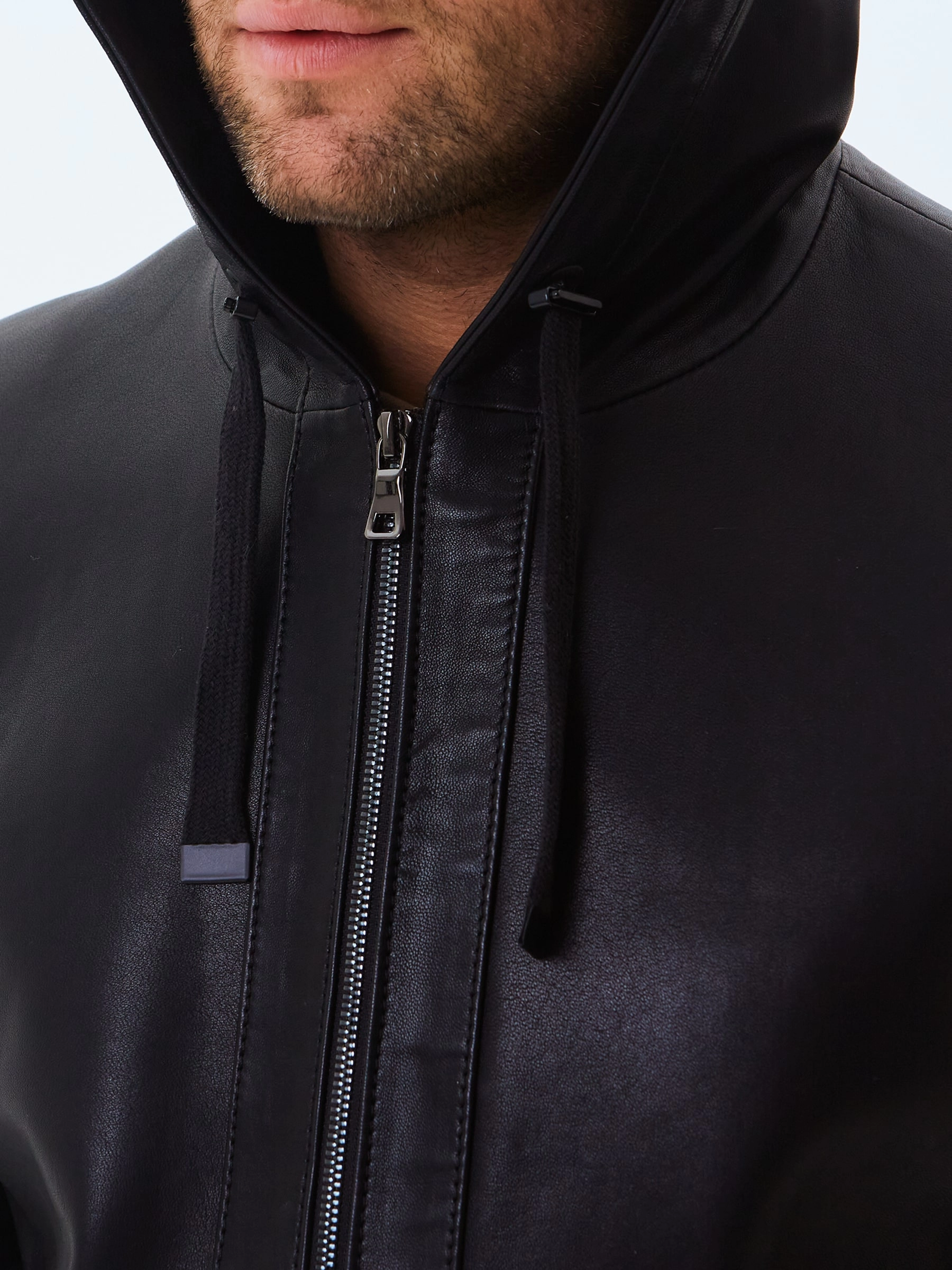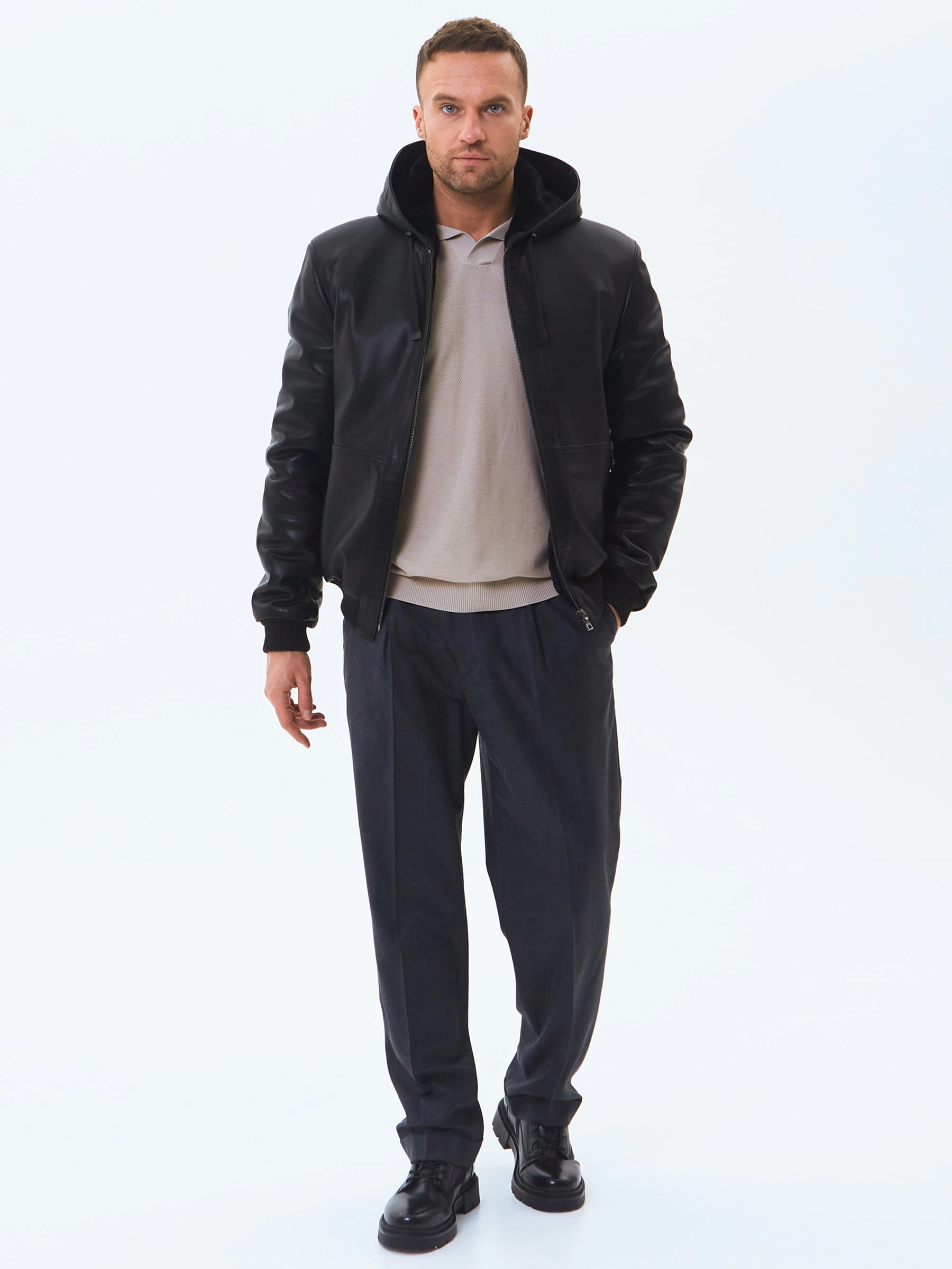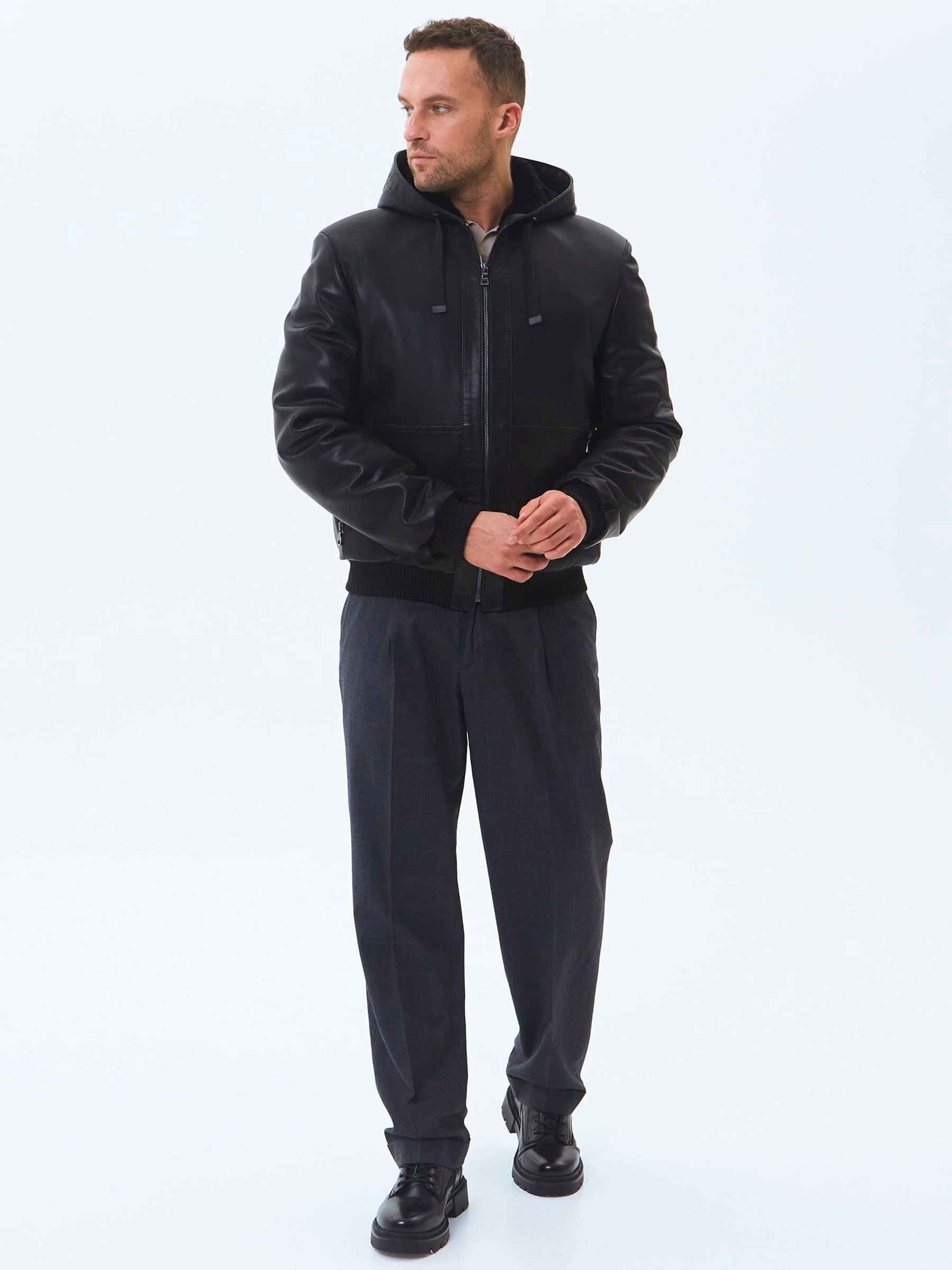 Короткая мужская кожаная дубленка бомбер с капюшоном премиум класса 561мех, черная, размер 48, артикул 71550