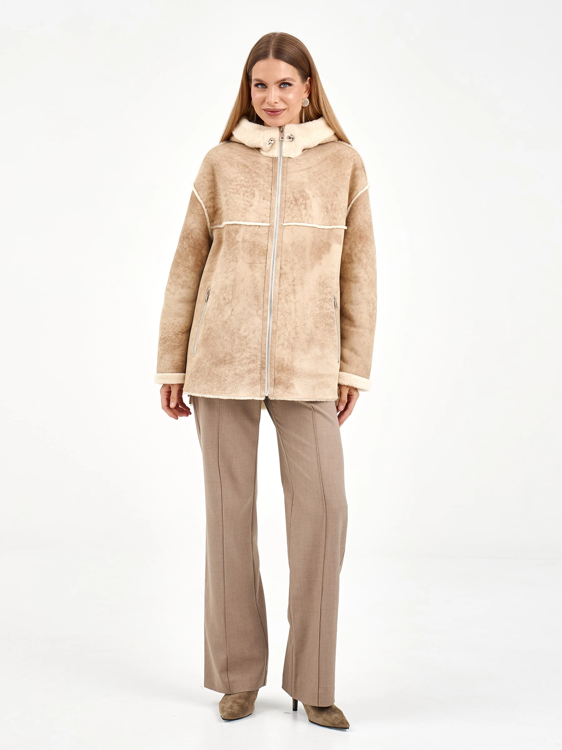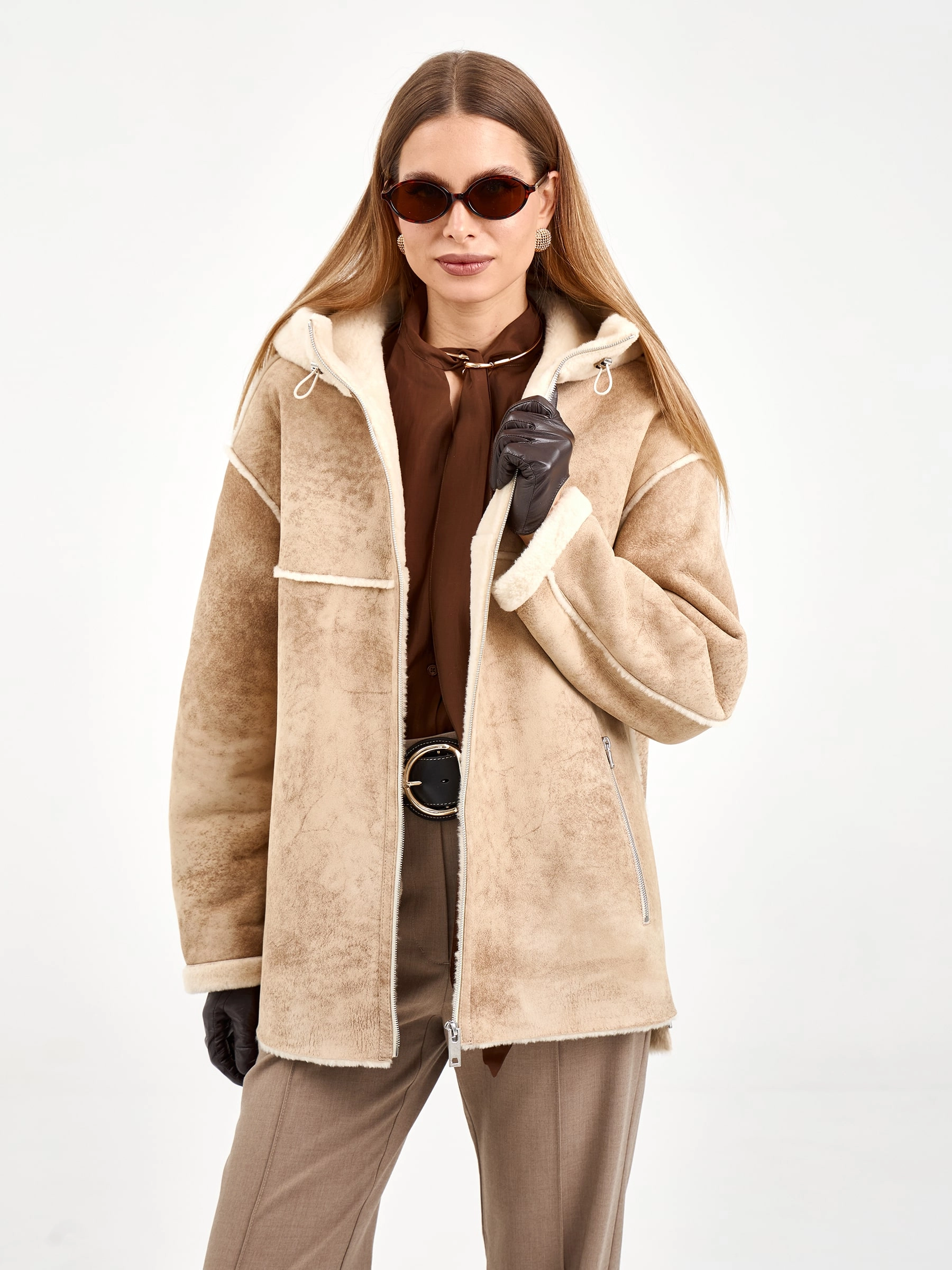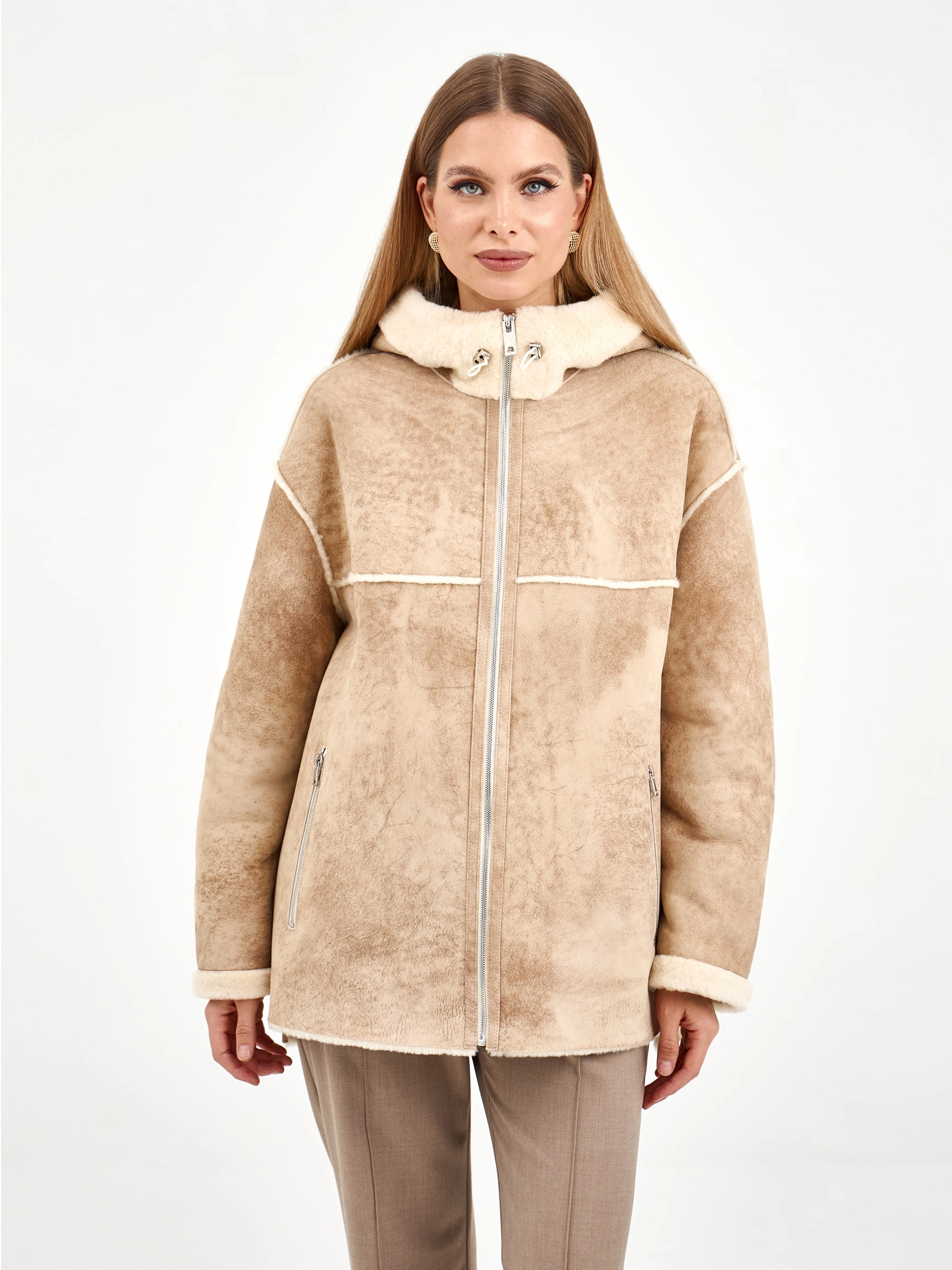 Короткая дубленка с капюшоном из премиальной овчины мерино свободного кроя. Модель длиной 75 см с несъемным капюшоном и спущенным рукавом создает элегантный повседневный образ. Застежка-молния, боковые разрезы и практичные врезные карманы. Стилисты рекомендуют носить с объемными свитерами, джинсами-скинни и ботильонами для создания модного лука. Идеальное сочетание уюта, стиля и городской эстетики.