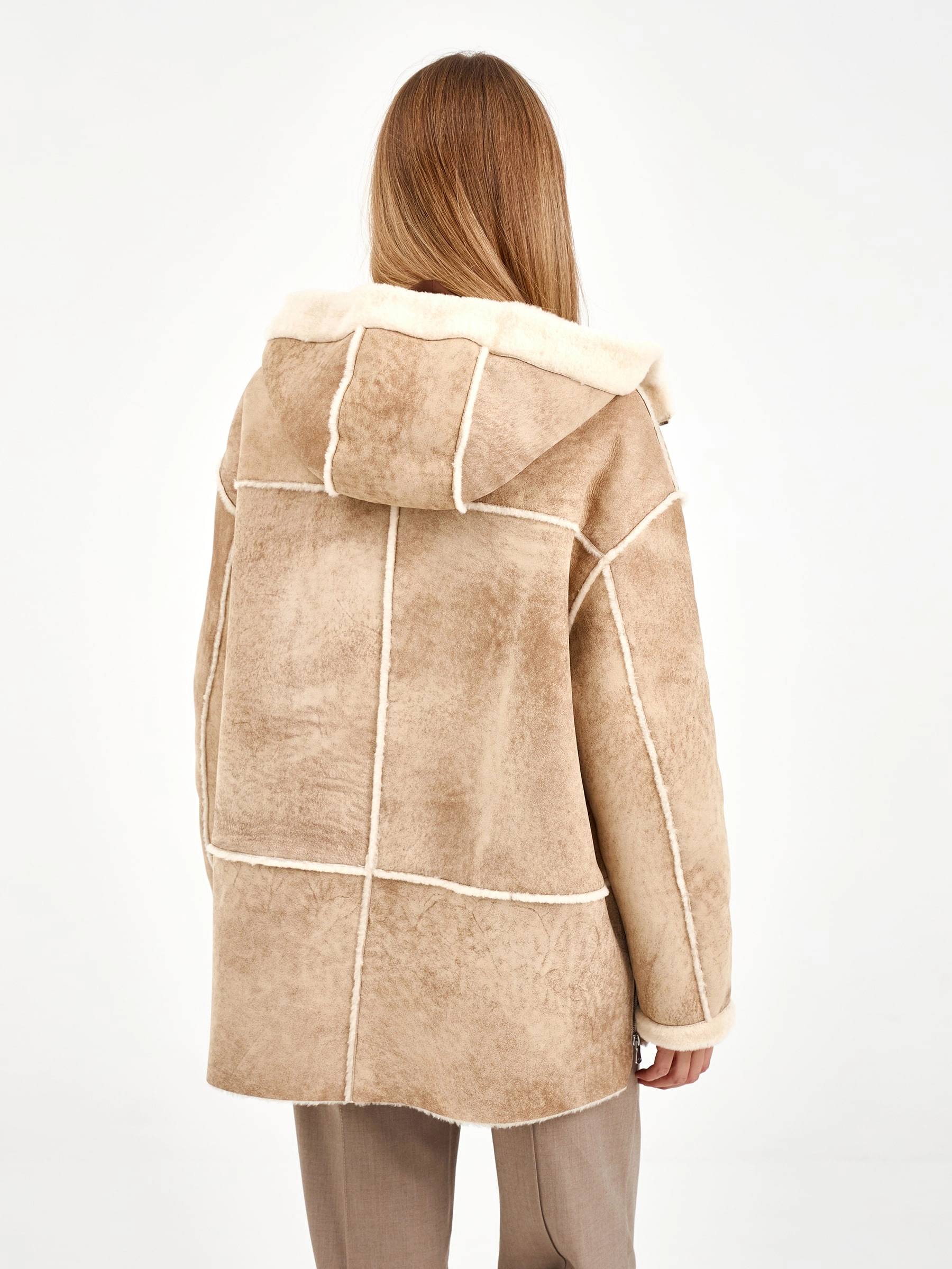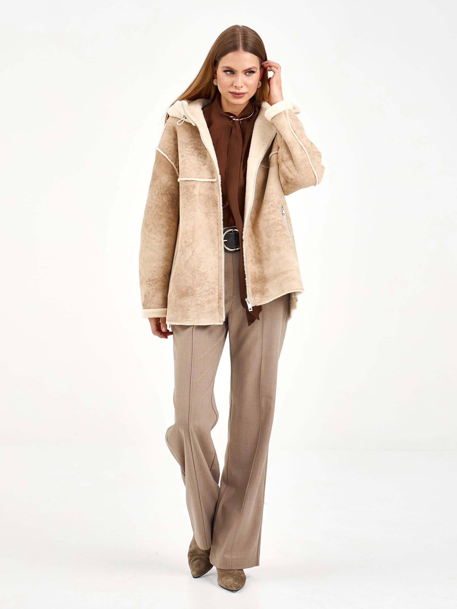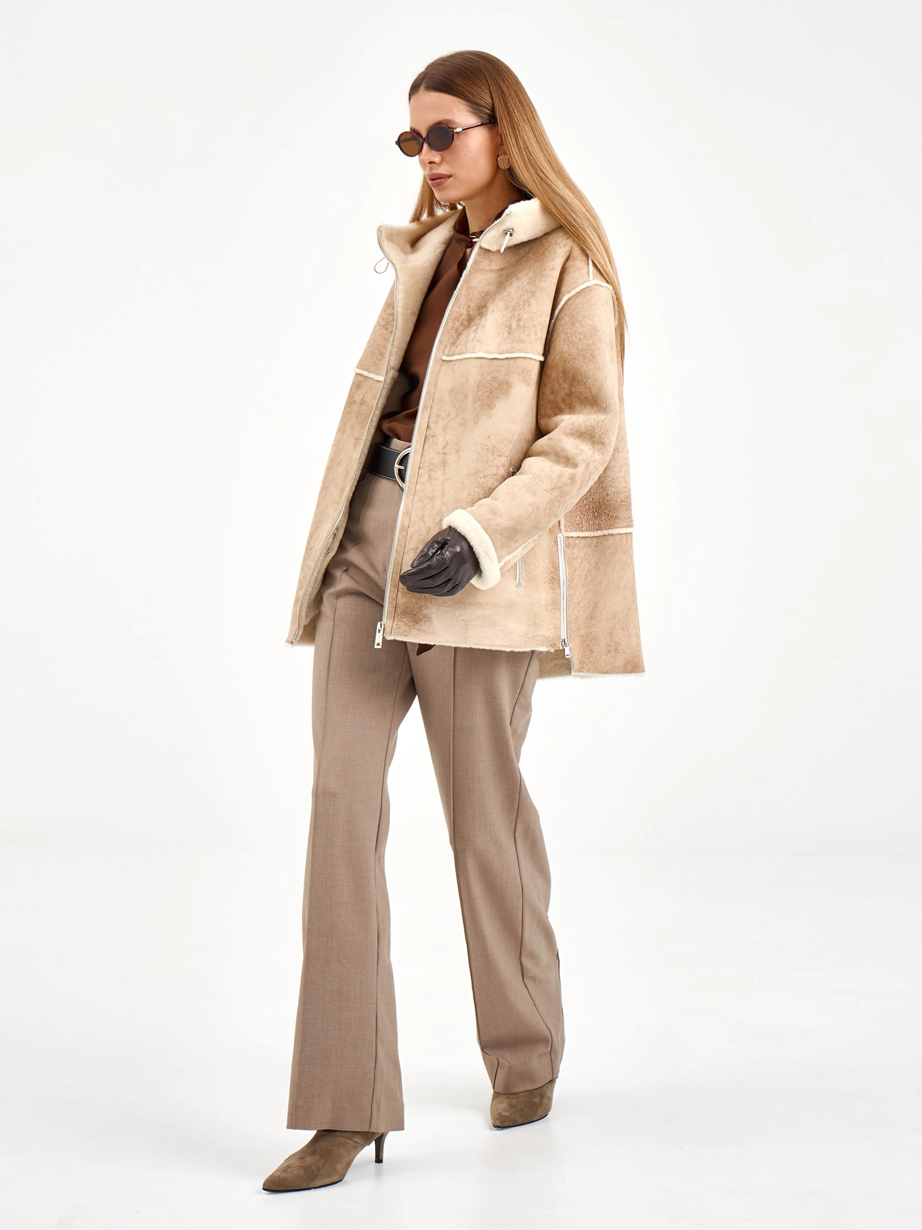 Короткая дубленка с капюшоном из премиальной овчины мерино свободного кроя. Модель длиной 75 см с несъемным капюшоном и спущенным рукавом создает элегантный повседневный образ. Застежка-молния, боковые разрезы и практичные врезные карманы. Стилисты рекомендуют носить с объемными свитерами, джинсами-скинни и ботильонами для создания модного лука. Идеальное сочетание уюта, стиля и городской эстетики.