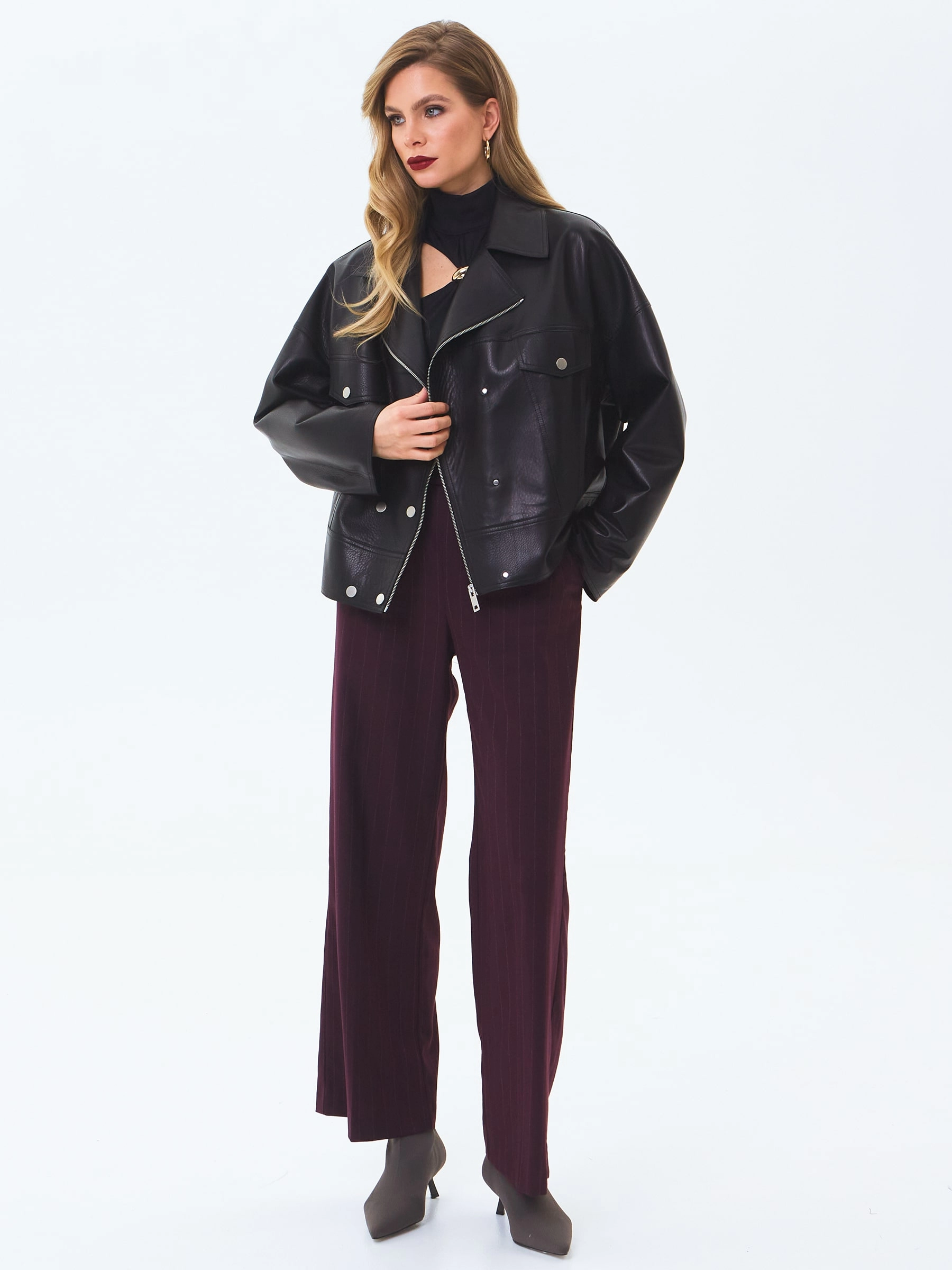 Для пошива косухи с широкими лацканами использовали матовую мелкозернистую кожу премиум класса. Спущенная линия плеча. Комфортная посадка по фигуре. Изделие дополнили фигурными боковыми карманами декорированные клапанами. Акцент сделали на крупные серебристые кнопки. Куртка застегивается молнией.