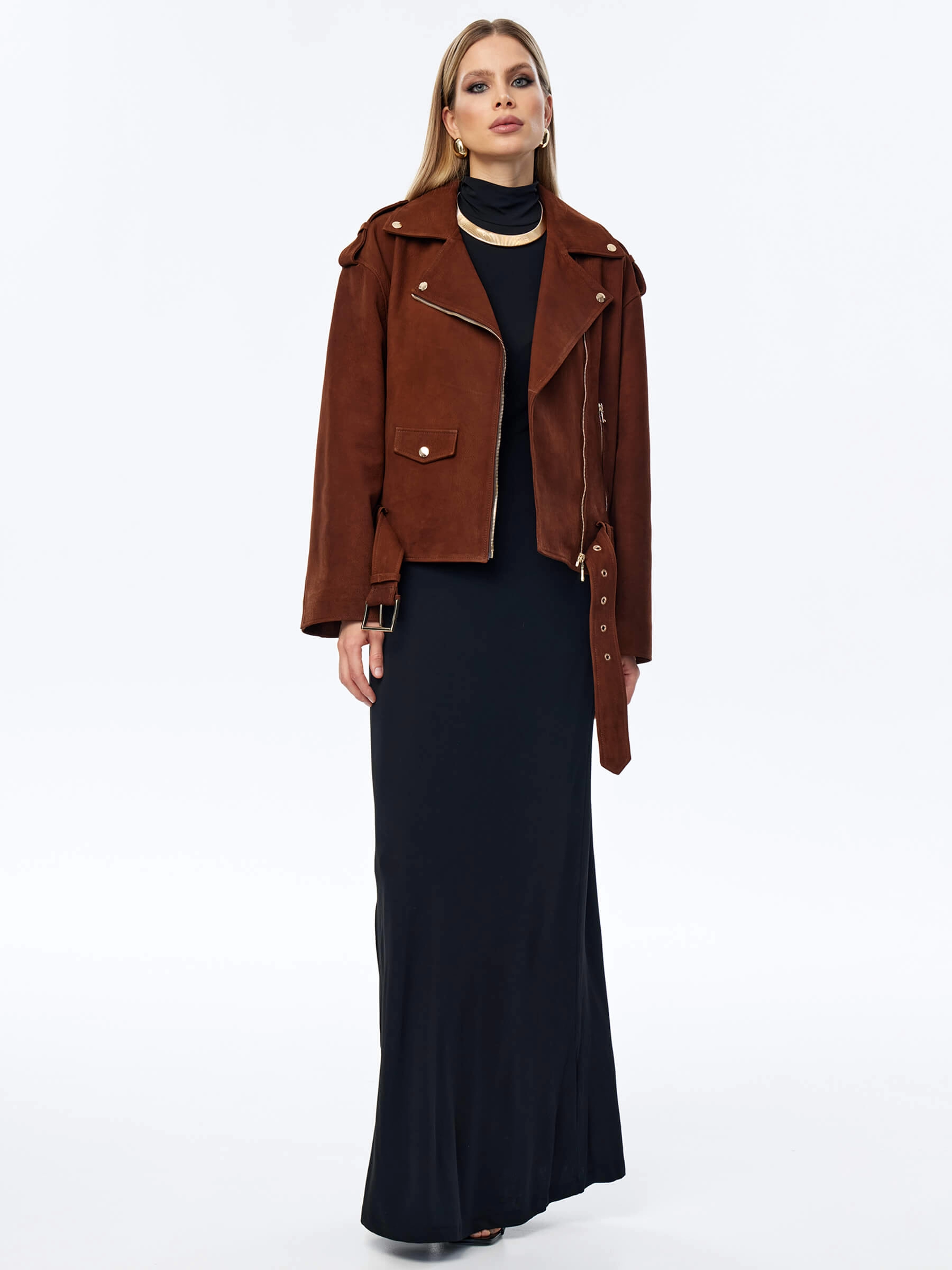 Для пошива укороченной косухи с погонамии и регулируемым поясом с пряжкой, использовали фактурную матовую кожу премиум класса. Модель свободного силуэта, со спущенной линией плеч не сковывает движения, комфортно садится по фигуре. Изделие с широкими лацканами и множеством карманов, подчеркнули серебристыми молниями.