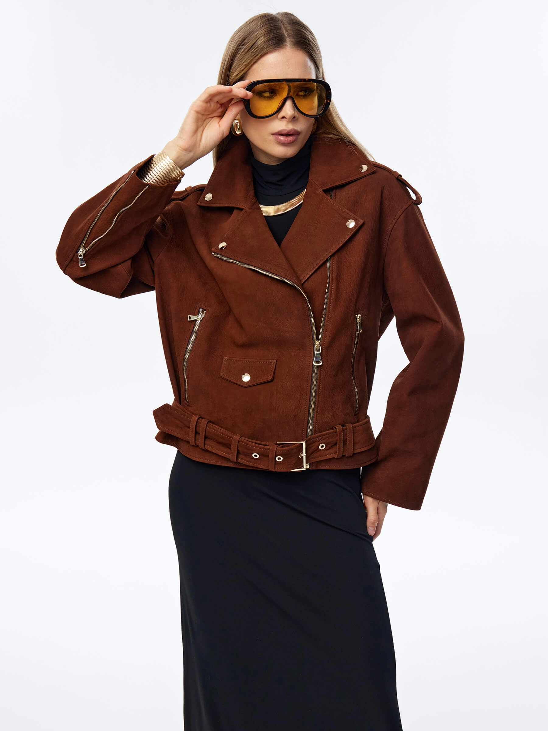 Короткая женская кожаная куртка косуха с поясом премиум класса 3052, виски, размер 46, артикул 23960