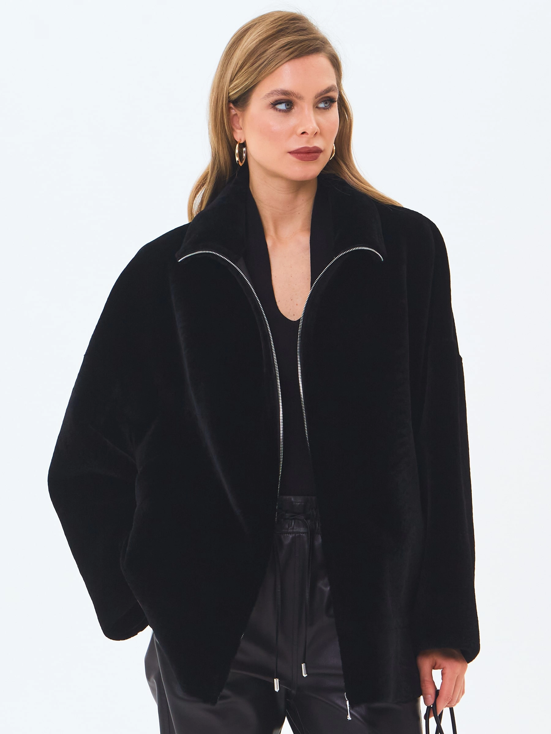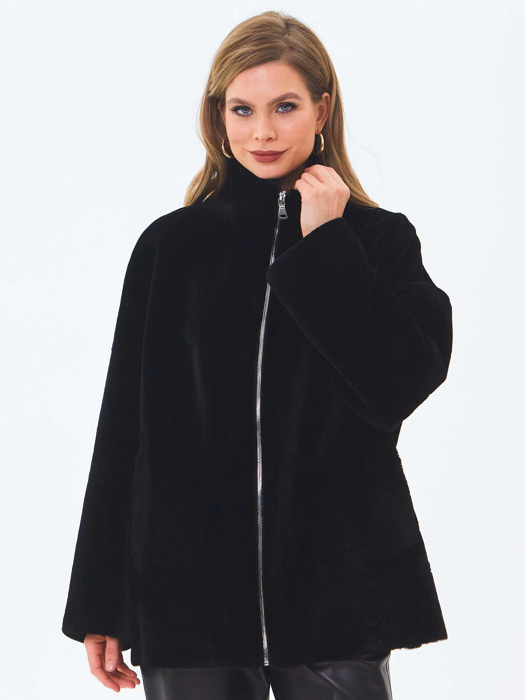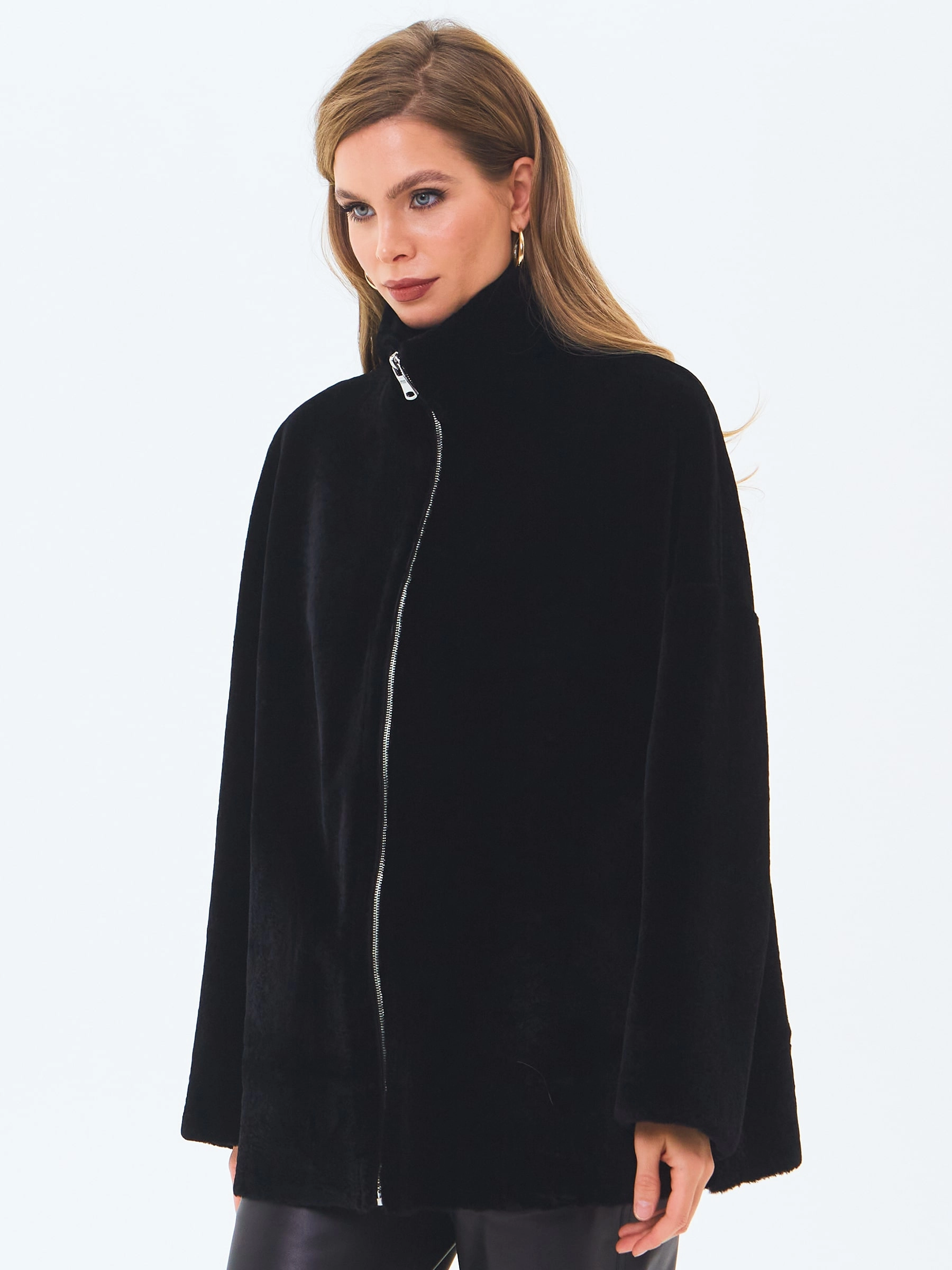 Эта короткая шубка выполненная из нежного меха астраган для тех, кто желает сочетать комфорт и стиль. Свободный крой, спущенная линия плеча, воротник- стойка. Изделие с врезными боковыми карманами застегивается молнией.