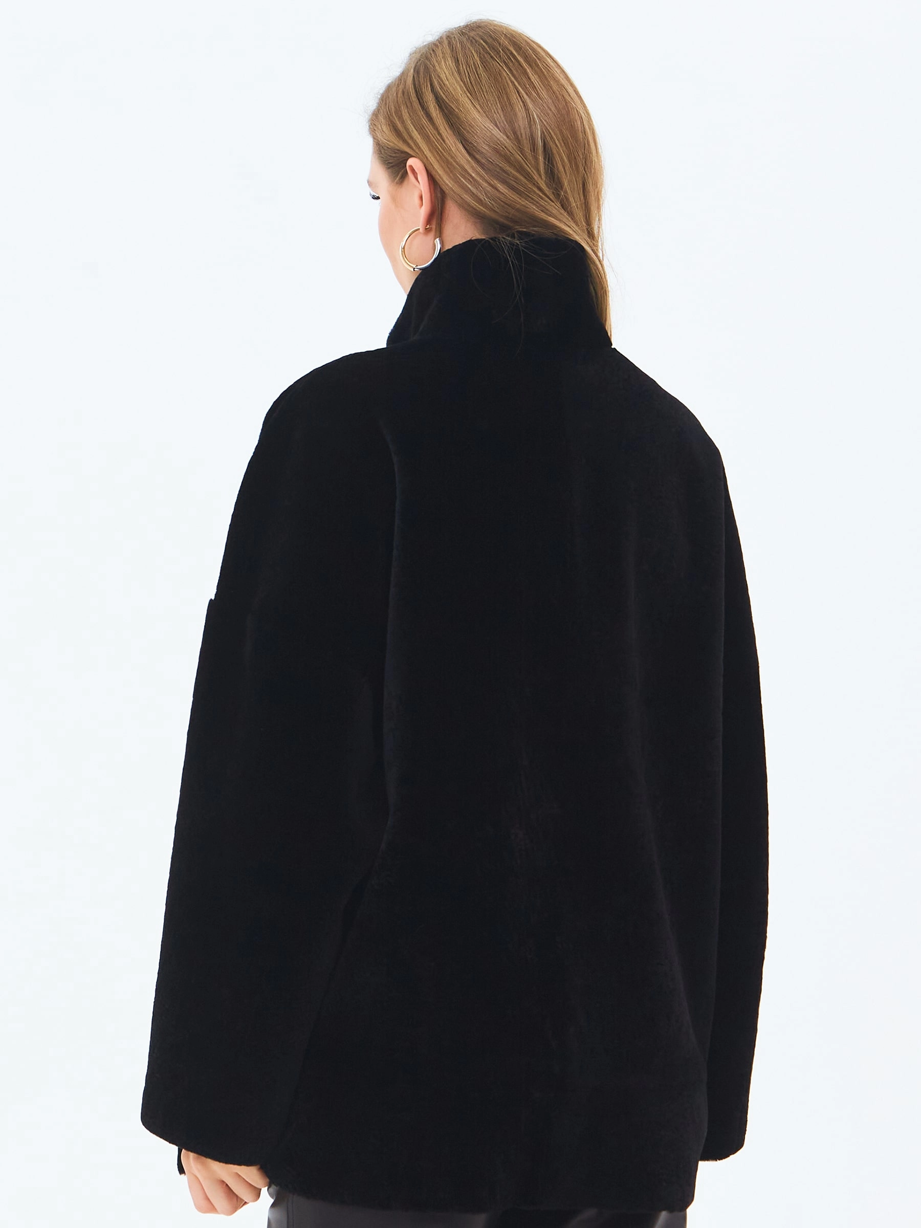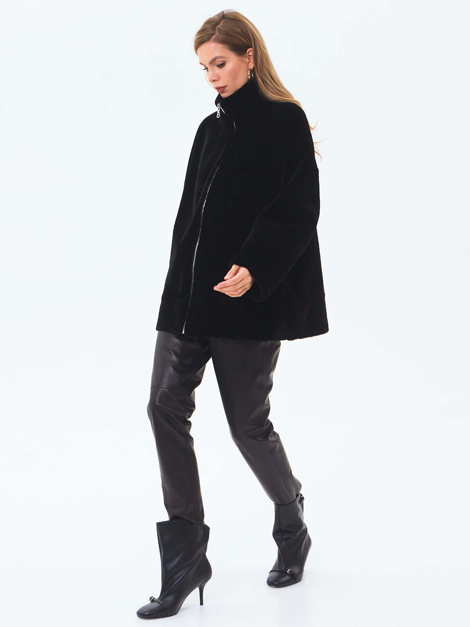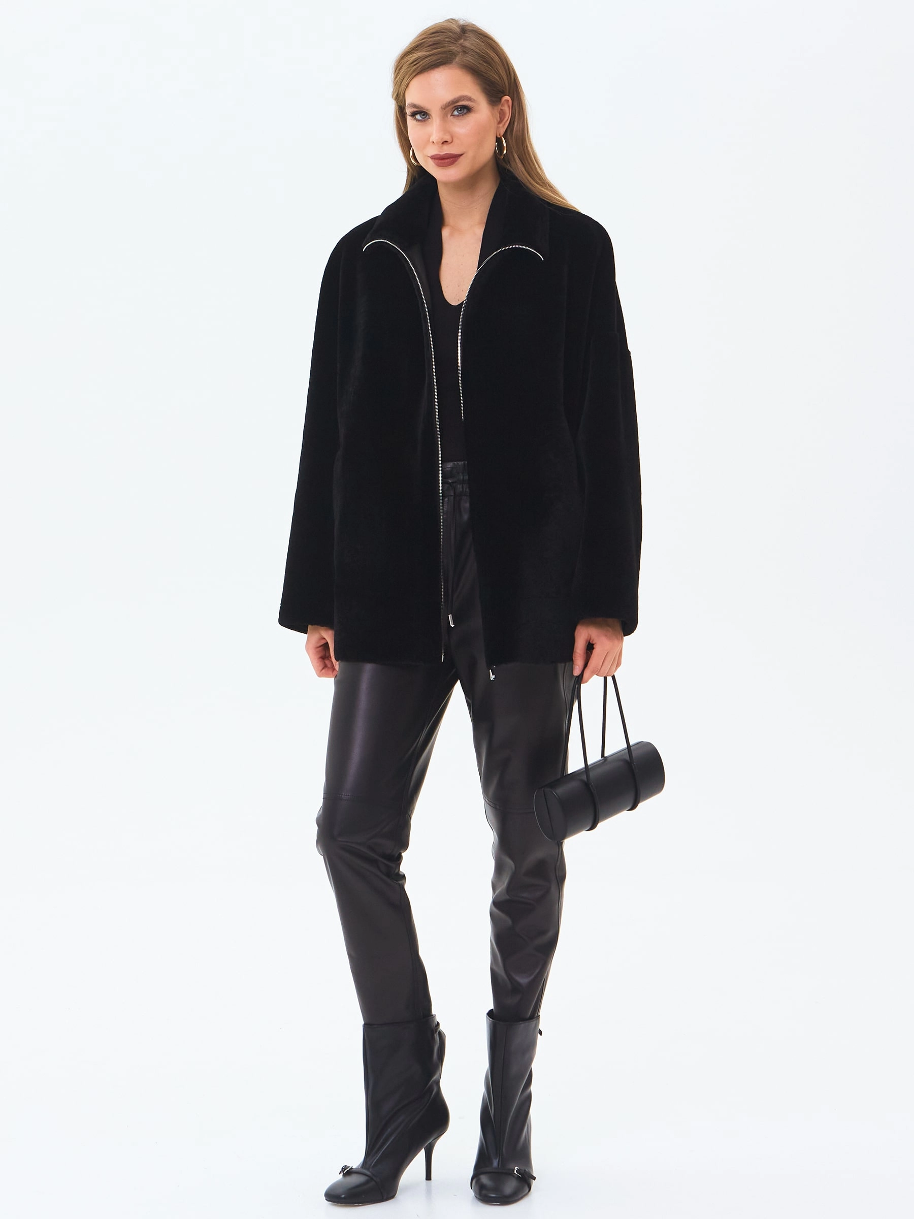 Эта короткая шубка выполненная из нежного меха астраган для тех, кто желает сочетать комфорт и стиль. Свободный крой, спущенная линия плеча, воротник- стойка. Изделие с врезными боковыми карманами застегивается молнией.