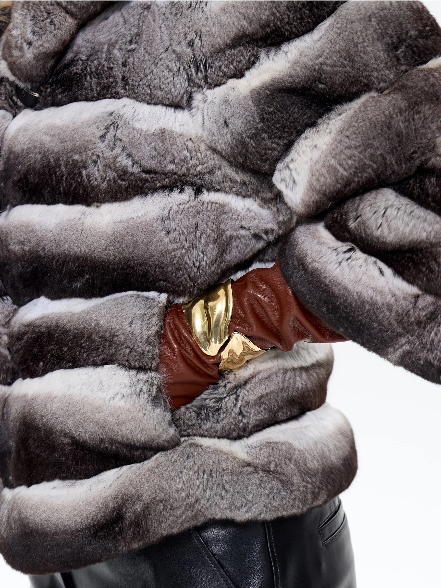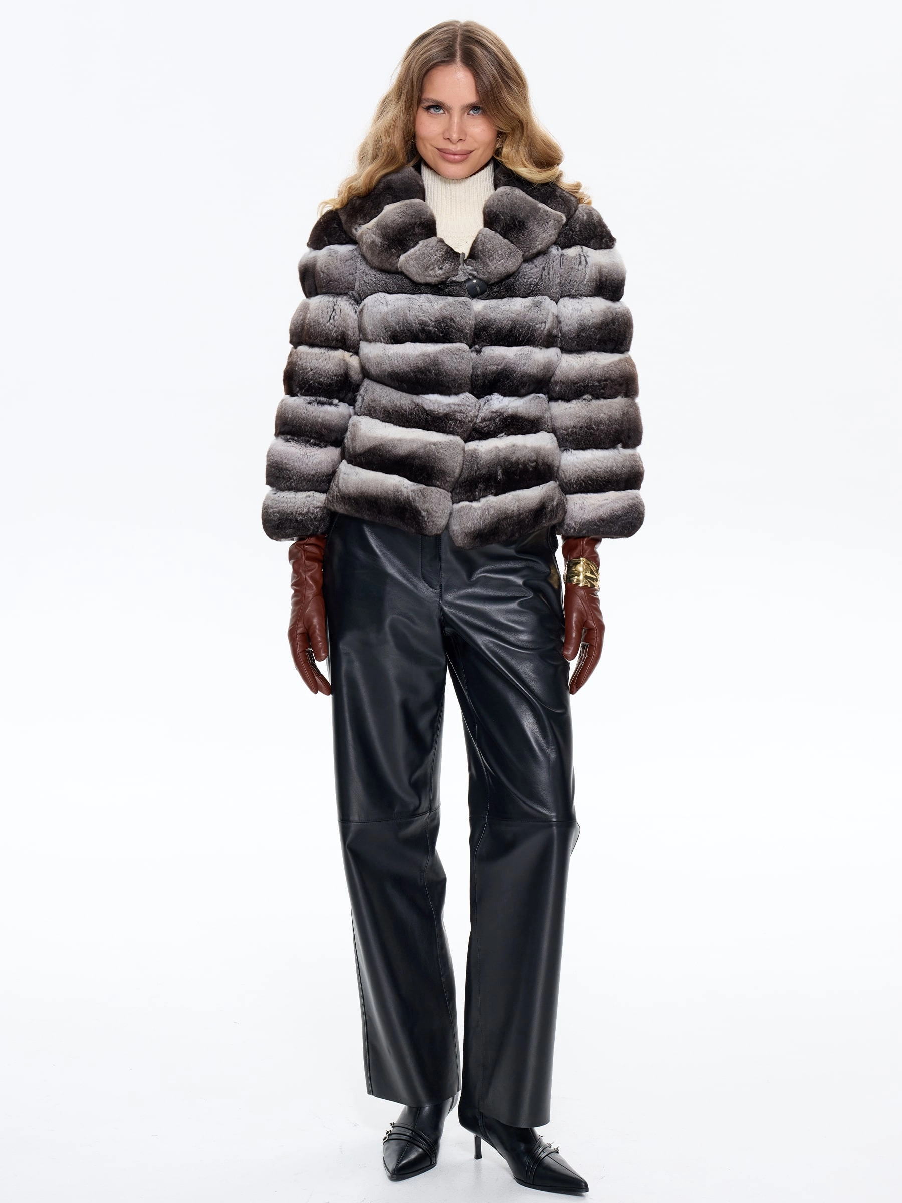 Короткую шубу прямого кроя выполнили из эксклюзивного меха шиншиллы — невесомого, с уникальным серебристо-голубым переливом и облачной мягкостью, где хаотичный рисунок волосков и мерцающий блеск невозможно воспроизвести искусственно. Укороченный крой акцентирует талию и идеально сочетается с юбками и брюками с высокой посадкой, в то время как воротник-шале драпируется элегантными волнами, заменяя аксессуары. Вискозная подкладка, шелковистая на ощупь, защищает деликатный мех от контакта с кожей, а скрытые клипсы обеспечивают фиксацию без видимых элементов, делая эту куртку воплощением эксклюзивности, которая требует уверенности, но вознаграждает владелицу уникальным образом, недоступным в масс-маркете — это инвестиция в статус, а не в практичность.