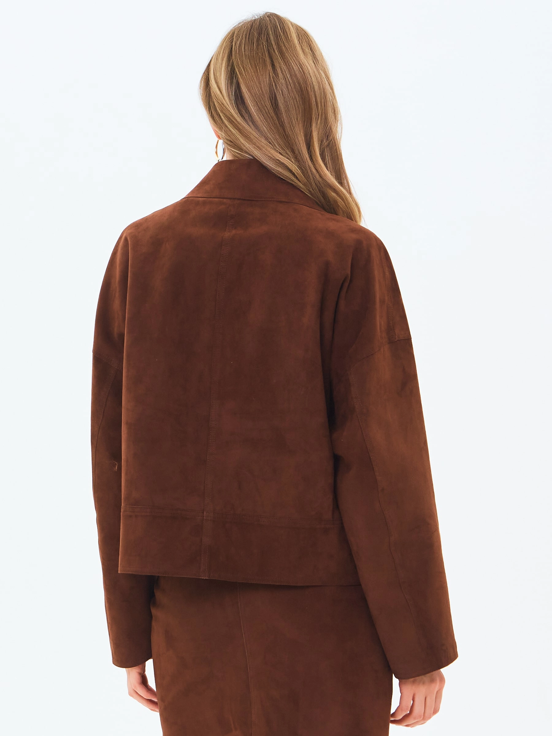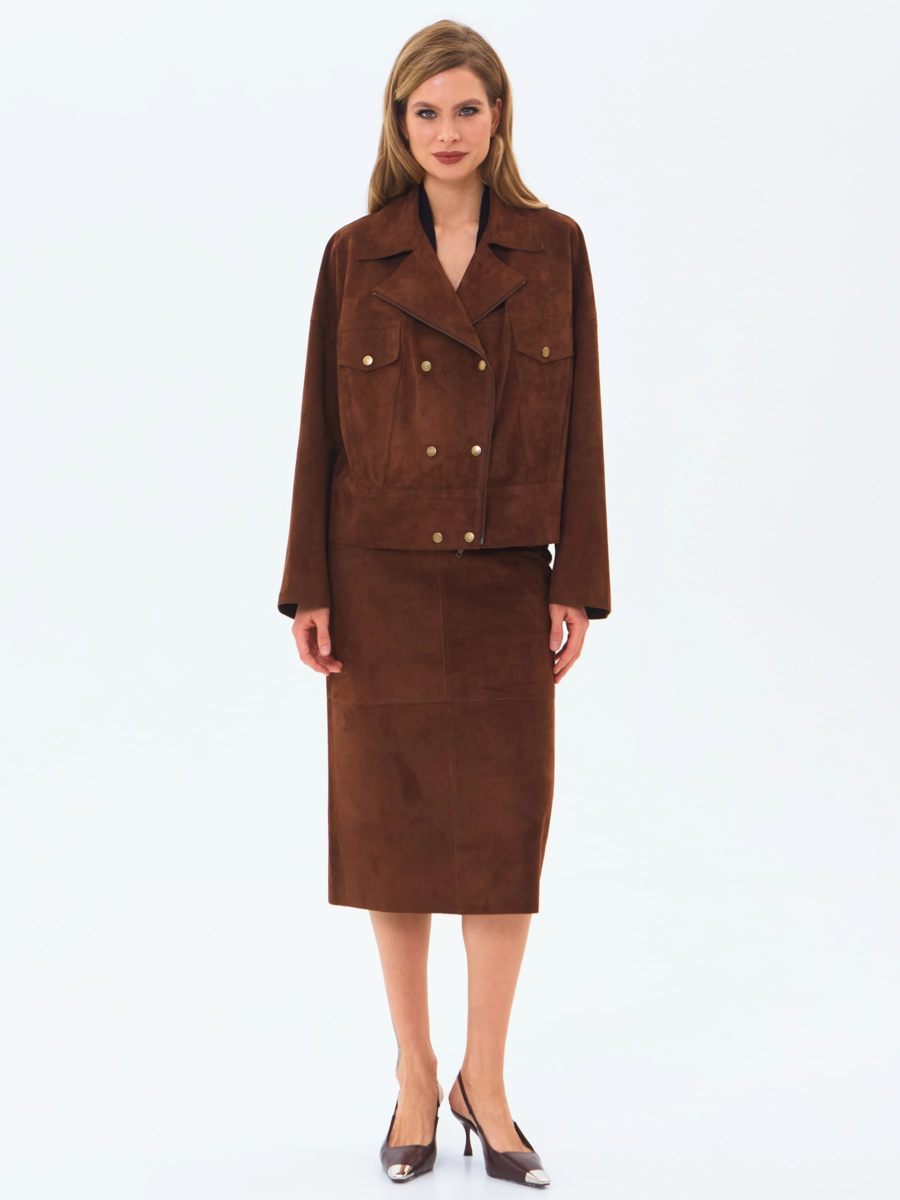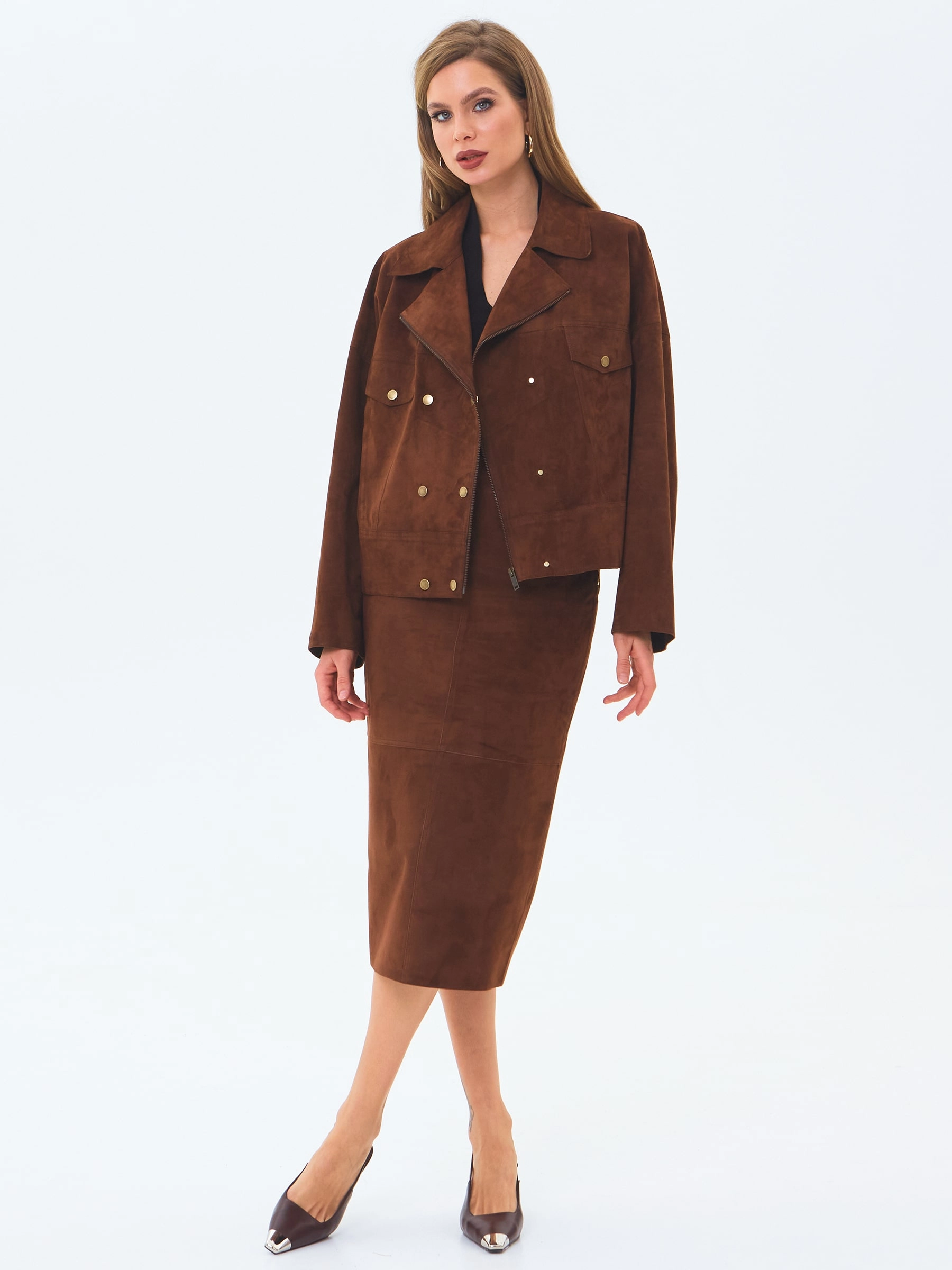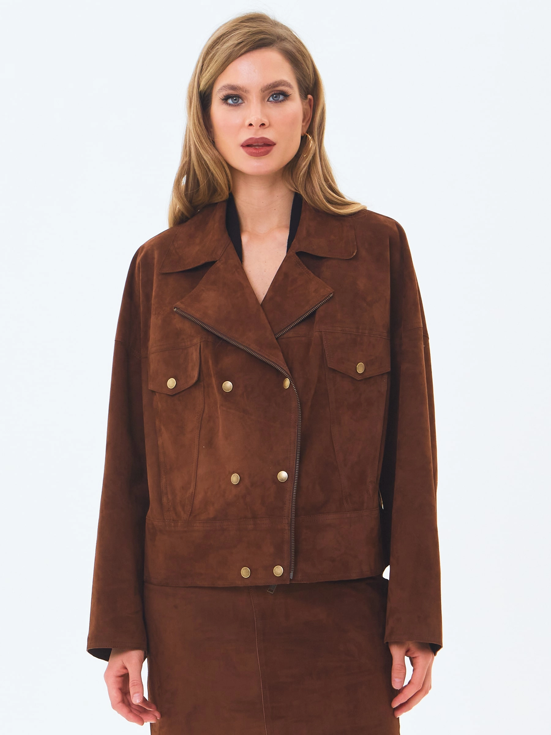 Для пошива косухи с широкими лацканами использовали замшу премиального класса. Спущенная линия плеча. Комфортная посадка по фигуре. Изделие дополнили фигурными боковыми карманами декорированные клапанами. Акцент сделали на крупные золотистые кнопки. Куртка застегивается молнией.