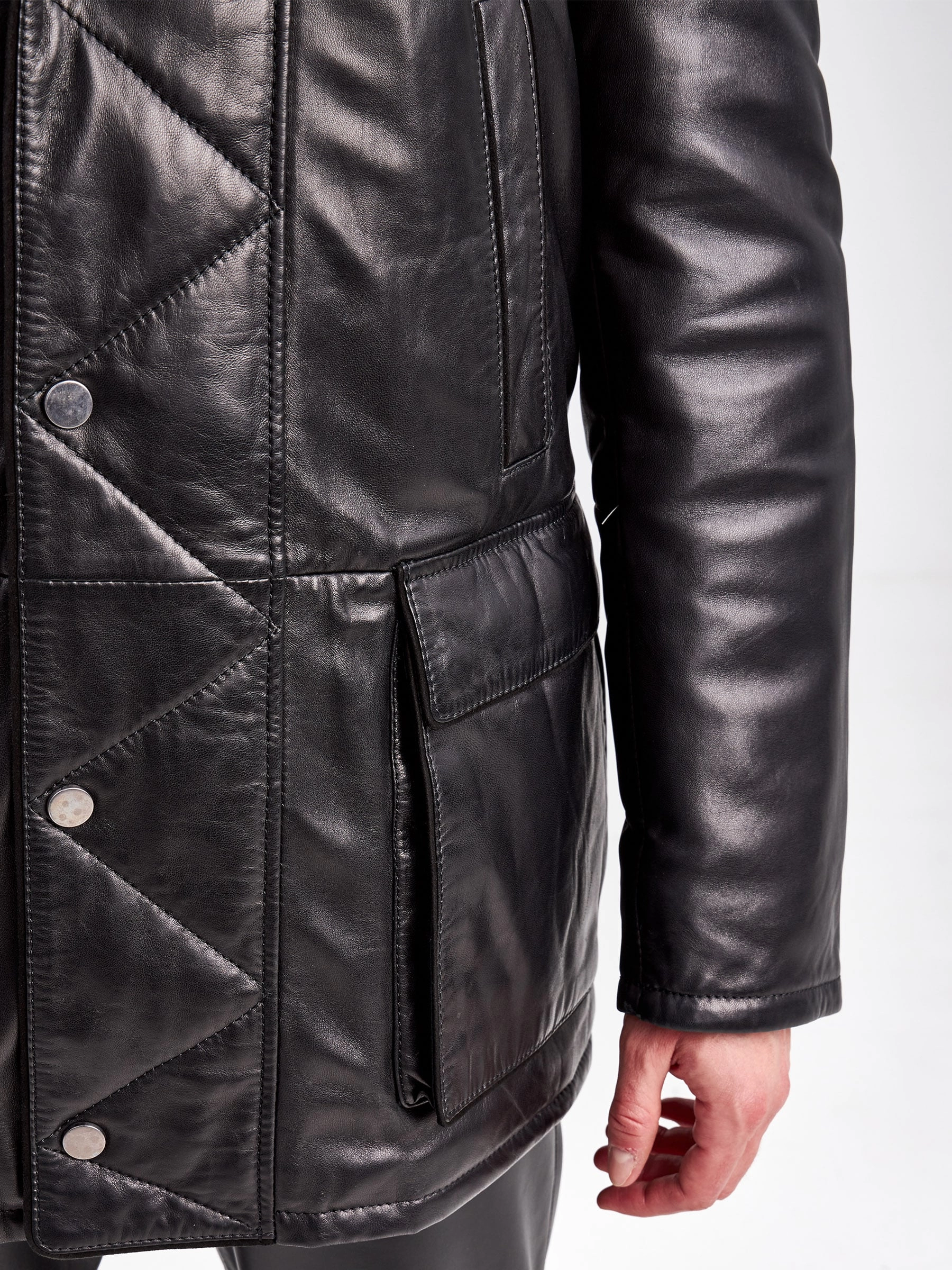 Кожаная утепленная куртка аляска с капюшоном и мехом енота для мужчин 5471, черная, размер 48, артикул 40980