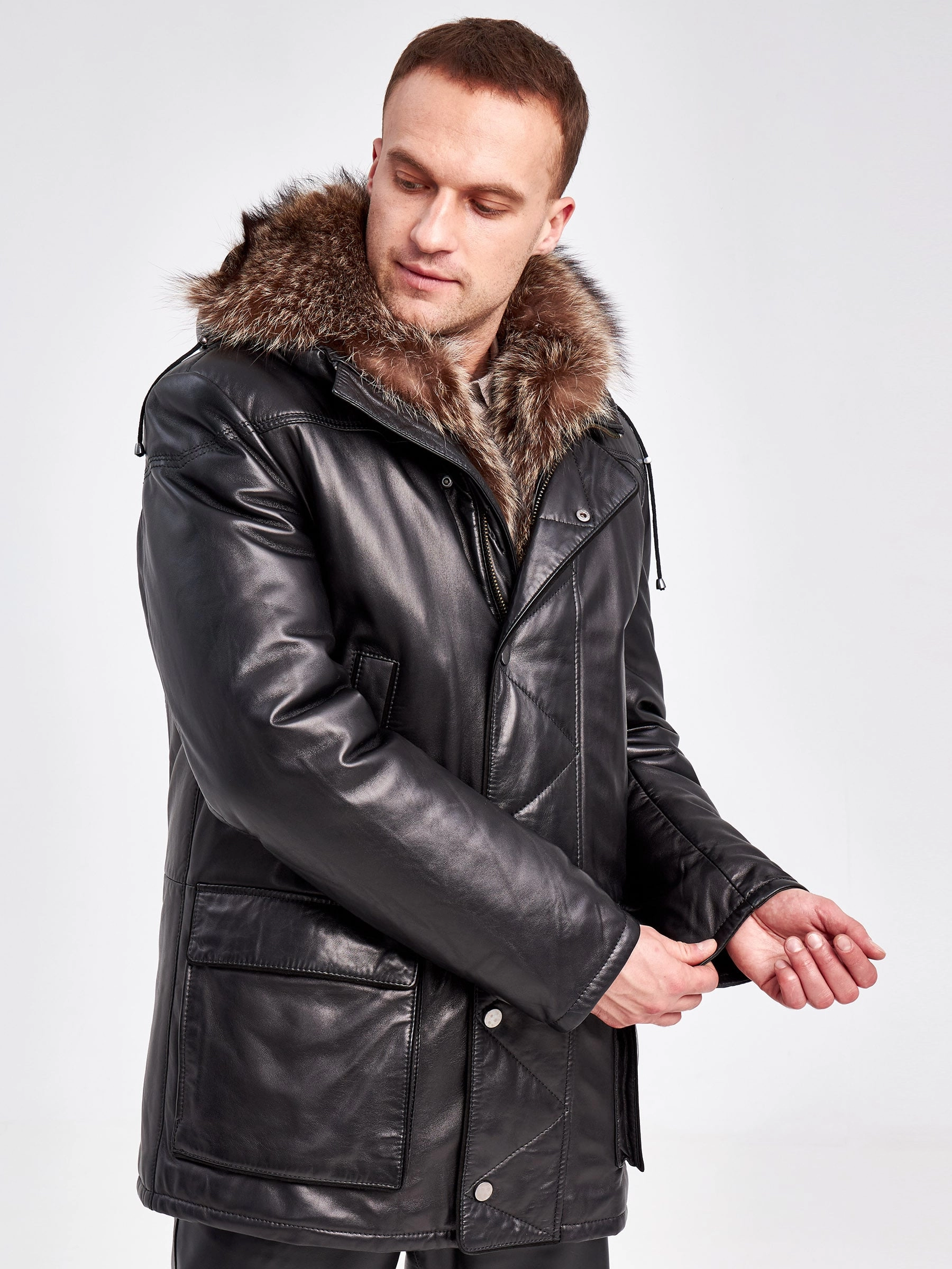 Товар кожаная утепленная куртка аляска с капюшоном и мехом енота для мужчин 5471, черная, размер 48, артикул 40980 выполнен из натуральной кожи с застежкой молния. Рассчитан на сезон: зима. Длина изделия 75-90 см, силуэт прямой.