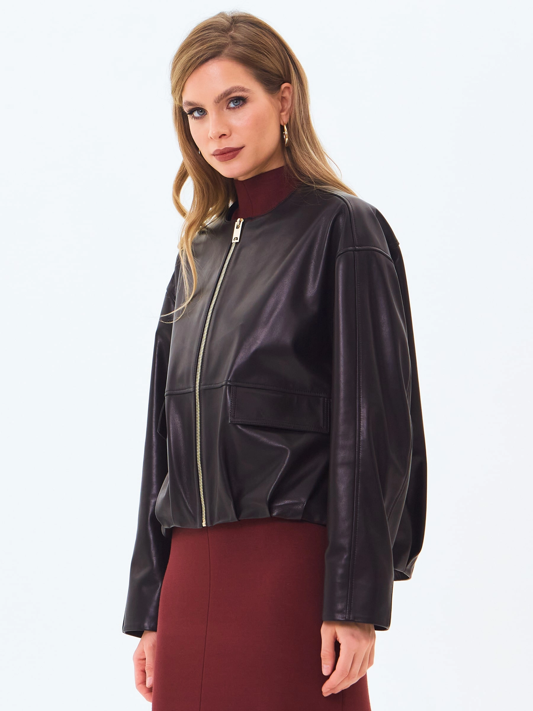 Короткую куртку бомбер с круглым воротом выполнили из тонкой гладкой кожи премиум класс. Модель свободного кроя и двумя накладными карманами с клапанами застегивается молнией.