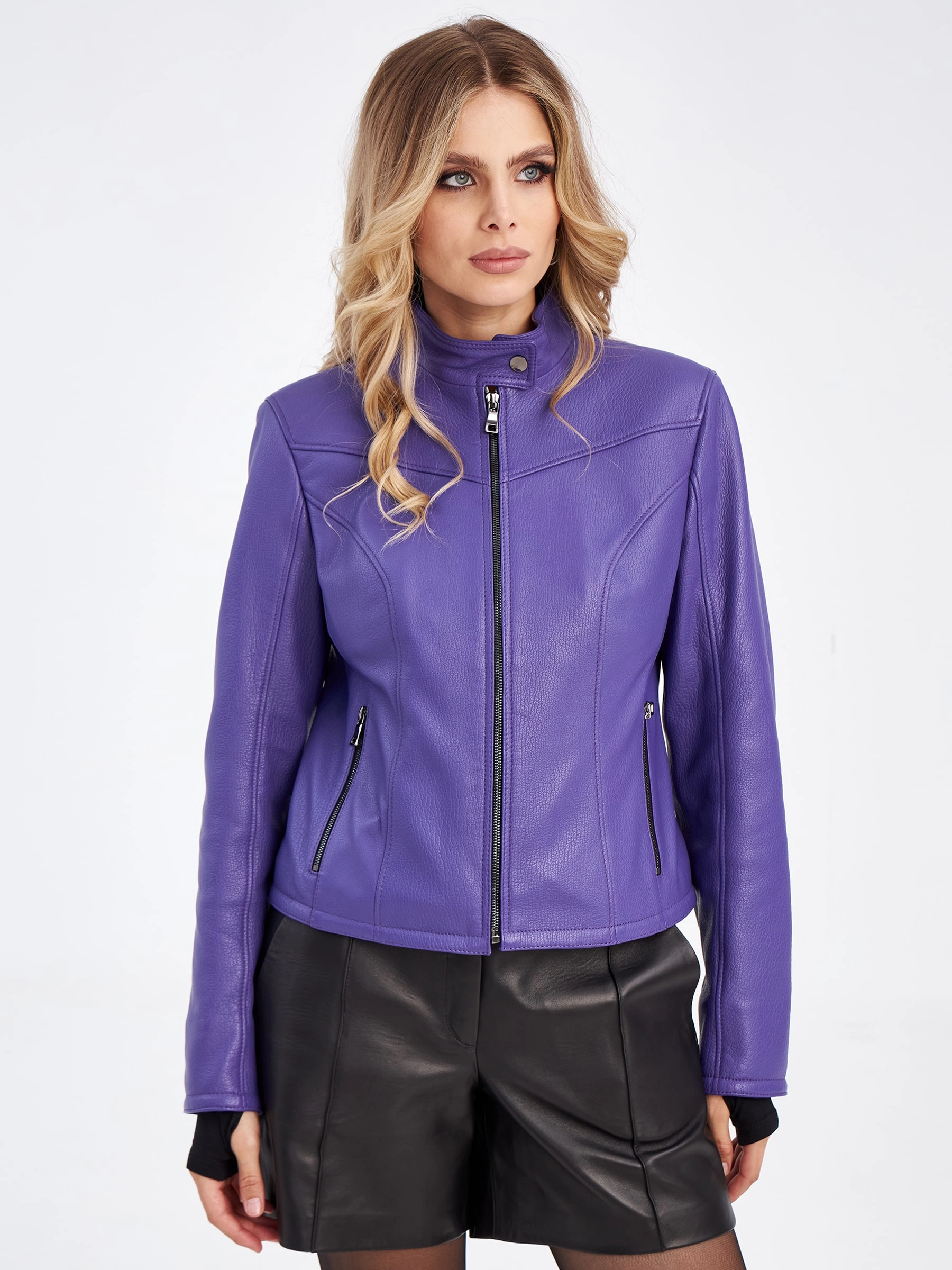 Товар женская кожаная куртка премиум класса 3045, фиолетовая, размер 46, артикул 23300 выполнен из натуральной кожи с застежкой молния. Рассчитан на сезон: весна-осень. Длина изделия 51 см, силуэт приталенный .