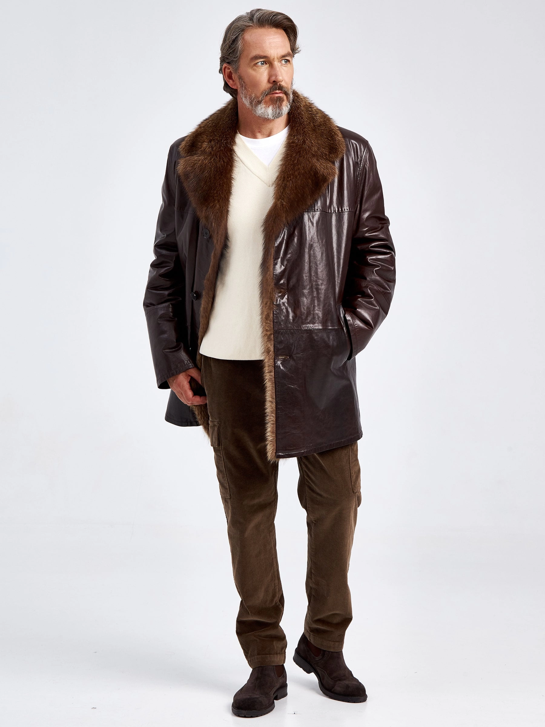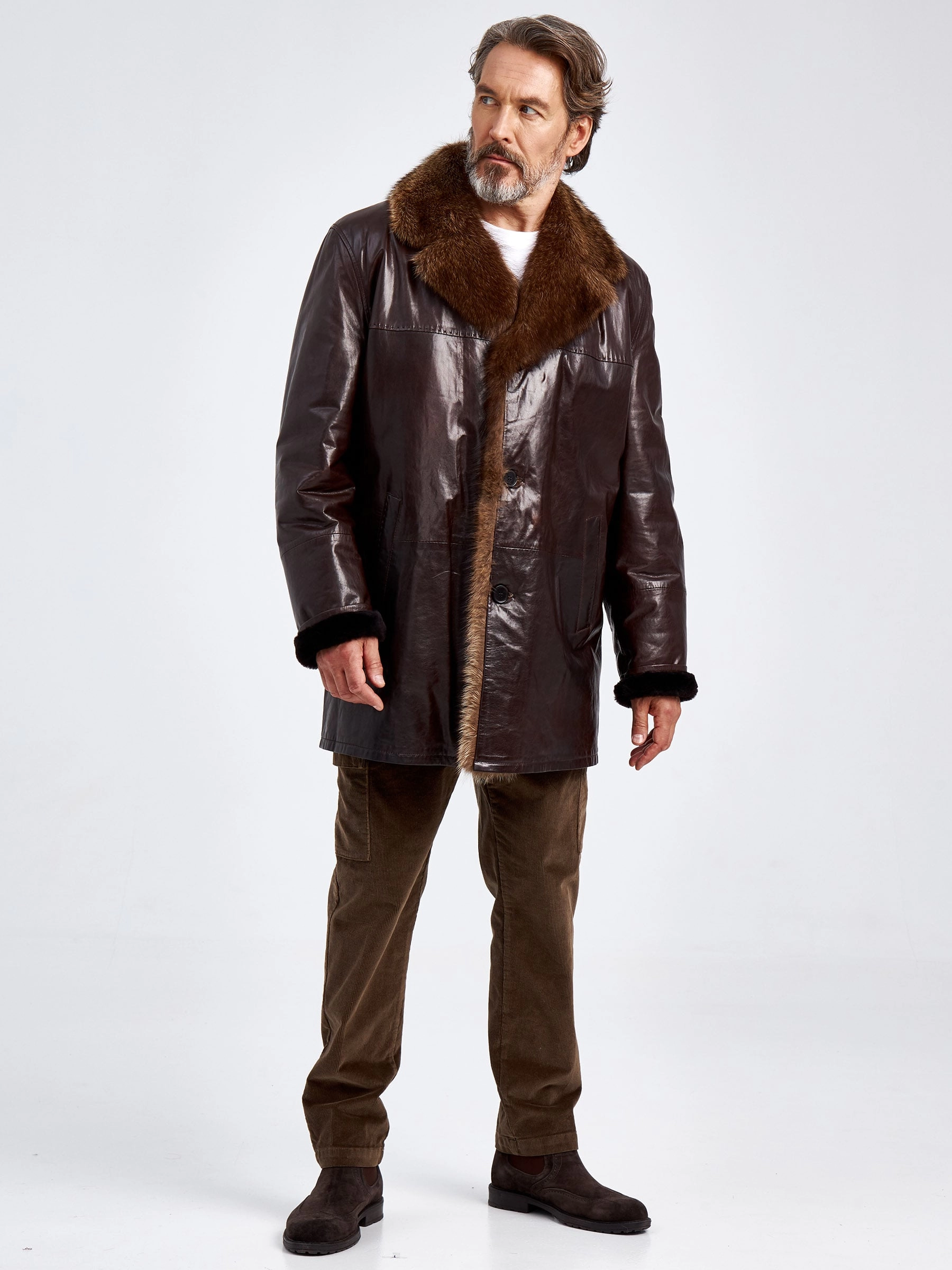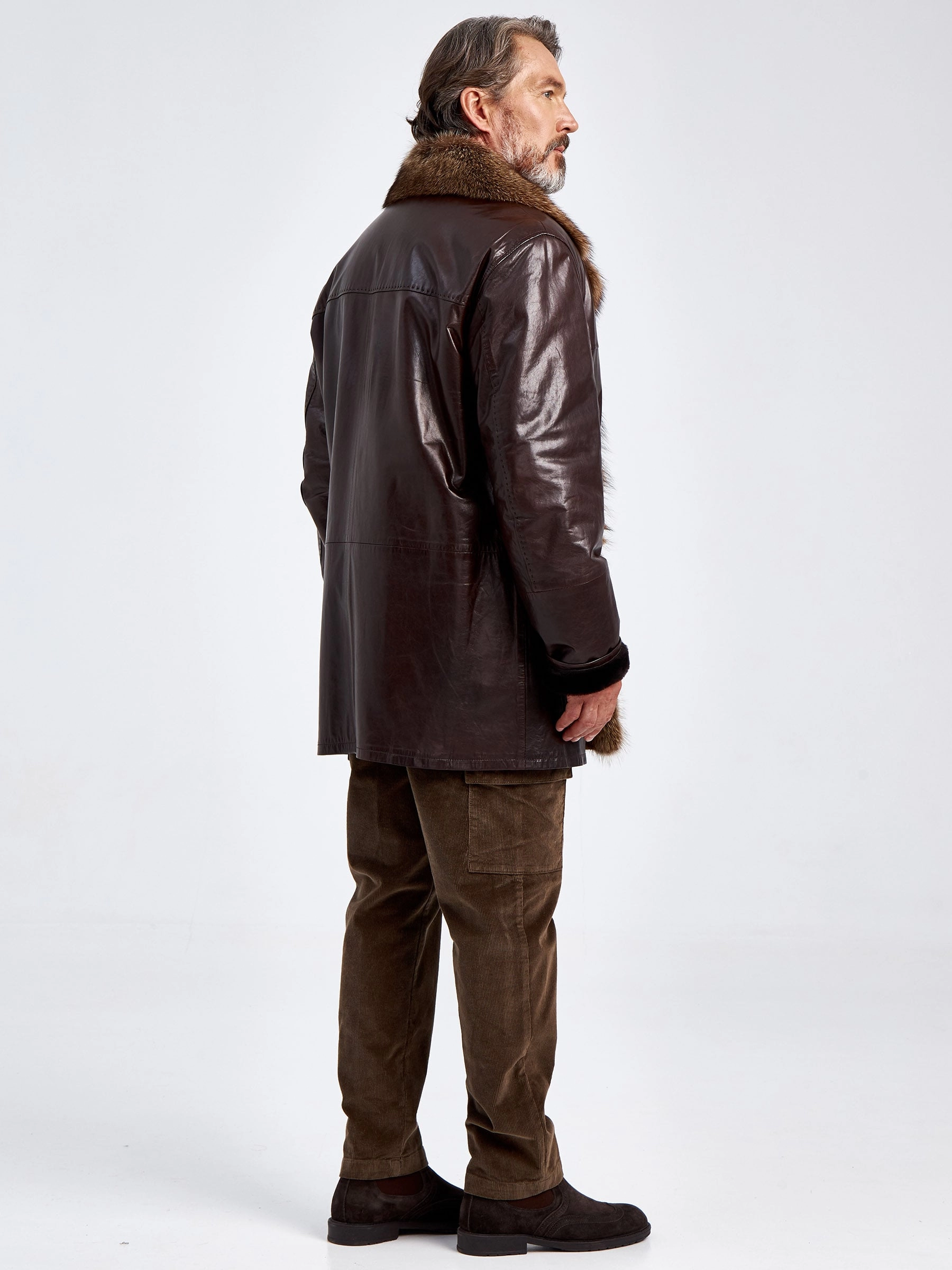 Товар кожаное мужское зимнее полупальто с воротником меха соболя премиум класса 5140, коричневое, размер 56, артикул 40580 выполнен из натуральной кожи с застежкой пуговицы. Рассчитан на сезон: осень-зима. Длина изделия 87 см, силуэт прямой.